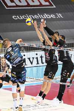 Roberto Bartomeoli/LM - Cucine Lube Civitanova vs Sir Safety Conad Perugia - Volleyball Italian Serie A Men Superleague Championship 2020/2021 03 February 2021 - Eurosuole Forum, civitanova marche, Italy Photo showing: Spike of Kamil Rychlicki (Cucine Lube Civitanova) Block of Thijs Ter Horst (Sir Safety Conad Perugia) and Roberto Russo (Sir Safety Conad Perugia) @LM/Roberto Bartomeoli/ AGENZIA ALDO LIVERANI SAS