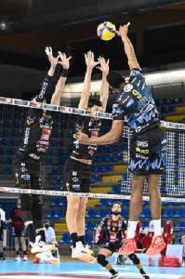 Roberto Bartomeoli/LM - Cucine Lube Civitanova vs Sir Safety Conad Perugia - Volleyball Italian Serie A Men Superleague Championship 2020/2021 03 February 2021 - Eurosuole Forum, civitanova marche, Italy Photo showing: Spike of Wilfredo Leon Venero (Sir Safety Conad Perugia) Block of Simone Anzani (Cucine Lube Civitanova) and Kamil Rychlicki (Cucine Lube Civitanova) @LM/Roberto Bartomeoli/ AGENZIA ALDO LIVERANI SAS