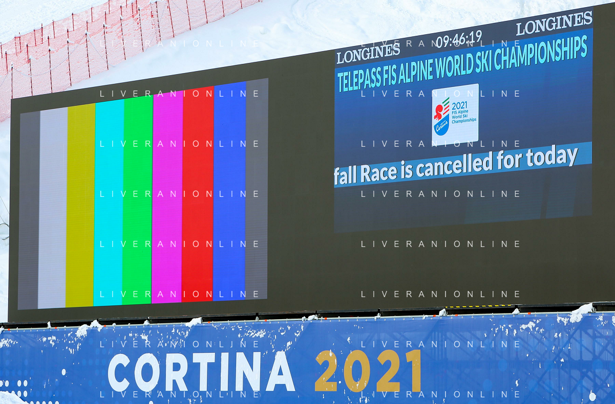 Luca Tedeschi/LM - 2021 FIS Alpine World SKI Championships - Alpine Combined - Women - alpine ski race 08 February 2021 - Olympia delle Tofane, cortina (bl), Italy Photo showing: Sign in Cortina d'Ampezzo where the Alpine Combined women race is cancelled due to snowfall @LM/Luca Tedeschi AG ALDO LIVERANI SAS
