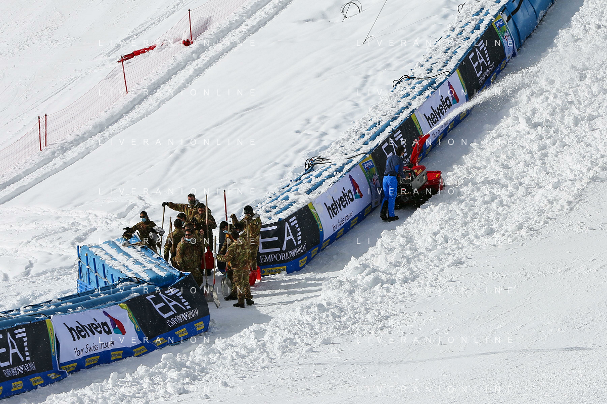 Luca Tedeschi/LM - 2021 FIS Alpine World SKI Championships - Alpine Combined - Women - alpine ski race 08 February 2021 - Olympia delle Tofane, cortina (bl), Italy Photo showing: Also army employed in Cortina d'Ampezzo finish area where the Alpine Combined women race is cancelled due to snowfall @LM/Luca Tedeschi AG ALDO LIVERANI SAS
