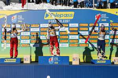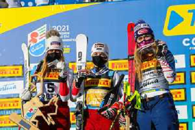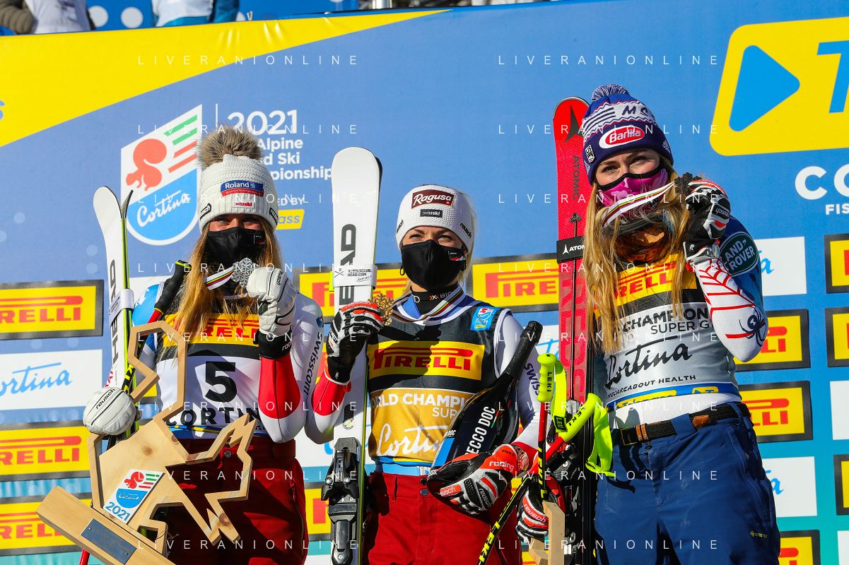 Luca Tedeschi/LM - 2021 FIS Alpine World SKI Championships - Super G - Women - alpine ski race 11 February 2021 - Olympia delle Tofane, cortina (bl), Italy Photo showing: Women's SG podium with Lara GUT-BEHRAMI (SUI), Corinne SUTER (SUI) and Mikaela SHIFFRIN (USA) @LM/Luca Tedeschi AG ALDO LIVERANI SAS
