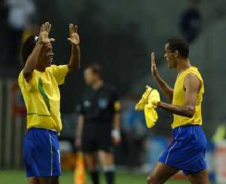 MONDIALI DI CALCIO KOBE (GIAPPONE) 17/06/2002 COREA E GIAPPONE BRASILE BELGIO NELLA FOTO RIVALDO E RONALDINHO ESULTANZA FOTO ALDO LIVERANI