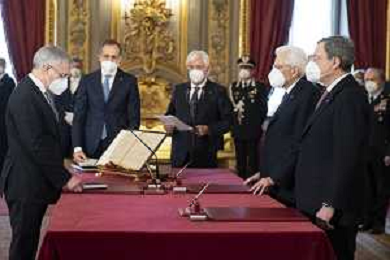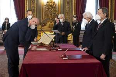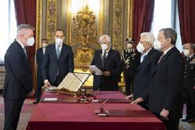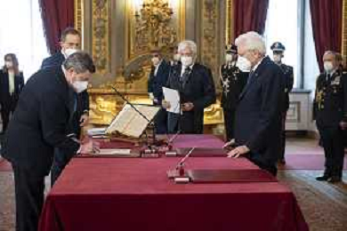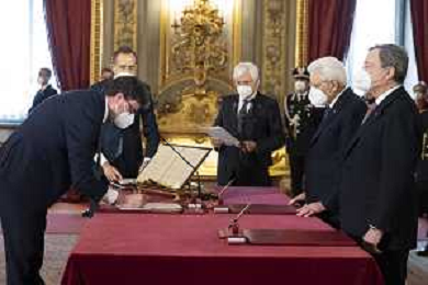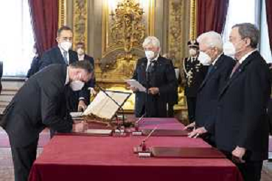 Il Presidente della Repubblica Sergio Mattarella e il Presidente del Consiglio Mario Draghi durante il giuramento dell'Onorevole Massimo Garavaglia, al quale è conferito l’incarico per il coordinamento di iniziative nel settore del turismo, e che sarà preposto al nuovo Ministero del turismo, con portafoglio (foto di Francesco Ammendola - Ufficio per la Stampa e la Comunicazione della Presidenza della Repubblica) AG ALDO LIVERANI SAS