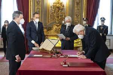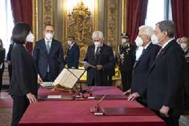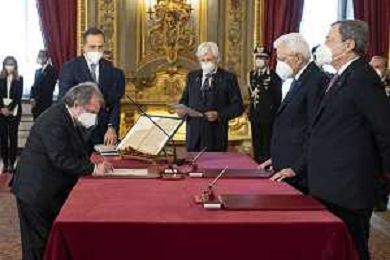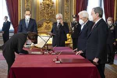 Il Presidente della Repubblica Sergio Mattarella e il Presidente del Consiglio Mario Draghi durante il giuramento del Ministro della giustizia: Professoressa Marta Cartabia (foto di Francesco Ammendola - Ufficio per la Stampa e la Comunicazione della Presidenza della Repubblica) AG ALDO LIVERANI SAS