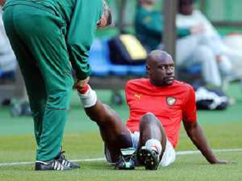MONDIALI CALCIO STADIO DI NIIGATA (GIAPPONE) 31/05/2002 ALLENAMENTO DELLA NAZIONALE DEL CAMERUN NELLA FOTO PATRICK 'MBOMA RICEVE LE CURE DEL MASSAGGIATORE PRIMA DI SOSTENERE L'ALLENAMENTO AGENZIA ALDO LIVERANI SAS