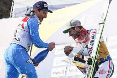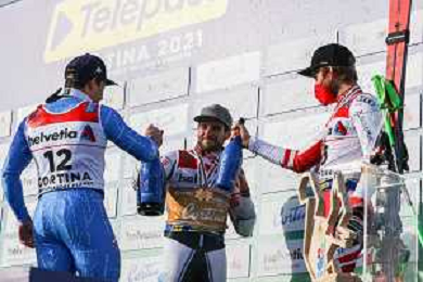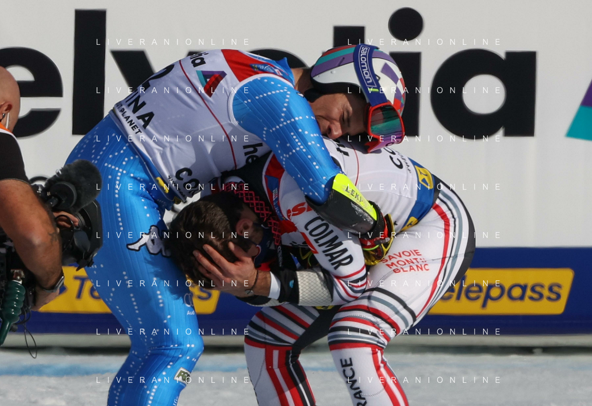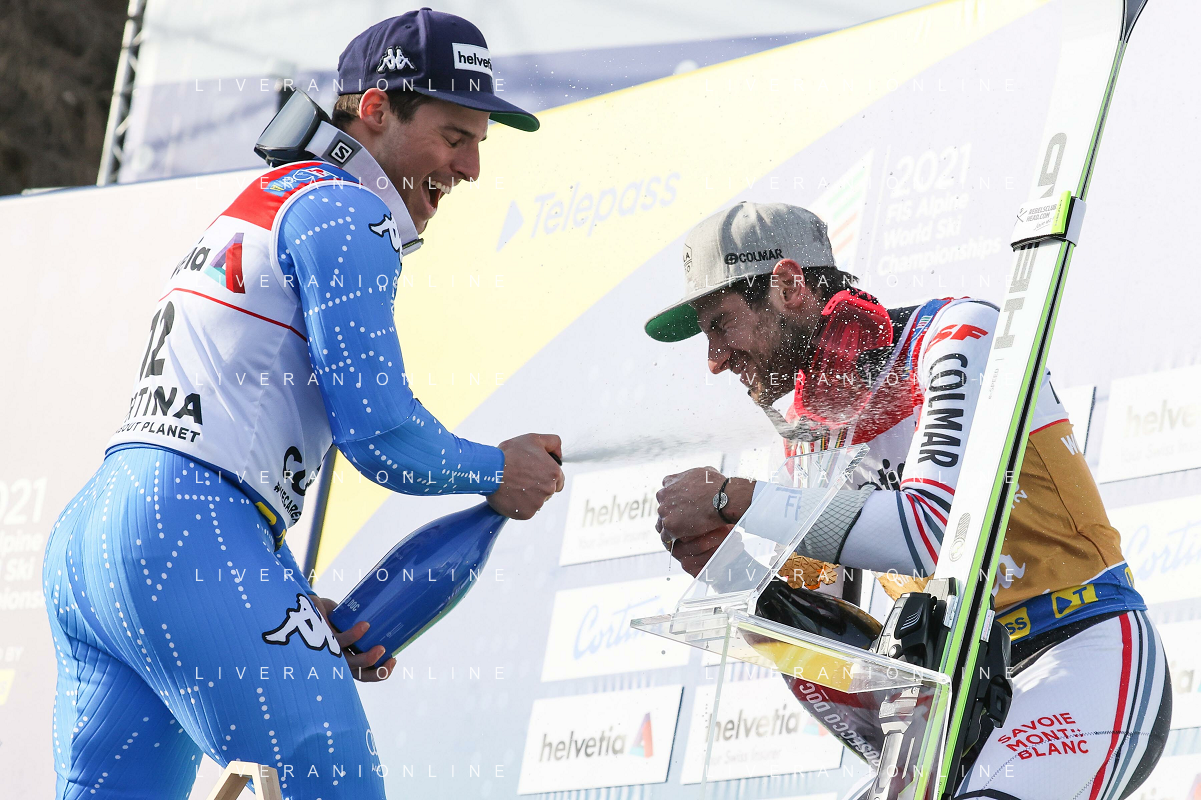 Luca Tedeschi/LM - 2021 FIS Alpine World SKI Championships - Giant Slalom - Men - alpine ski race 19 February 2021 - Labirinti, cortina (bl), Italy Photo showing: Podium celebration of the men's GS in Cortina d'Ampezzo with Mathieu FAIVRE (FRA) and Luca de ALIPRANDINI (ITA) @LM/Luca Tedeschi AG ALDO LIVERANI SAS
