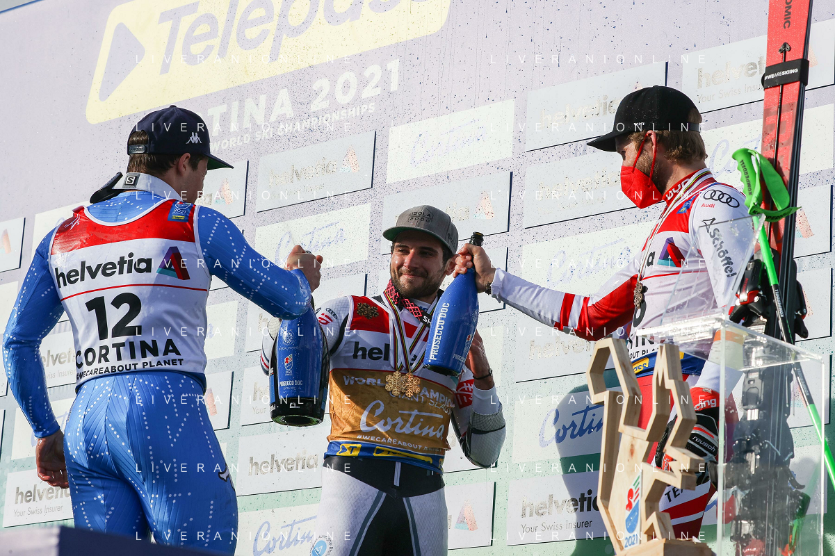 Luca Tedeschi/LM - 2021 FIS Alpine World SKI Championships - Giant Slalom - Men - alpine ski race 19 February 2021 - Labirinti, cortina (bl), Italy Photo showing: Podium celebration of the men's GS in Cortina d'Ampezzo with Mathieu FAIVRE (FRA), Luca de ALIPRANDINI (ITA) and Marco SCHWARZ (AUT) @LM/Luca Tedeschi AG ALDO LIVERANI SAS