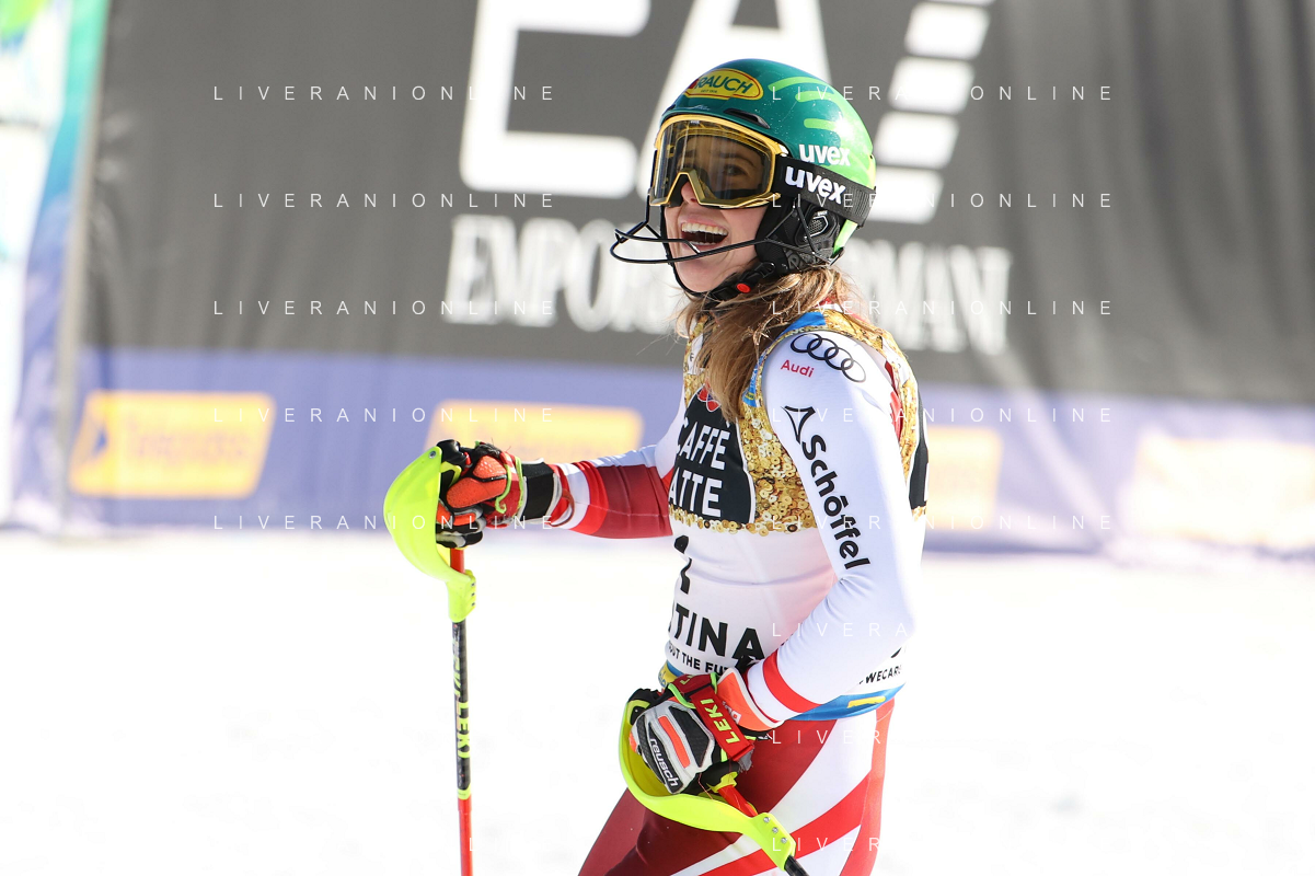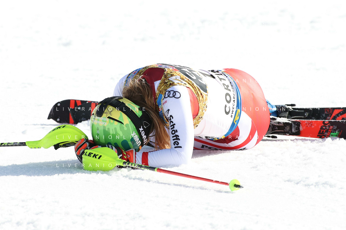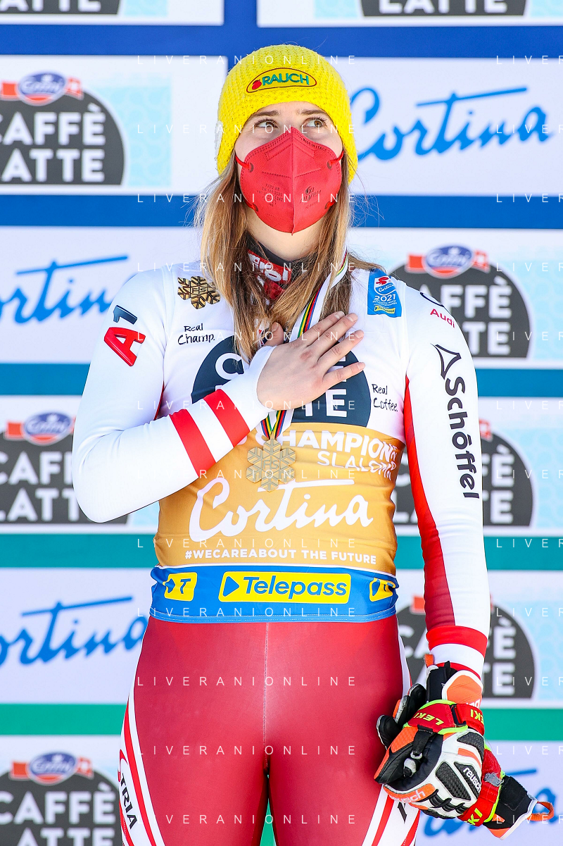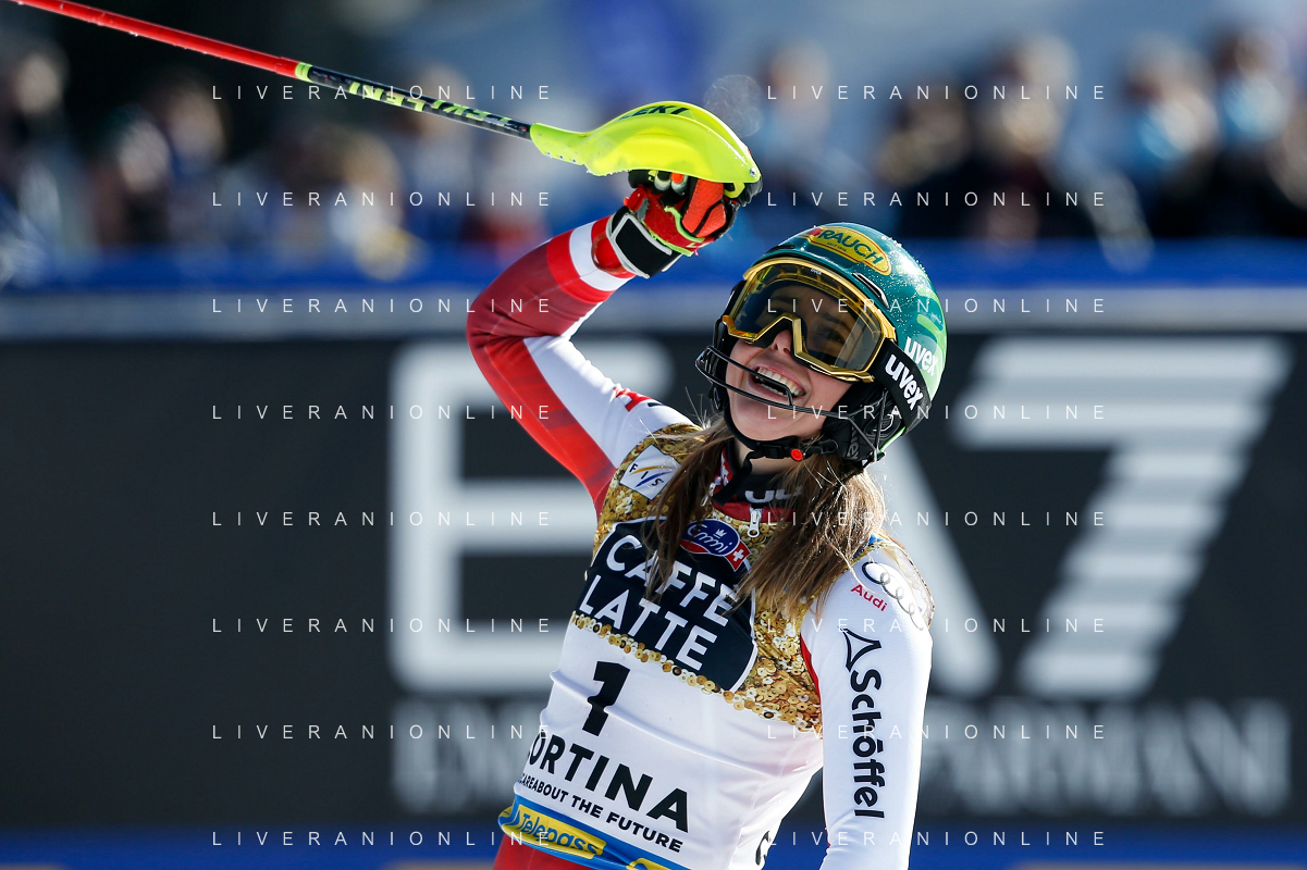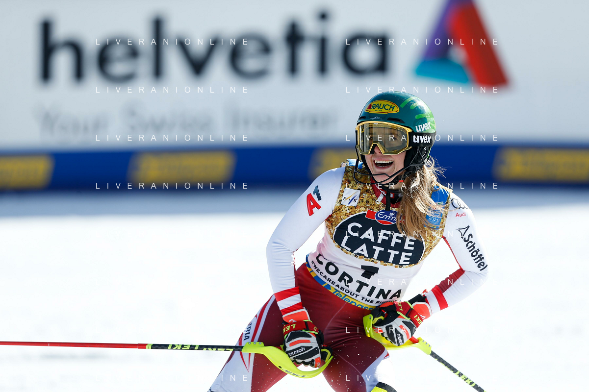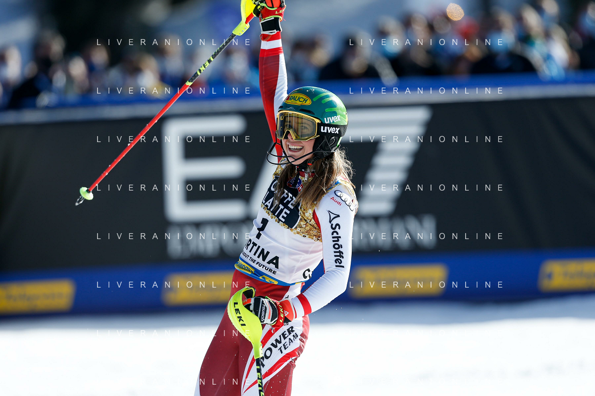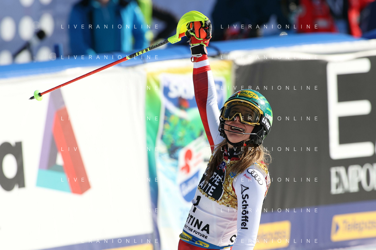 Francesco Scaccianoce/LM - 2021 FIS Alpine World SKI Championships - Slalom - Women - alpine ski race 20 February 2021 - Druscie, cortina (bl), Italy Photo showing: Katharina Liensberger (AUT) finishes in 1st position and wins the gold medal in Slalom @LM/Francesco Scaccianoce AG ALDO LIVERANI SAS