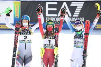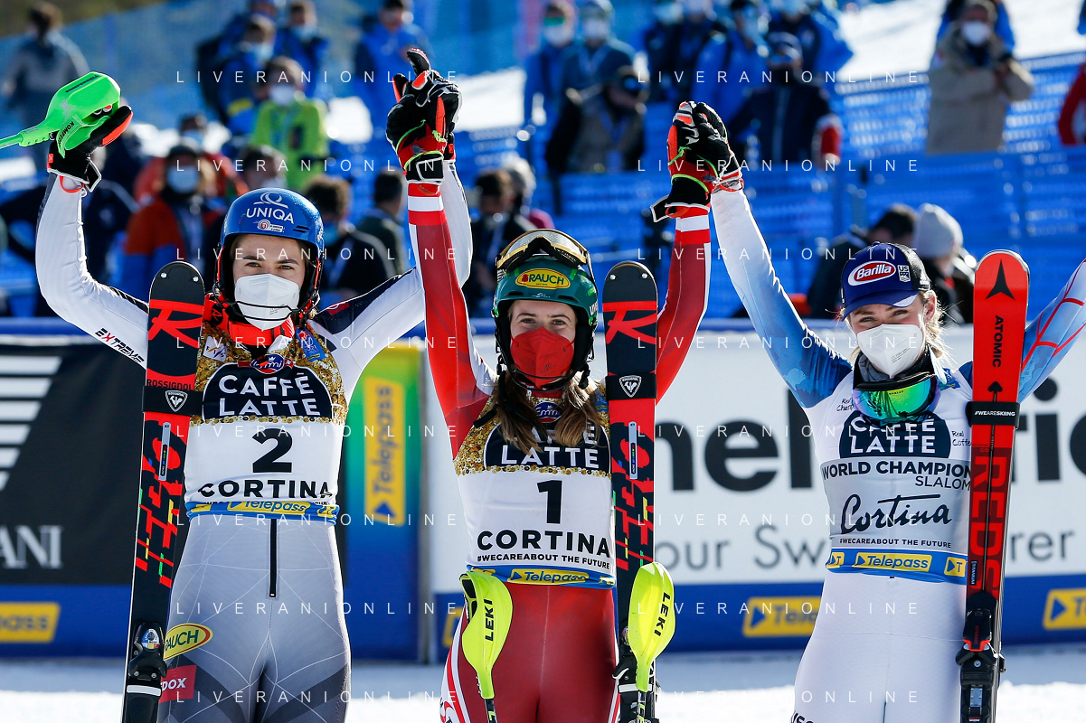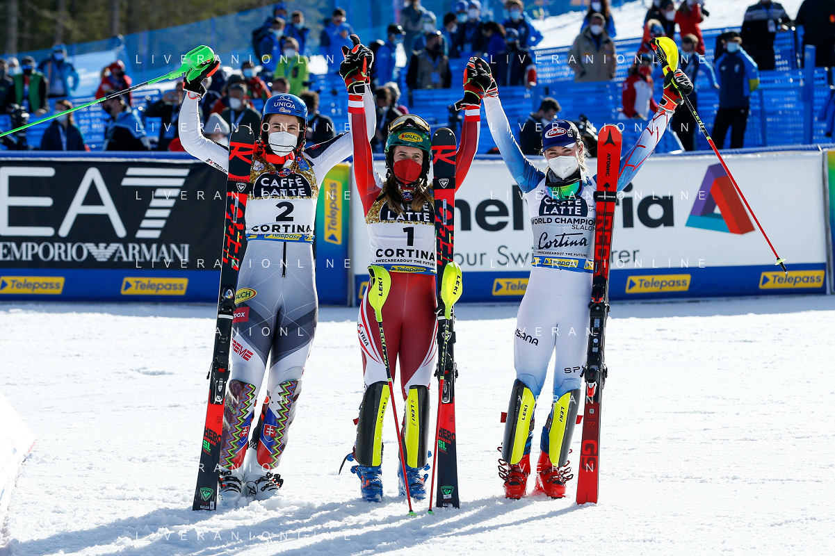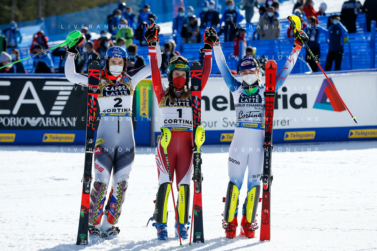 Francesco Scaccianoce/LM - 2021 FIS Alpine World SKI Championships - Slalom - Women - alpine ski race 20 February 2021 - Druscie, cortina (bl), Italy Photo showing: The podium: Petra Vlhova (SVK), Katharina Liensberger (AUT) and Mikaela Shiffrin (USA) @LM/Francesco Scaccianoce AG ALDO LIVERANI SAS
