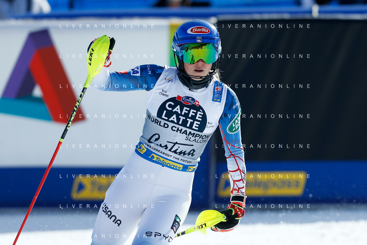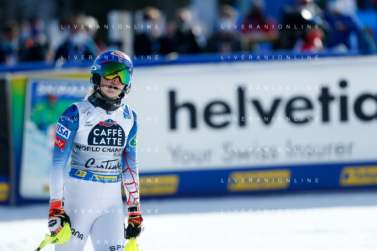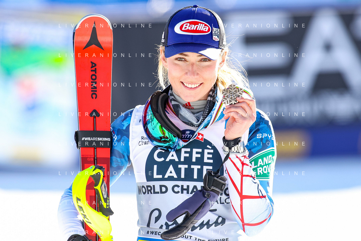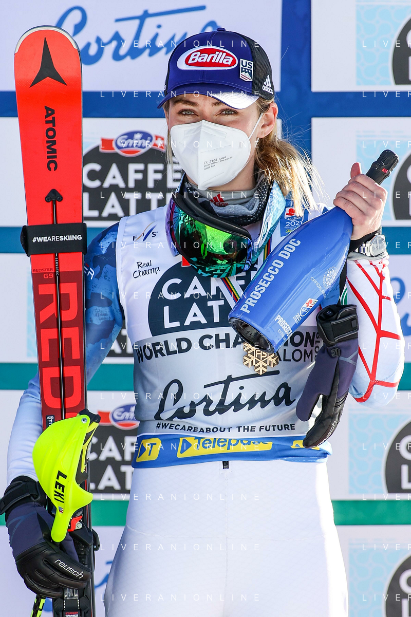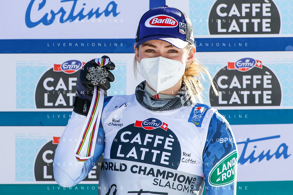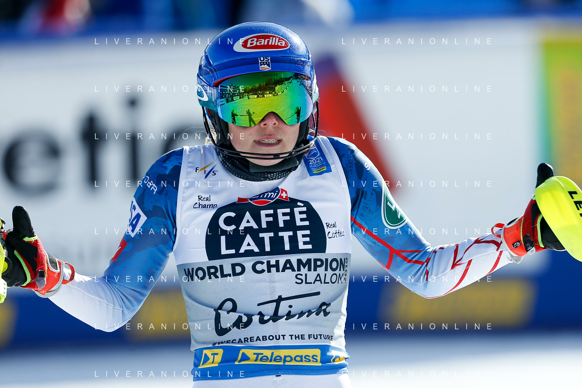 Francesco Scaccianoce/LM - 2021 FIS Alpine World SKI Championships - Slalom - Women - alpine ski race 20 February 2021 - Druscie, cortina (bl), Italy Photo showing: Mikaela Shiffrin (USA) finishes in 3rd position and wins the bronze medal @LM/Francesco Scaccianoce AG ALDO LIVERANI SAS