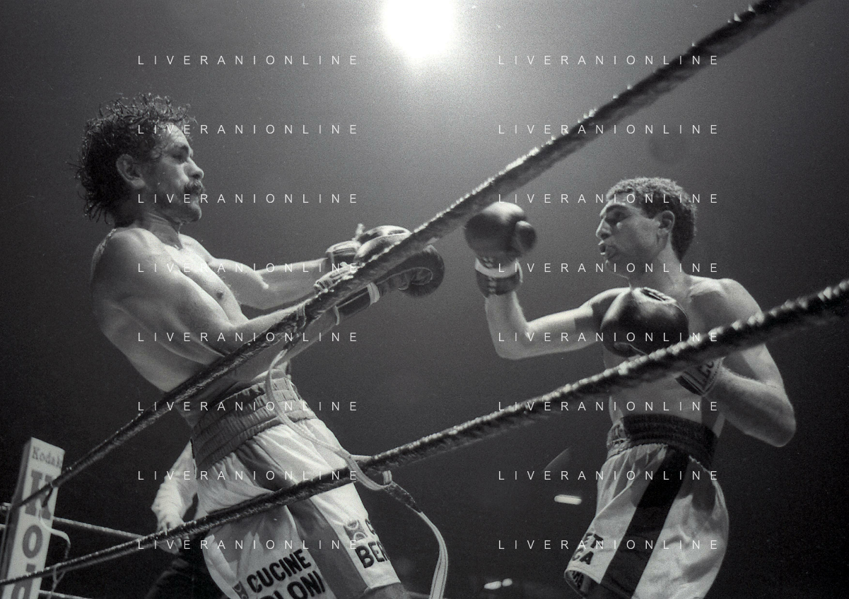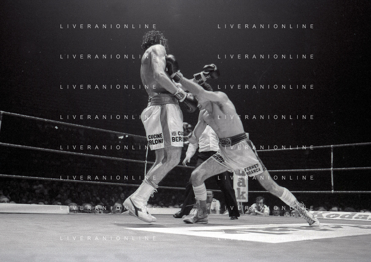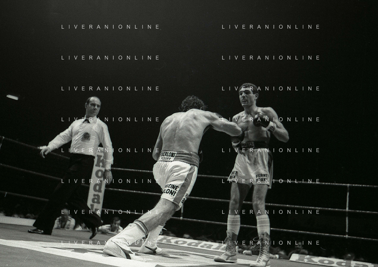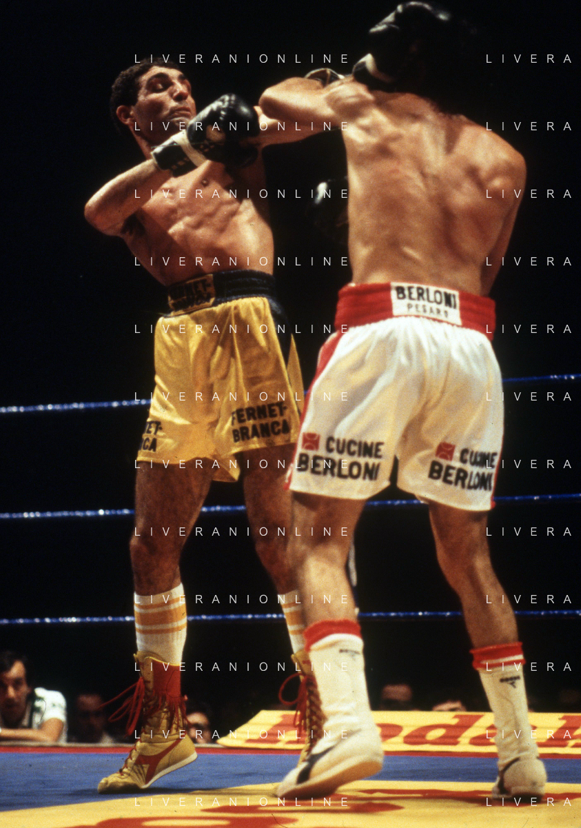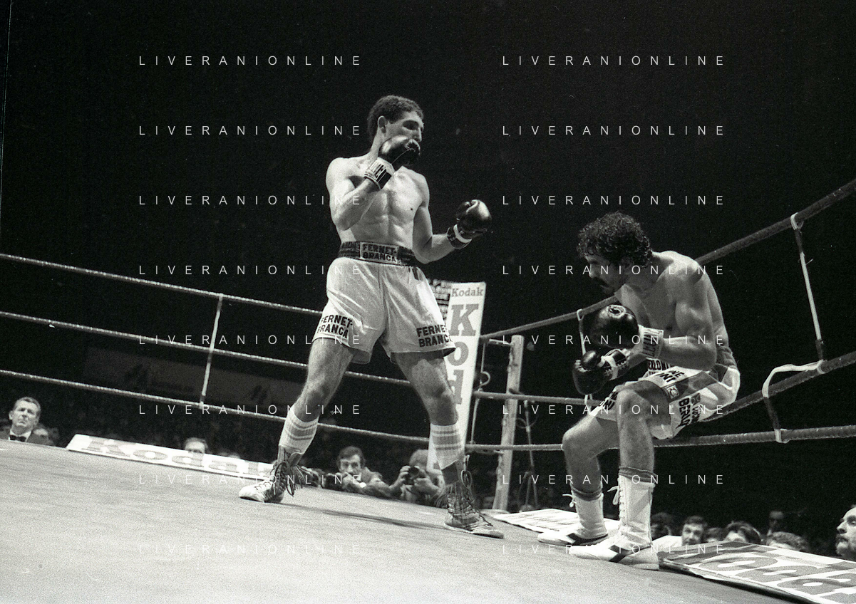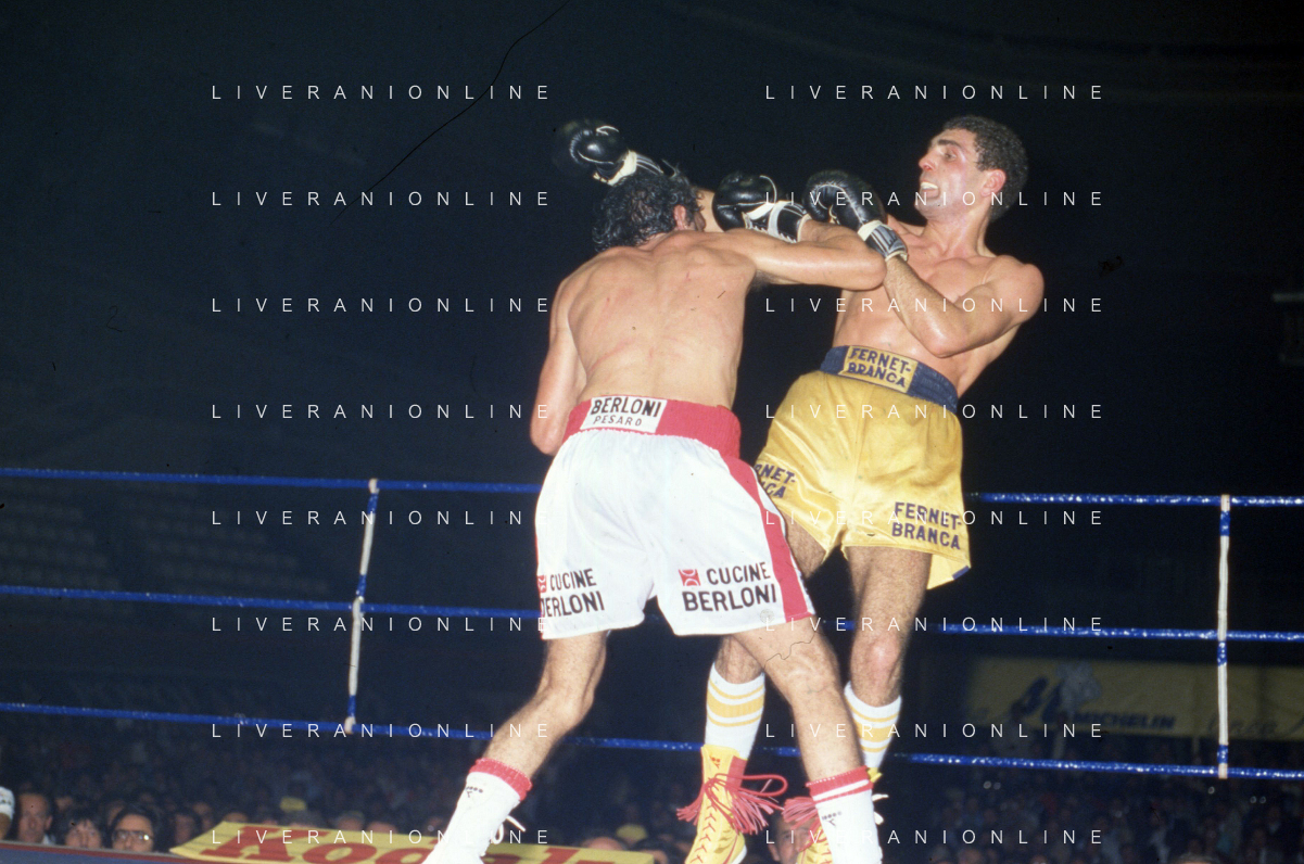 14-10-1983 MILANO CAMPIONATO EUROPEO DI PUGILATO INCONTRO TRA PATRIZIO OLIVA E JUAN JOSE' GIMENEZ NELLA FOTO L'INCONTRO DI BOXE PATRIZIO OLIVA E JUAN JOSE' GIMENEZ AG ALDO LIVERANI SAS