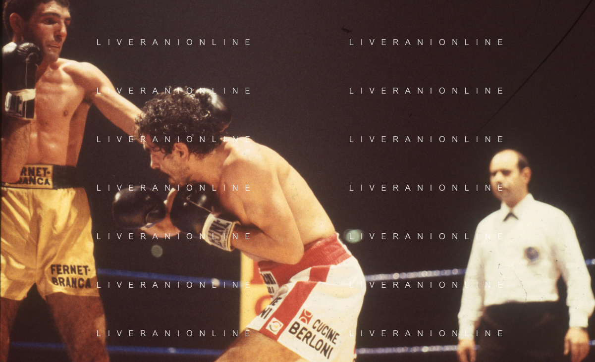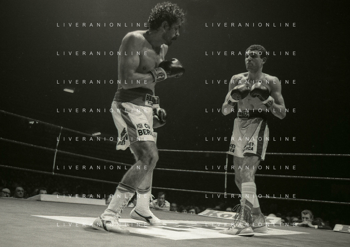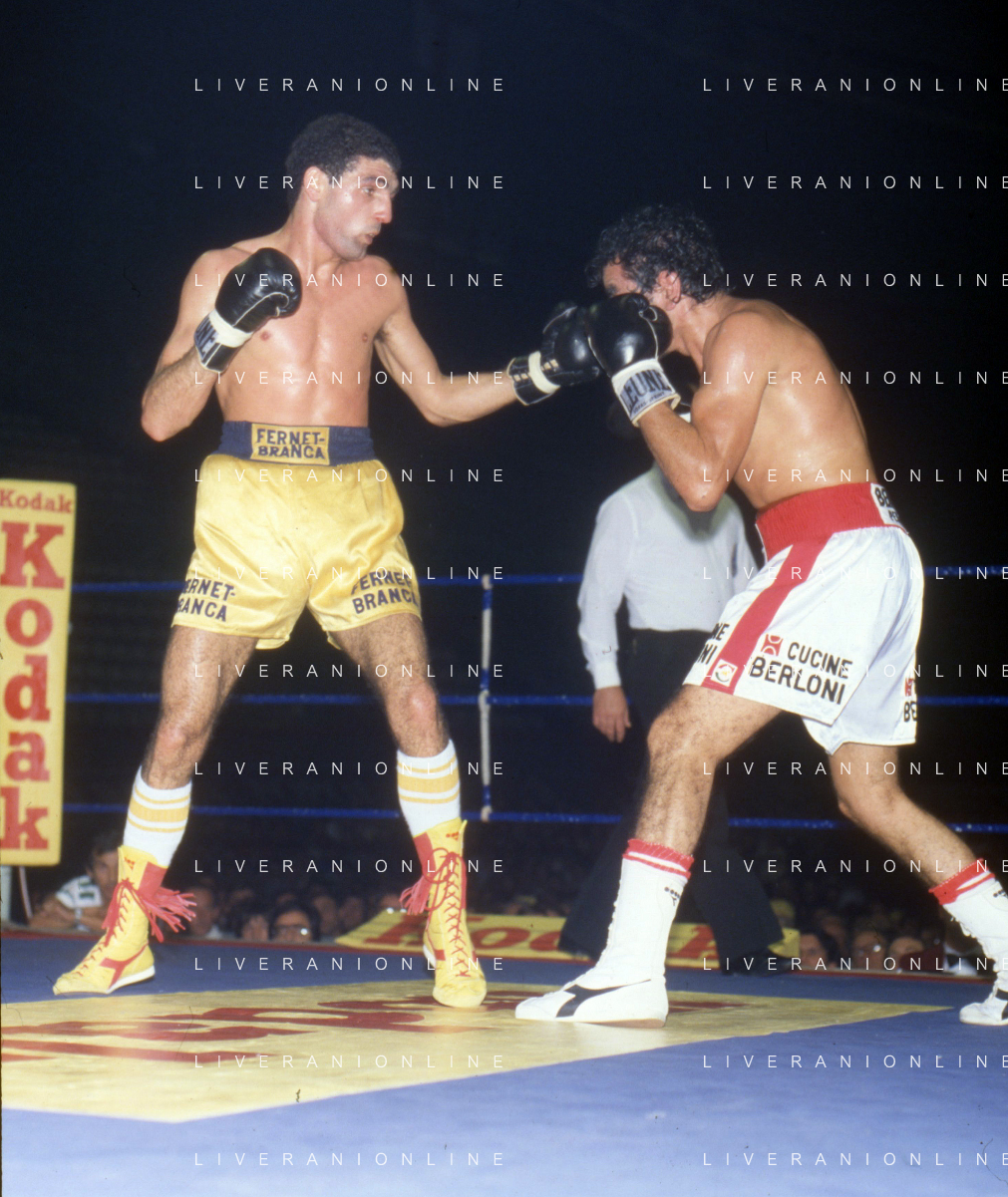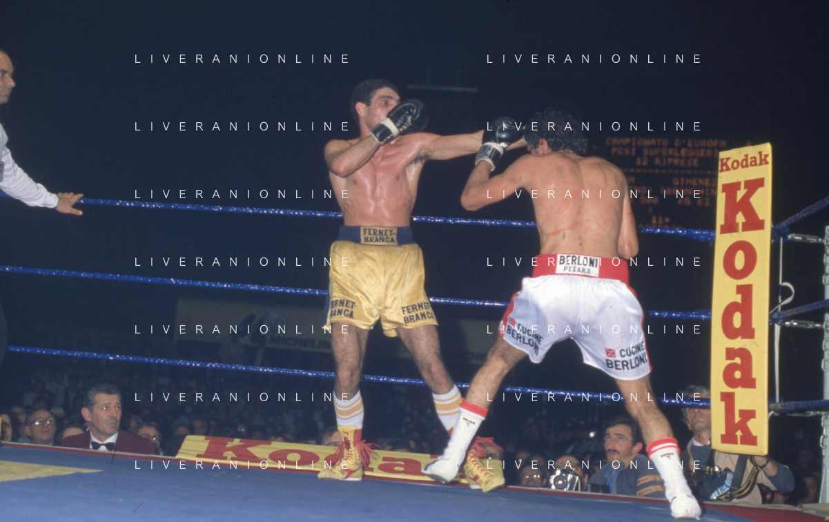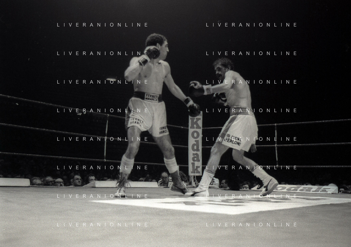 14-10-1983 MILANO CAMPIONATO EUROPEO DI PUGILATO INCONTRO TRA PATRIZIO OLIVA E JUAN JOSE' GIMENEZ NELLA FOTO L'INCONTRO DI BOXE PATRIZIO OLIVA E JUAN JOSE' GIMENEZ AG ALDO LIVERANI SAS