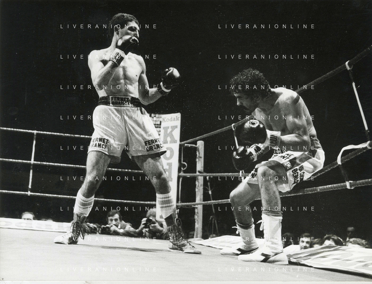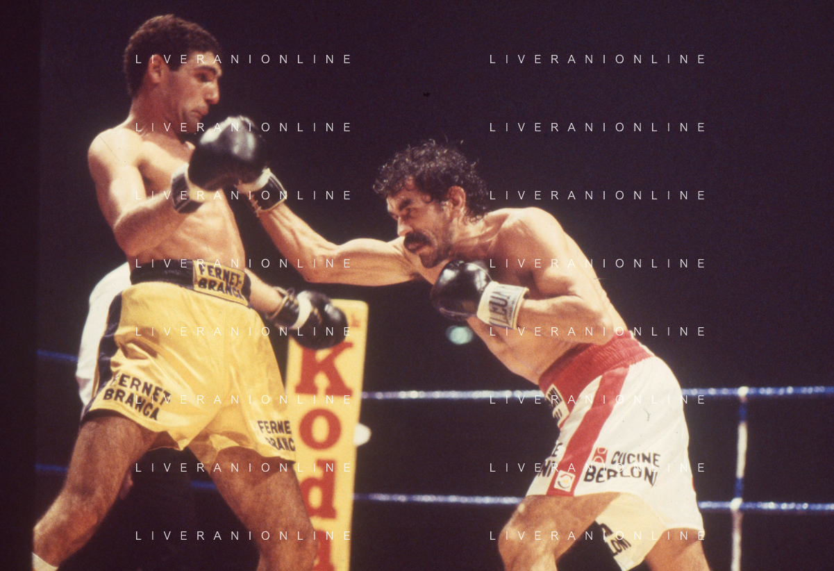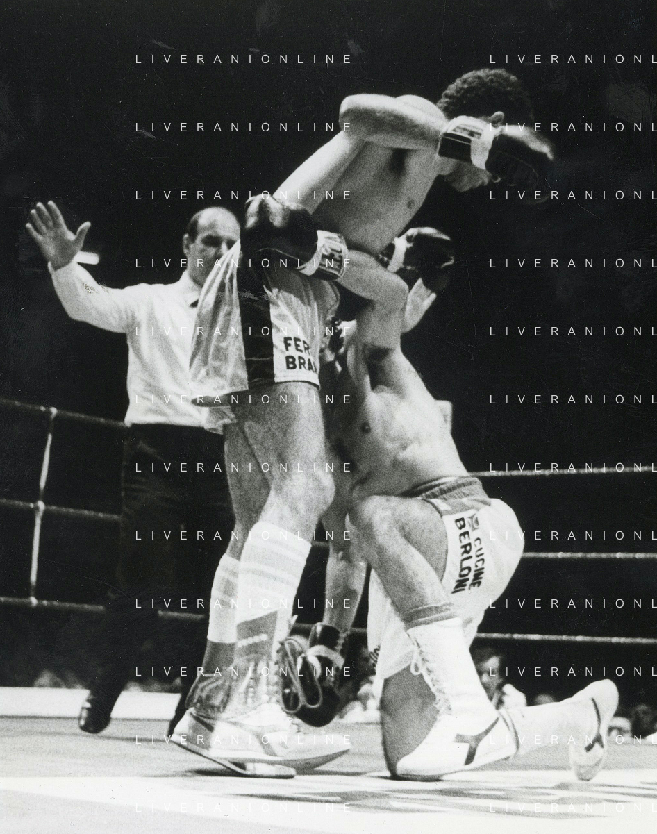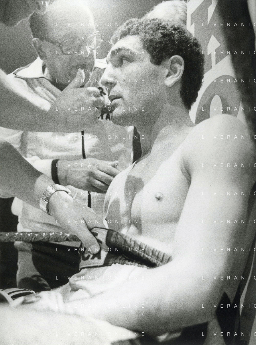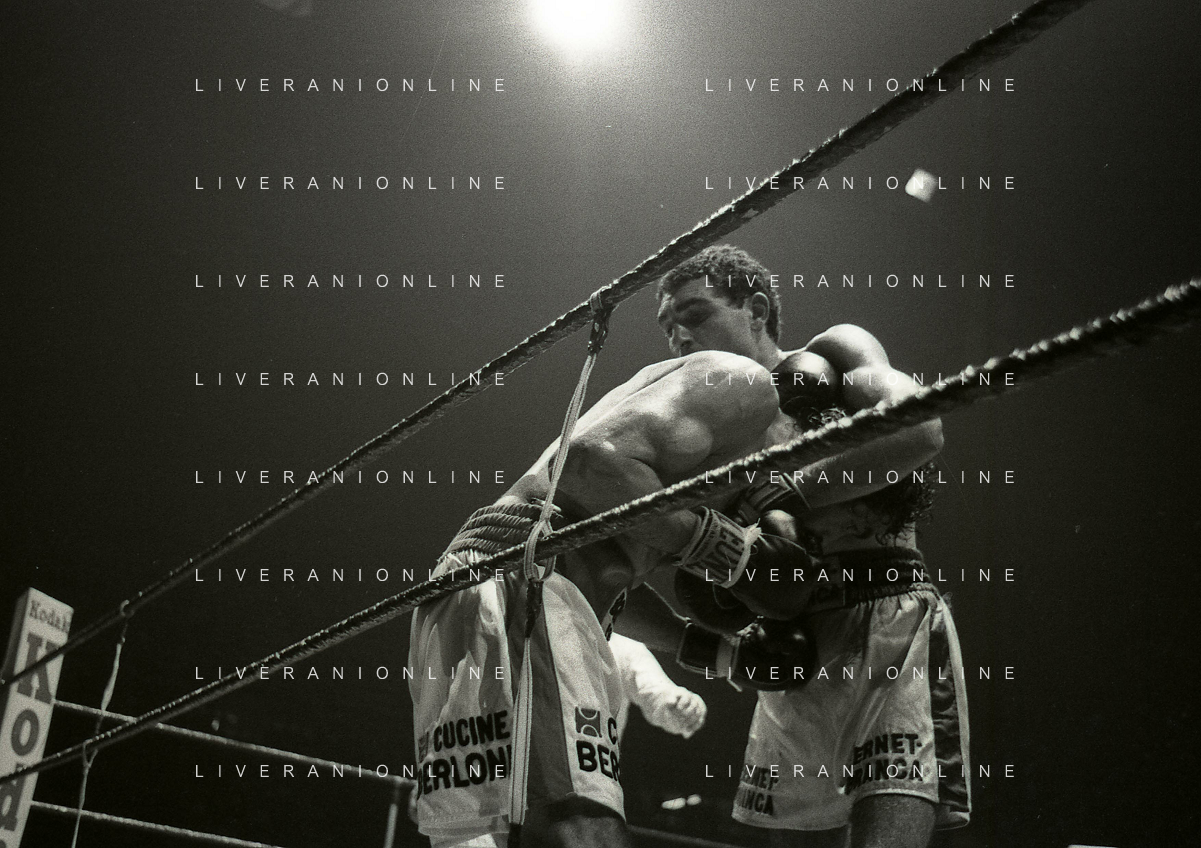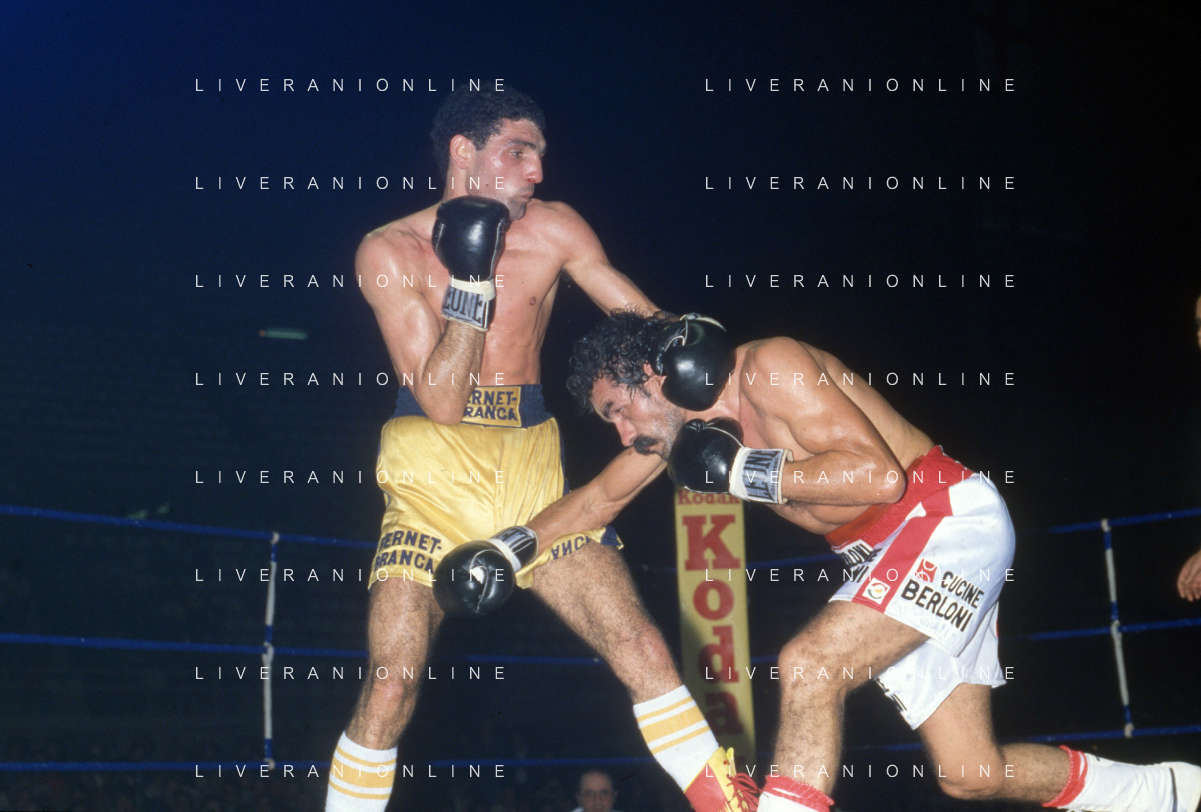 14-10-1983 MILANO CAMPIONATO EUROPEO DI PUGILATO INCONTRO TRA PATRIZIO OLIVA E JUAN JOSE' GIMENEZ NELLA FOTO L'INCONTRO DI BOXE PATRIZIO OLIVA E JUAN JOSE' GIMENEZ AG ALDO LIVERANI SAS