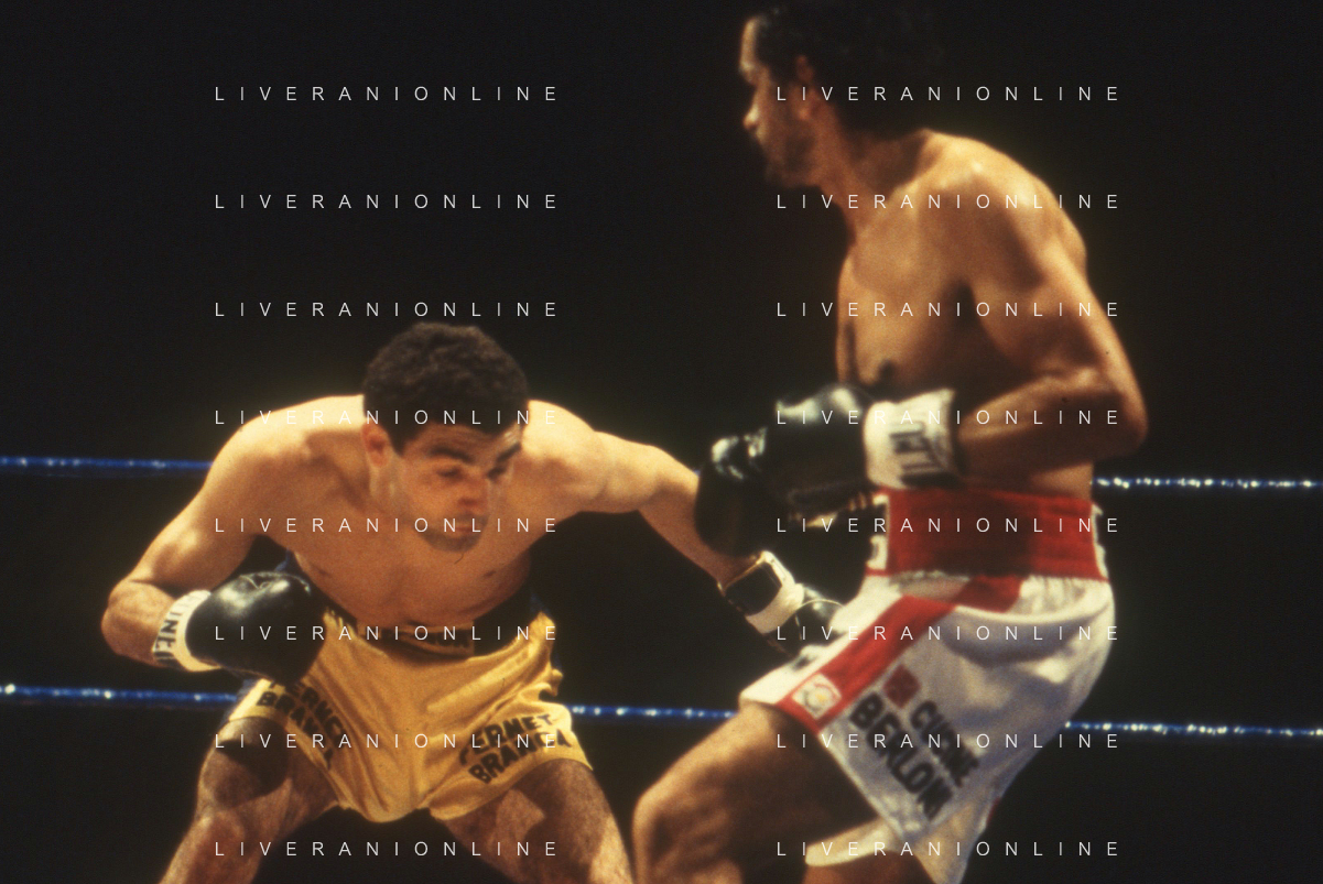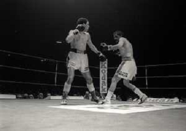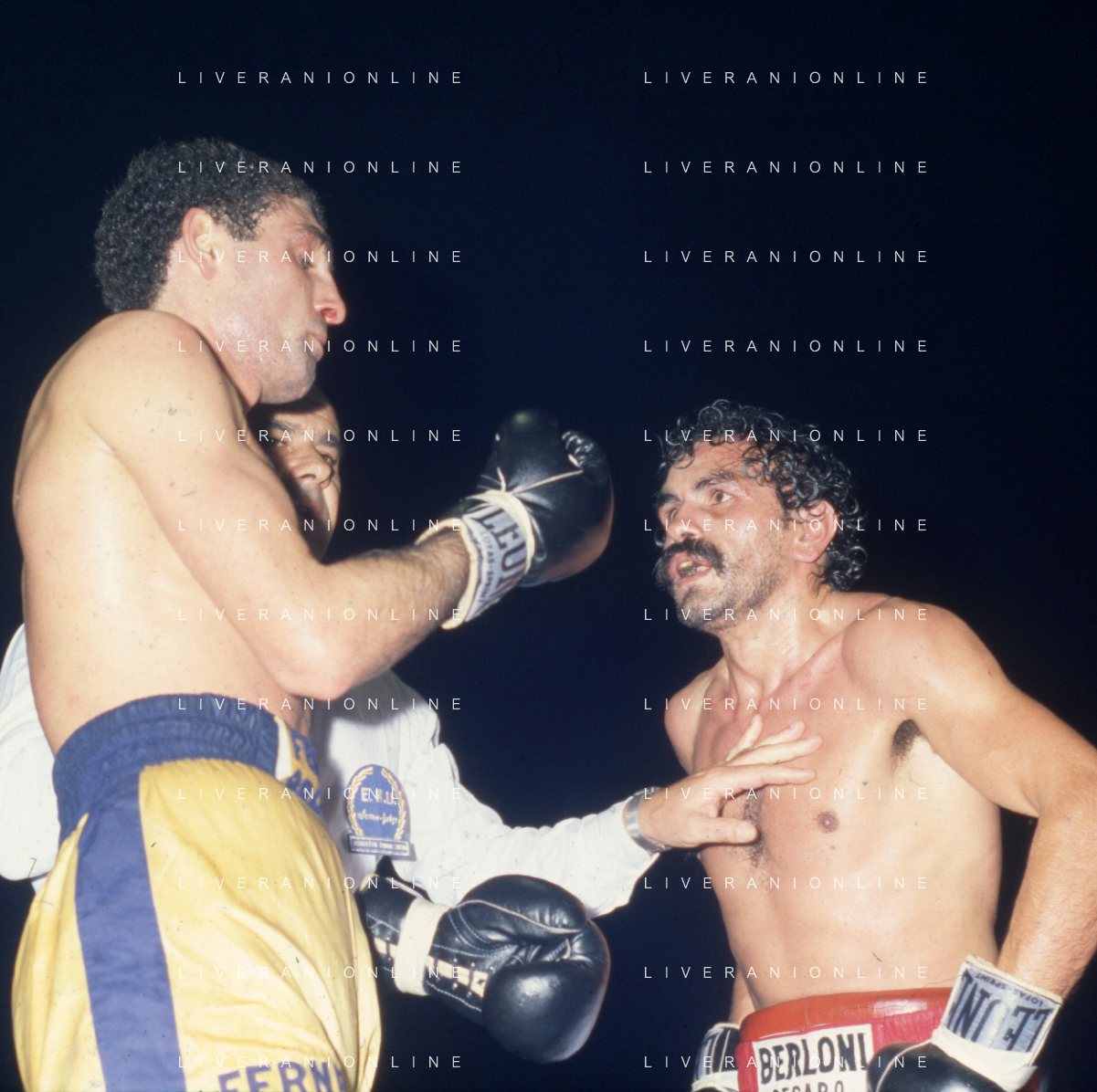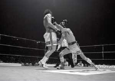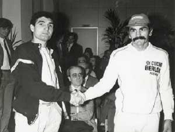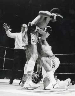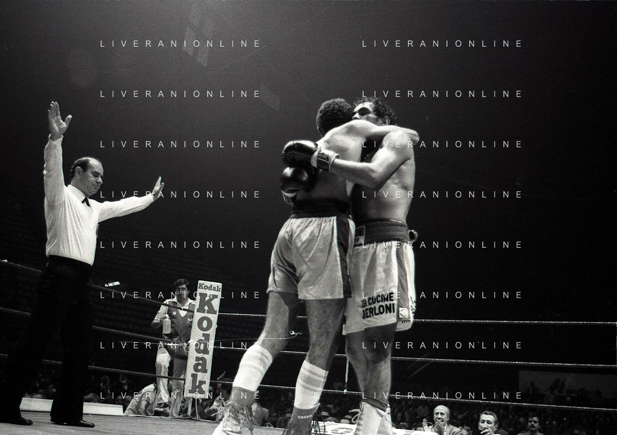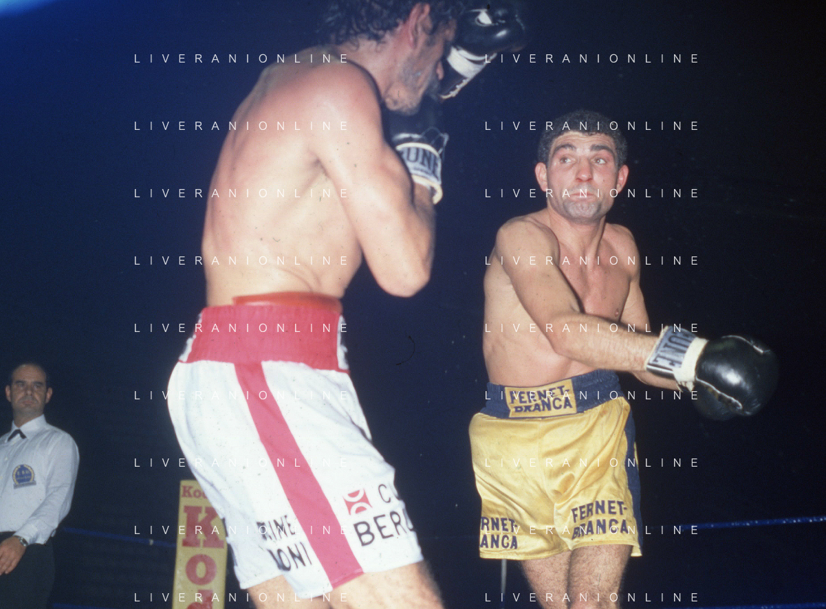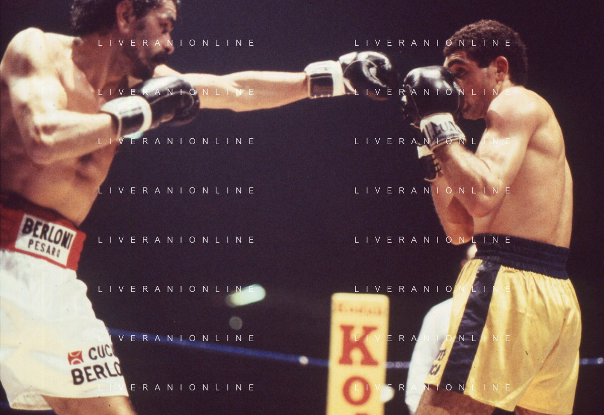14-10-1983 MILANO CAMPIONATO EUROPEO DI PUGILATO INCONTRO TRA PATRIZIO OLIVA E JUAN JOSE' GIMENEZ NELLA FOTO L'INCONTRO DI BOXE PATRIZIO OLIVA E JUAN JOSE' GIMENEZ AG ALDO LIVERANI SAS