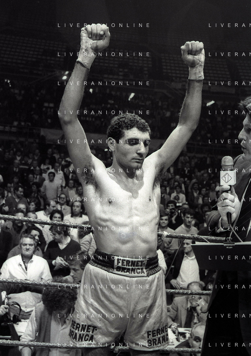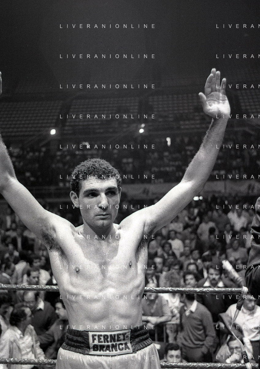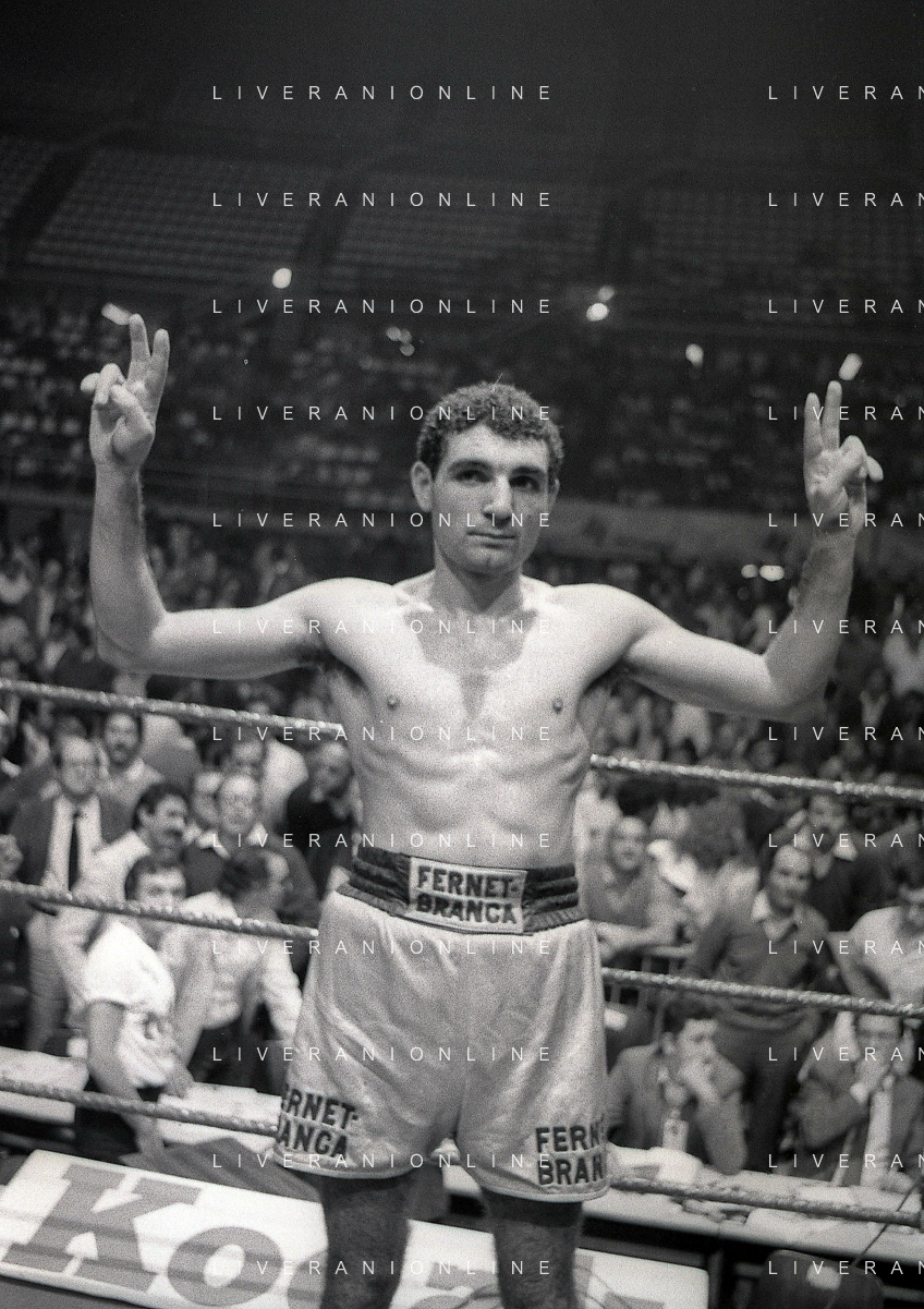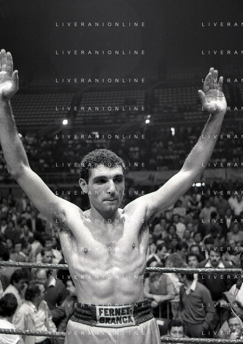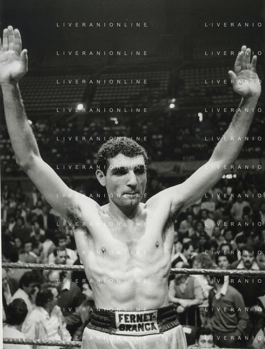14-10-1983 MILANO CAMPIONATO EUROPEO DI PUGILATO INCONTRO TRA PATRIZIO OLIVA E JUAN JOSE' GIMENEZ NELLA FOTO PATRIZIO OLIVA VINCITORE DELL'INCONTRO AG ALDO LIVERANI SAS