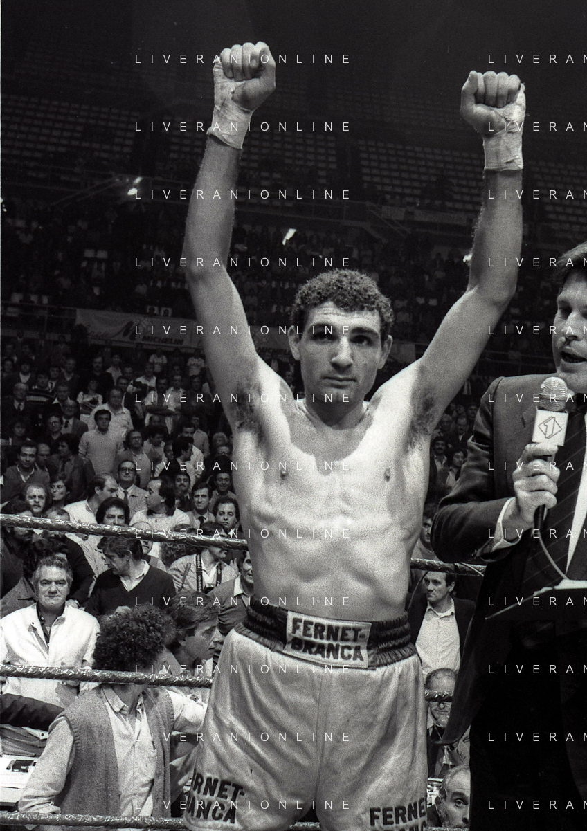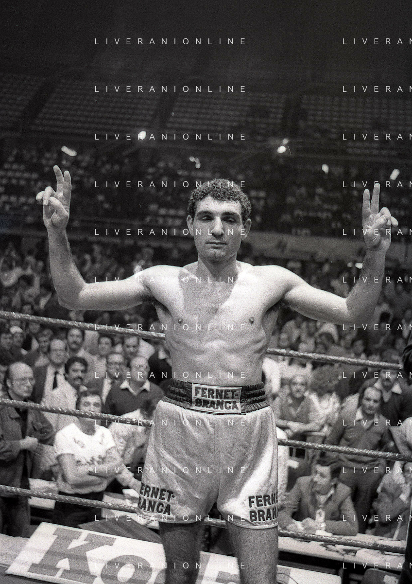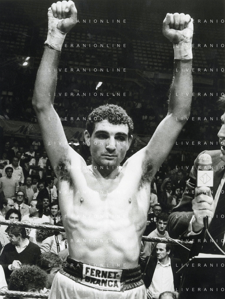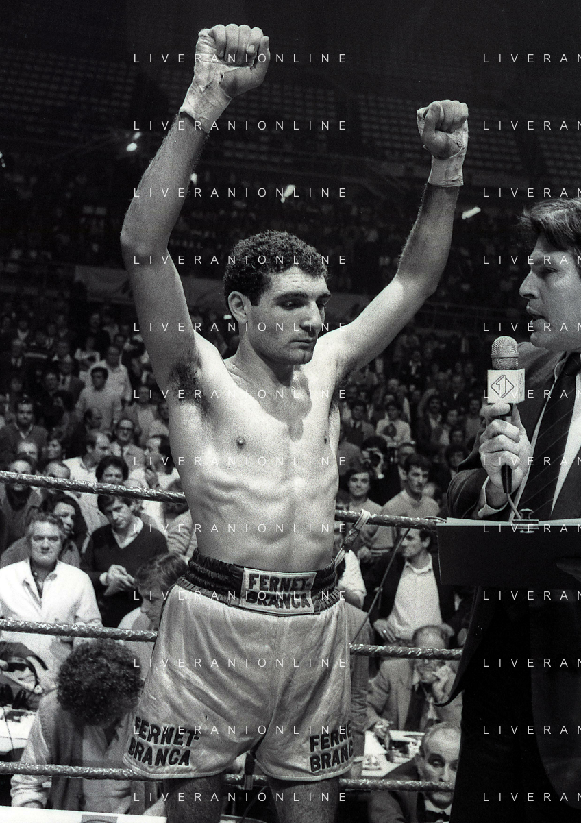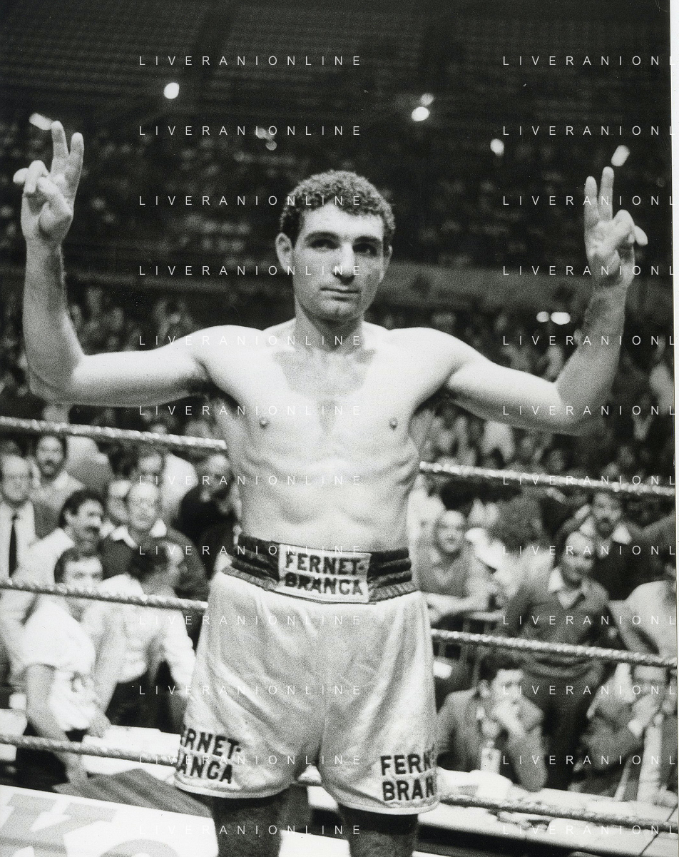14-10-1983 MILANO CAMPIONATO EUROPEO DI PUGILATO INCONTRO TRA PATRIZIO OLIVA E JUAN JOSE' GIMENEZ NELLA FOTO PATRIZIO OLIVA VINCITORE DELL'INCONTRO AG ALDO LIVERANI SAS