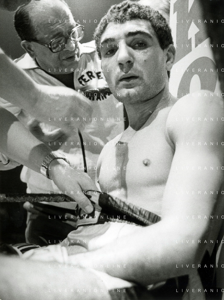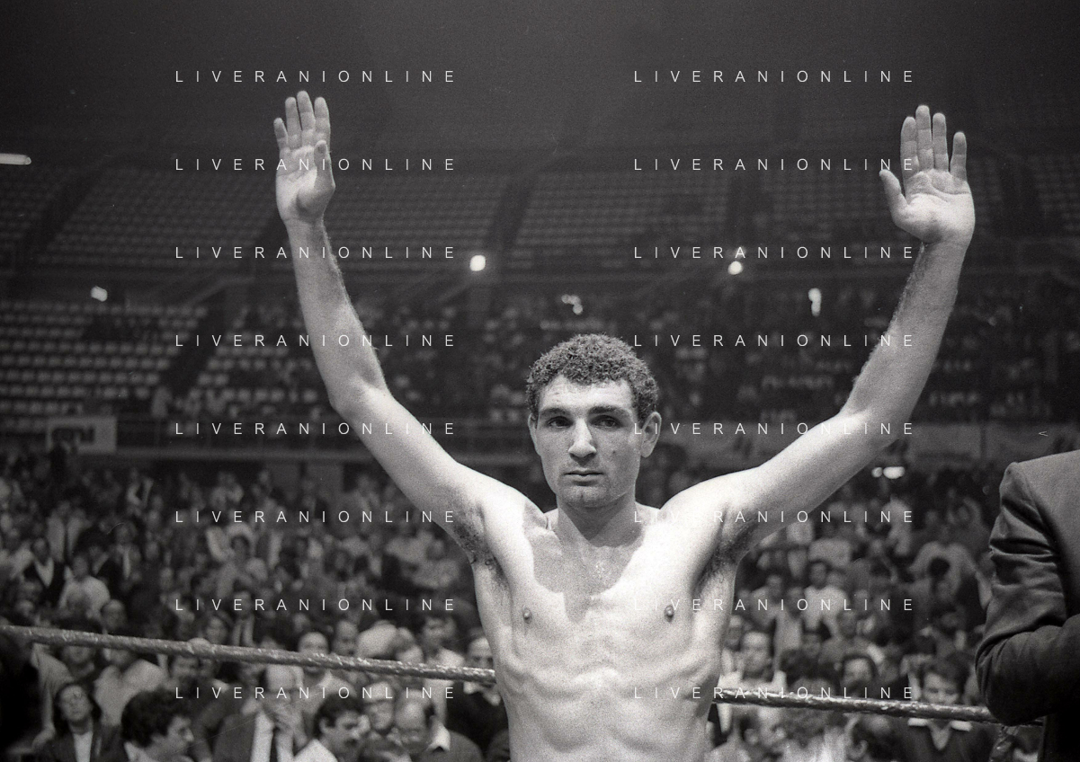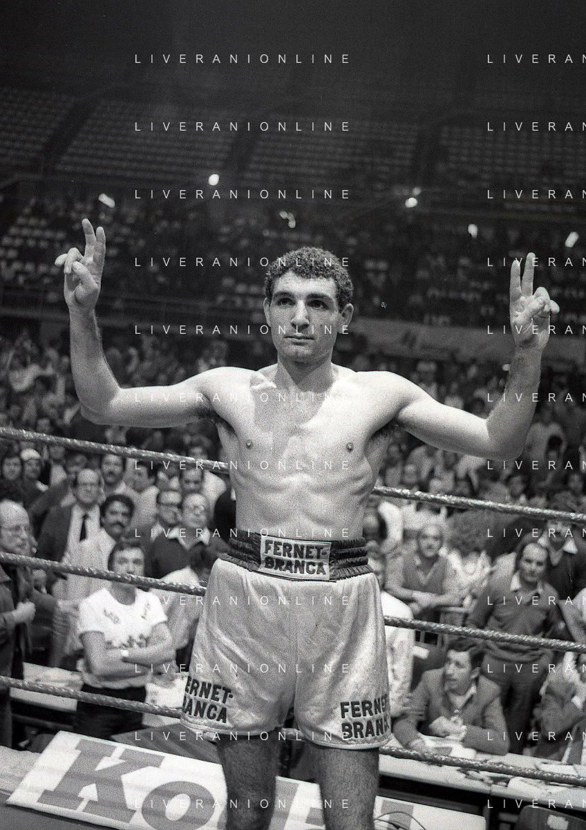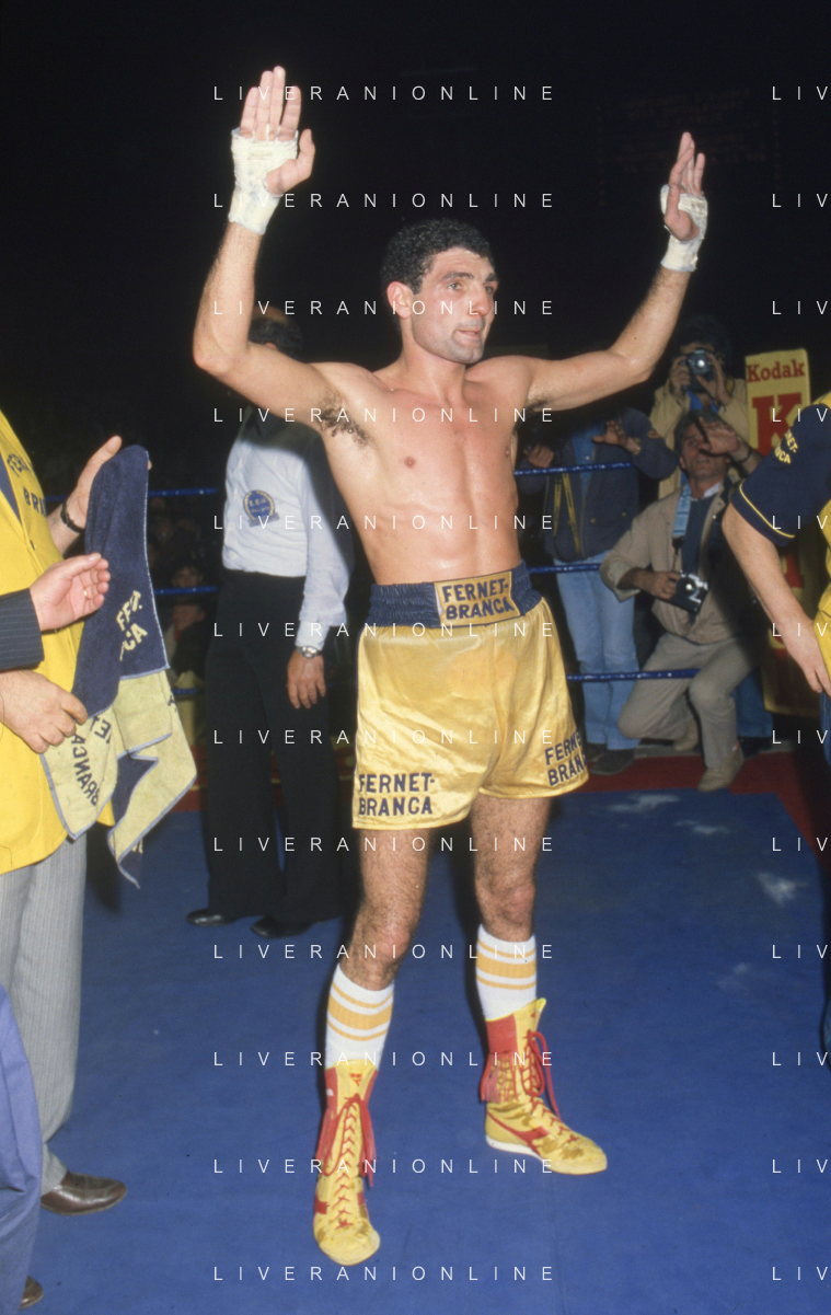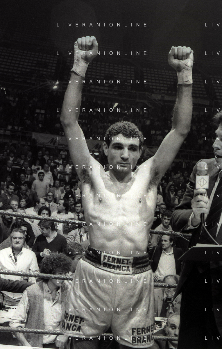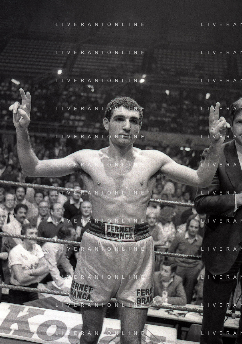 14-10-1983 MILANO CAMPIONATO EUROPEO DI PUGILATO INCONTRO TRA PATRIZIO OLIVA E JUAN JOSE' GIMENEZ NELLA FOTO PATRIZIO OLIVA VINCITORE DELL'INCONTRO AG ALDO LIVERANI SAS