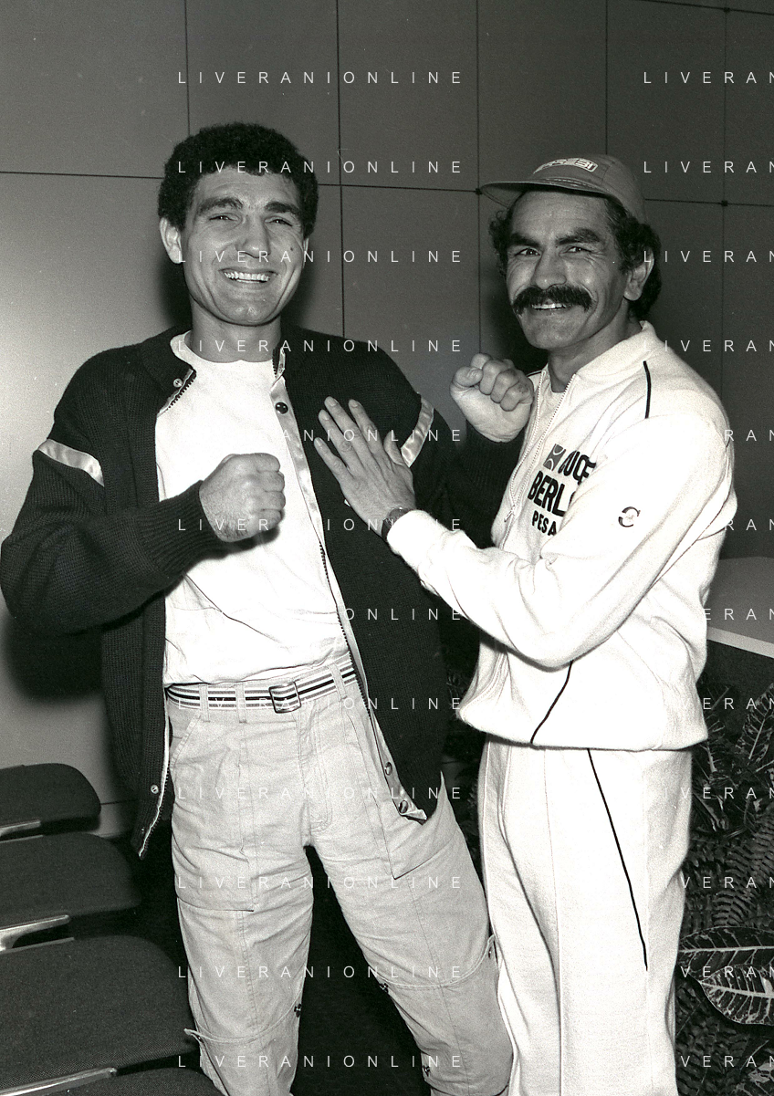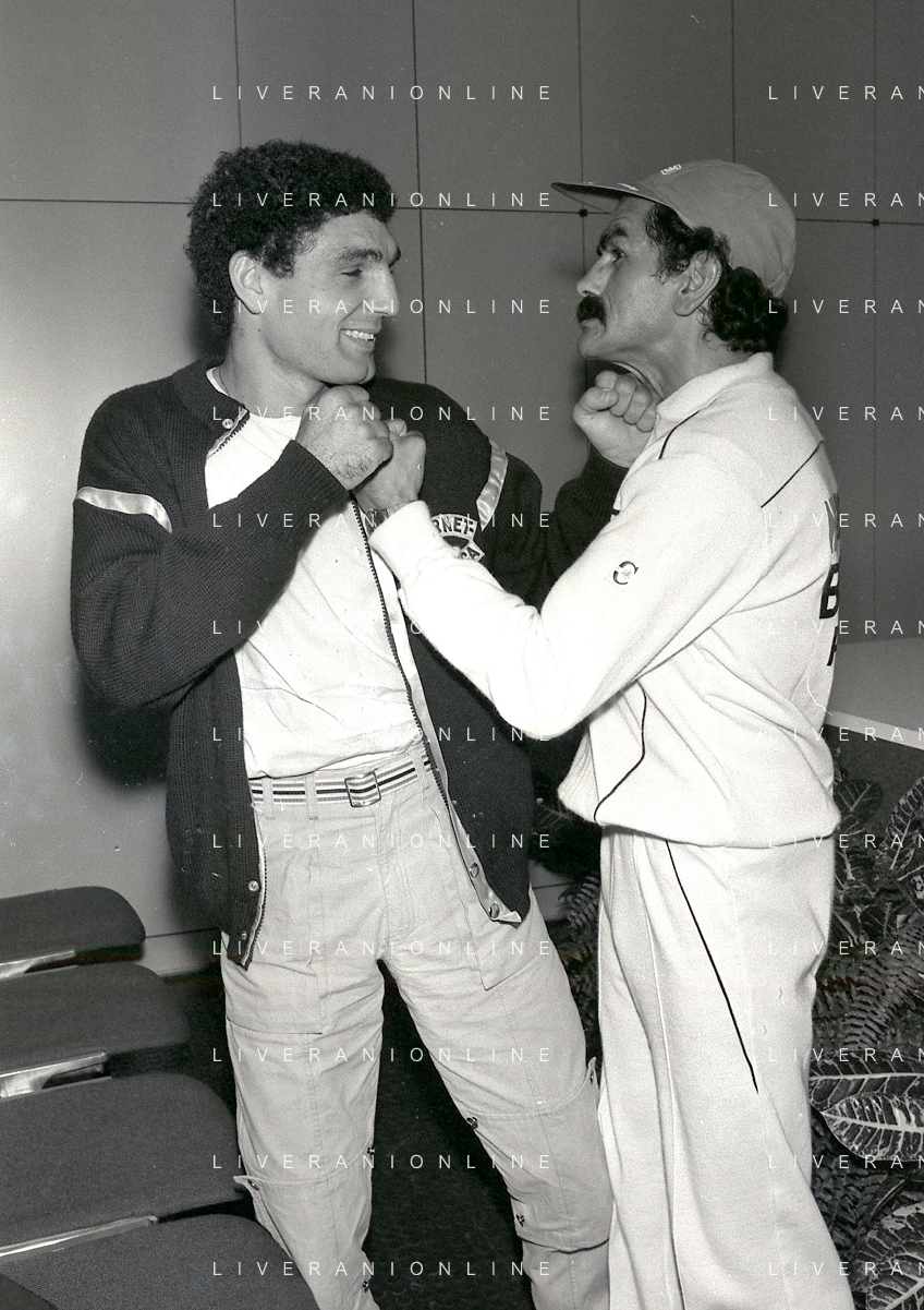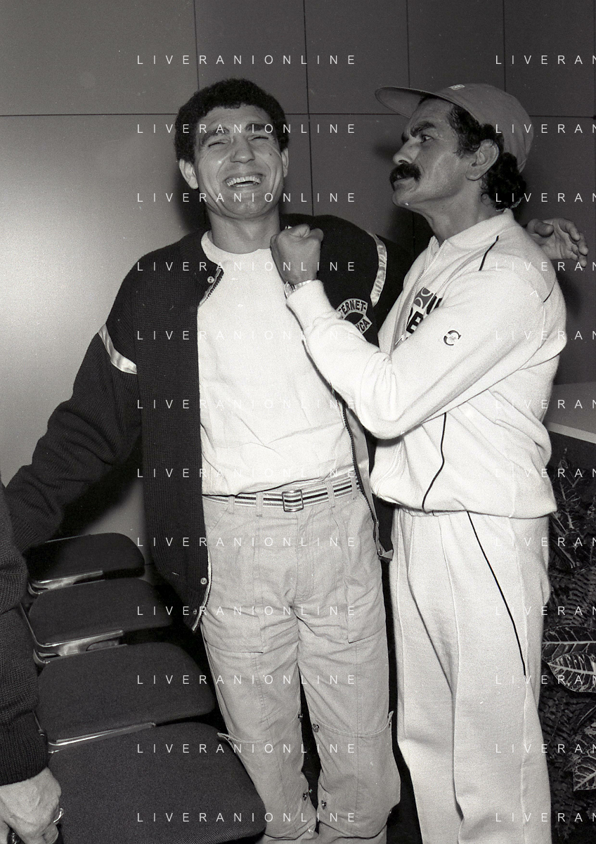 14-10-1983 MILANO CAMPIONATO EUROPEO DI PUGILATO INCONTRO TRA PATRIZIO OLIVA E JUAN JOSE' GIMENEZ NELLA FOTO PATRIZIO OLIVA CON JUAN JOSE GIMENEZ ALLA CONFERENZA STAMPA AG ALDO LIVERANI SAS