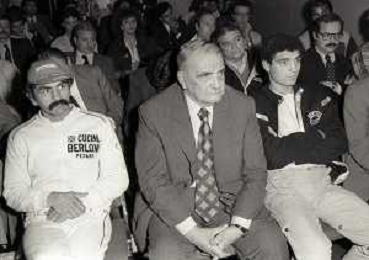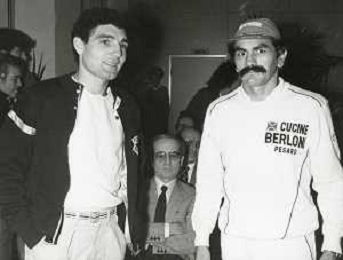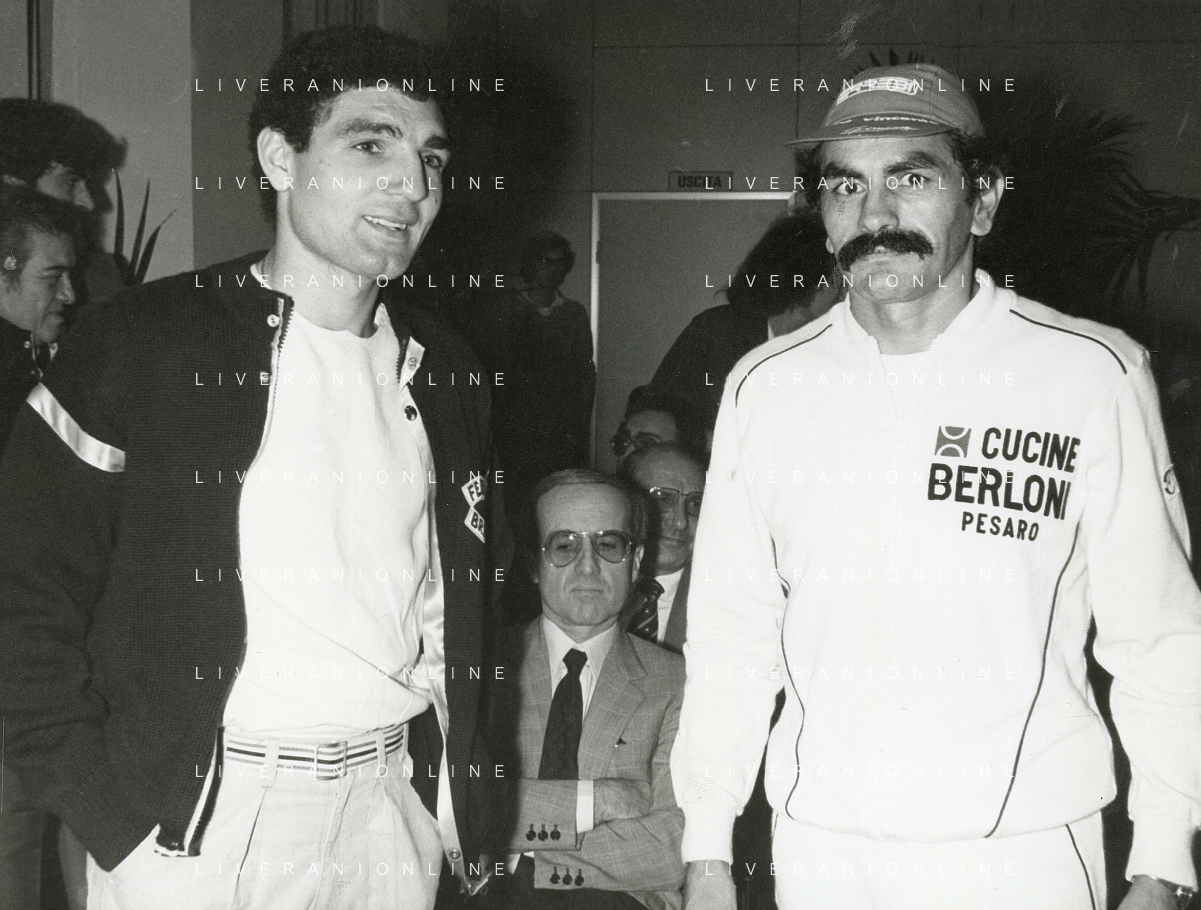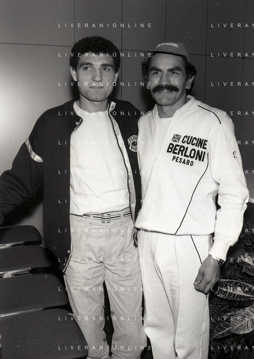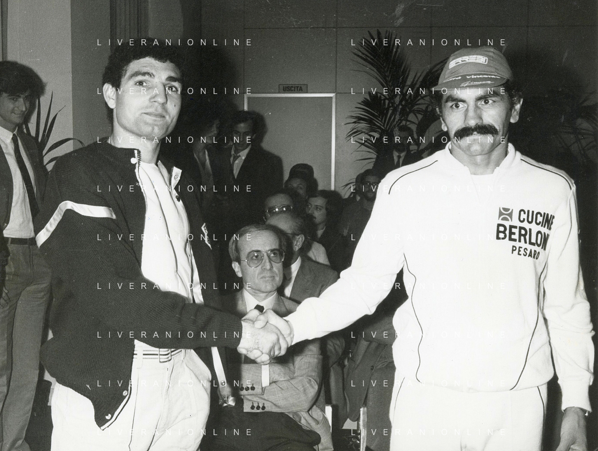 14-10-1983 MILANO CAMPIONATO EUROPEO DI PUGILATO INCONTRO TRA PATRIZIO OLIVA E JUAN JOSE' GIMENEZ NELLA FOTO PATRIZIO OLIVA CON JUAN JOSE GIMENEZ ALLA CONFERENZA STAMPA AG ALDO LIVERANI SAS