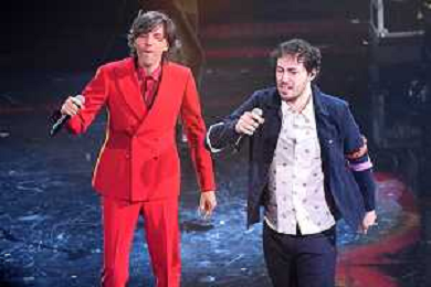 Riccardo Zanotti SX voce dei Pinguini Tattici Nucleari e Bugo DX 71mo Festival della Canzone Italiana Sanremo 2021 - Terza Serata Teatro Ariston - Sanremo (IM) 04-03-2021 foto Roberto Garavaglia/ag. Aldo Liverani sas