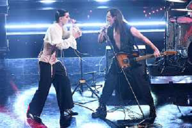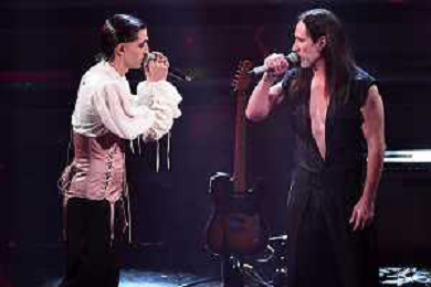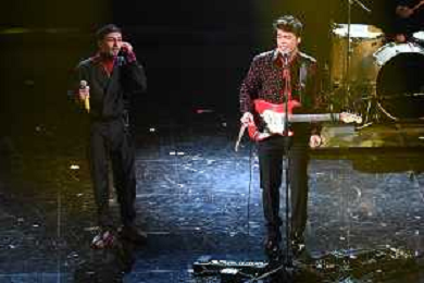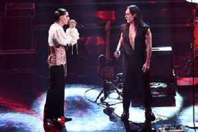 Damiano David SX voce dei Maneskin e Manuel Agnelli DX 71mo Festival della Canzone Italiana Sanremo 2021 - Terza Serata Teatro Ariston - Sanremo (IM) 04-03-2021 foto Roberto Garavaglia/ag. Aldo Liverani sas