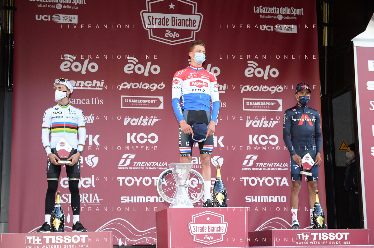 06-03-2021 Strade Bianche; 2021, Deceuninck - Quick Step; 2021, Ineos Grenadiers; Van Der Poel, Mathieu; Alaphilippe, Julian; Bernal Gomez, Arley; Siena; ©SIROTTI / AGENZIA ALDO LIVERANI SAS