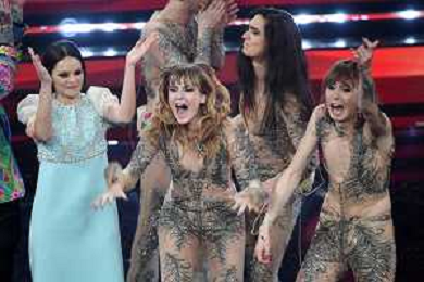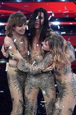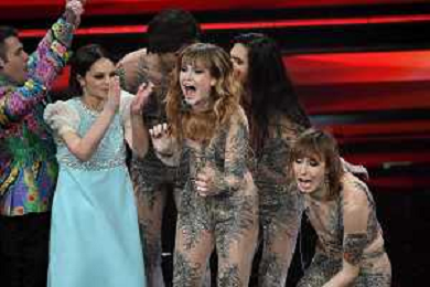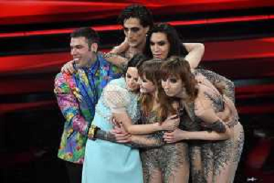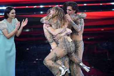Francesca Michielin e Fedez abbracciati con i Maneskin in attesa del nome del vincitore di Sanremo 2021 71mo Festival della Canzone Italiana Sanremo 2021 - Quinta Serata Teatro Ariston - Sanremo (IM) 06-03-2021 foto Roberto Garavaglia/ag. Aldo Liverani sas