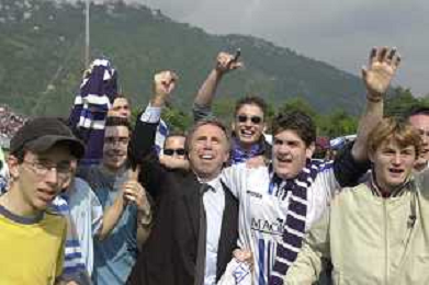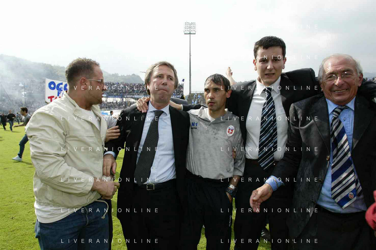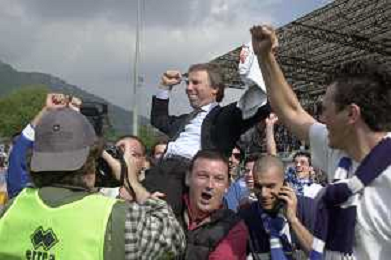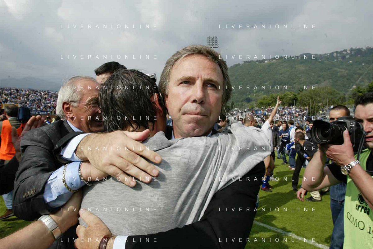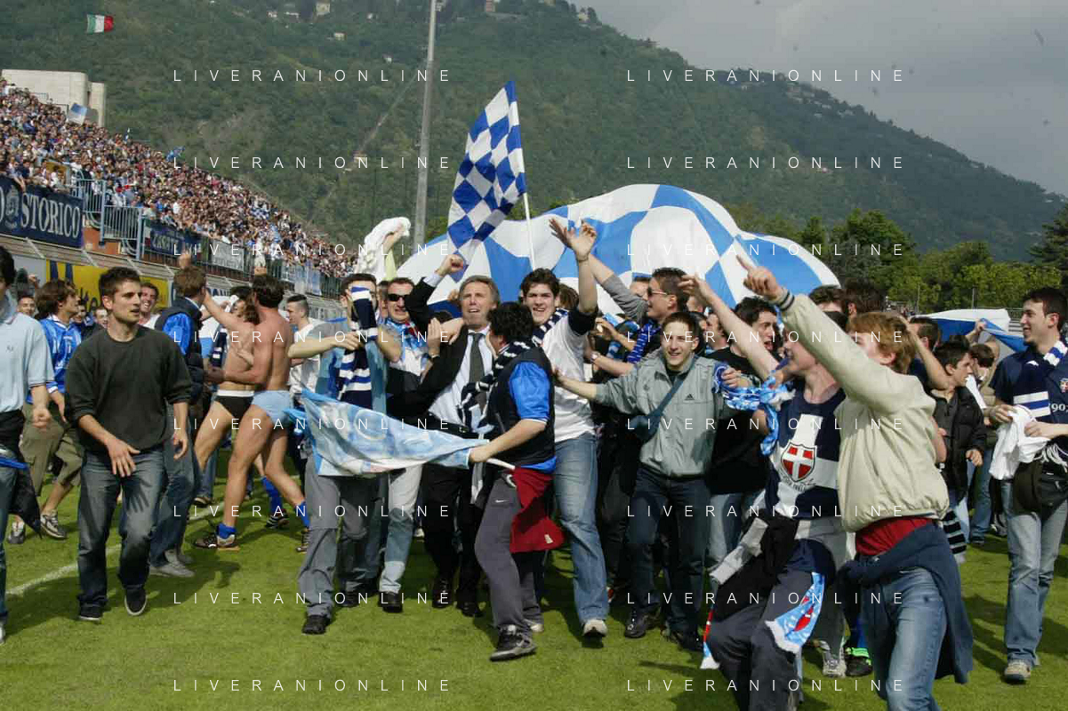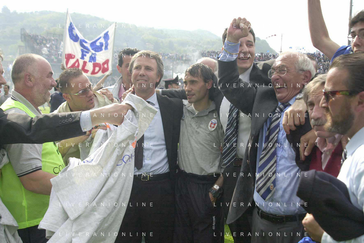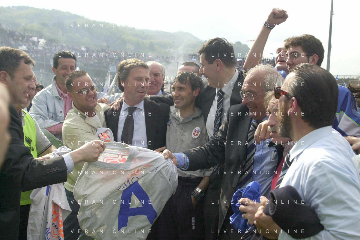 COMO - EMPOLI CAMPIONATO SERIE B 12/05/2002 NELLA FOTO IL PRESIDENTE ENRICO PREZIOSI CON LORIS DOMISSINI CON I TIFOSI FESTEGGIA LA PROMOZIONE IN SERIE A DEL COMO AGENZIA ALDO LIVERANI SAS