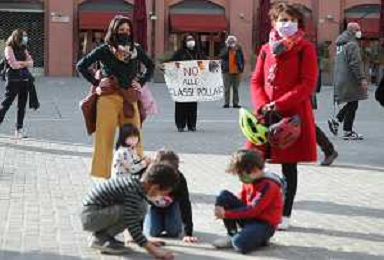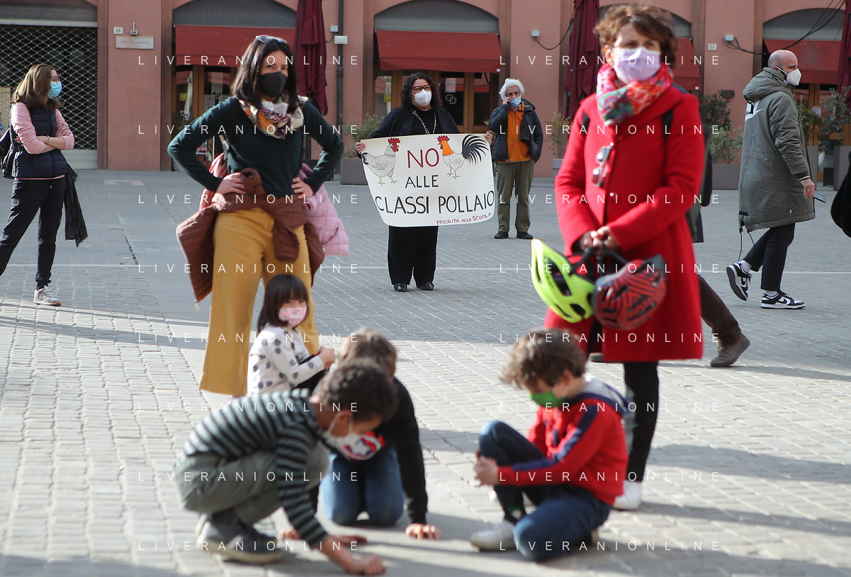 IMOLA 26 03 2021 PIAZZA MATTEOTTI COMITATO PRIORITA' ALLA SCUOLA HA ORGANIZZATO LA MANIFESTAZIONE CON I GENITORI INSEGNANTI E I BAMBINI PER ANDARE A SCUOLA FOTO GIANNI SANNA-AG ALDO LIVERANI SAS