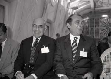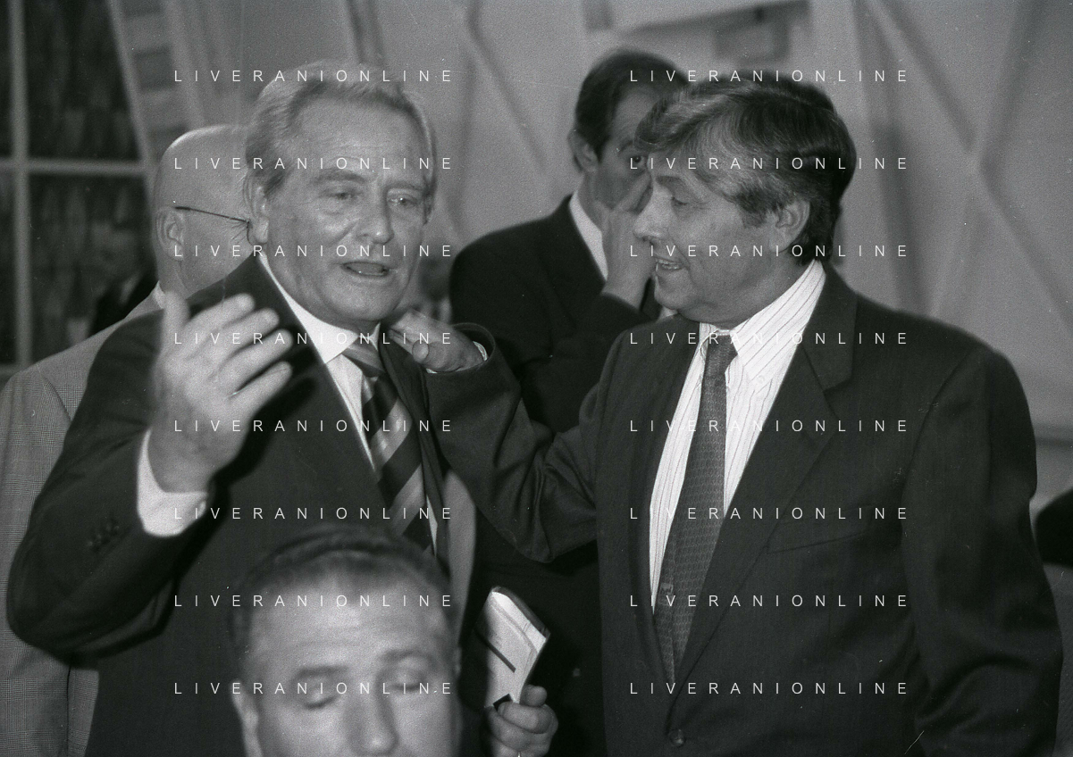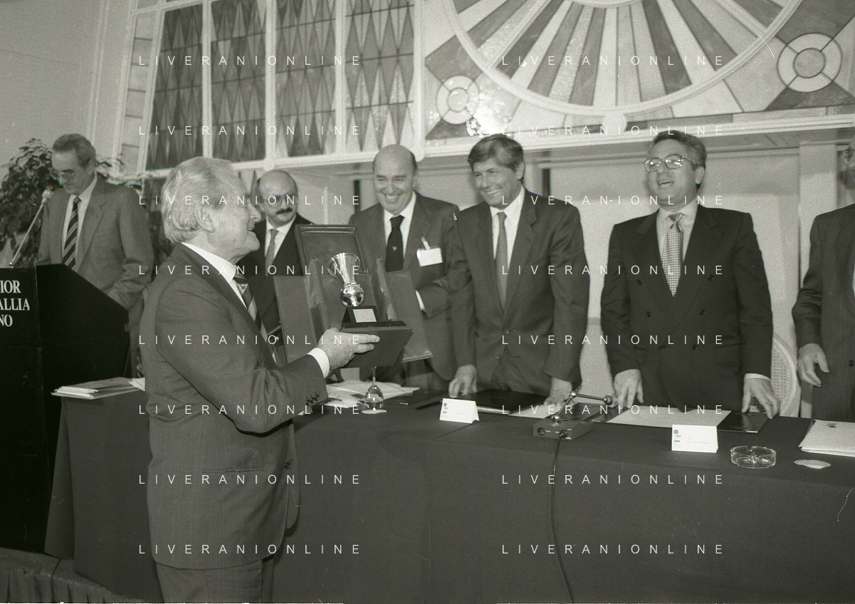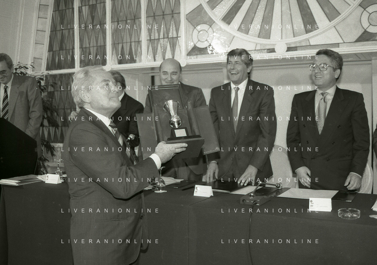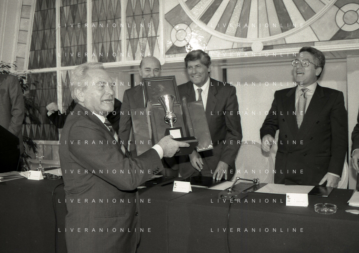1993 MILANO PREMIAZIONI DELLA LEGA CALCIO ALLE SOCIETA' DI CALCIO ALLA PRESENZA DEI PRESIDENTI HOTEL GALLIA NELLA FOTO GIAMPIERO BONIPERTI AG ALDO LIVERANI SAS