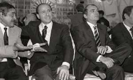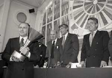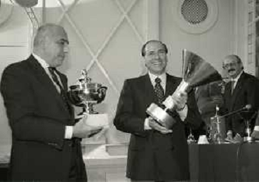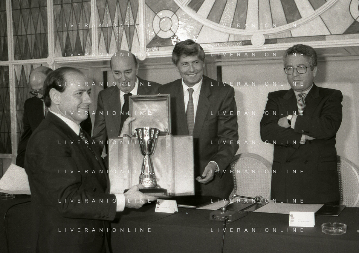1993 MILANO PREMIAZIONI DELLA LEGA CALCIO ALLE SOCIETA' DI CALCIO ALLA PRESENZA DEI PRESIDENTI HOTEL GALLIA NELLA FOTO FRANCO JURLANO-SILVIO BERLUSCONI E ERNESTO PELLEGRINI AG ALDO LIVERANI SAS