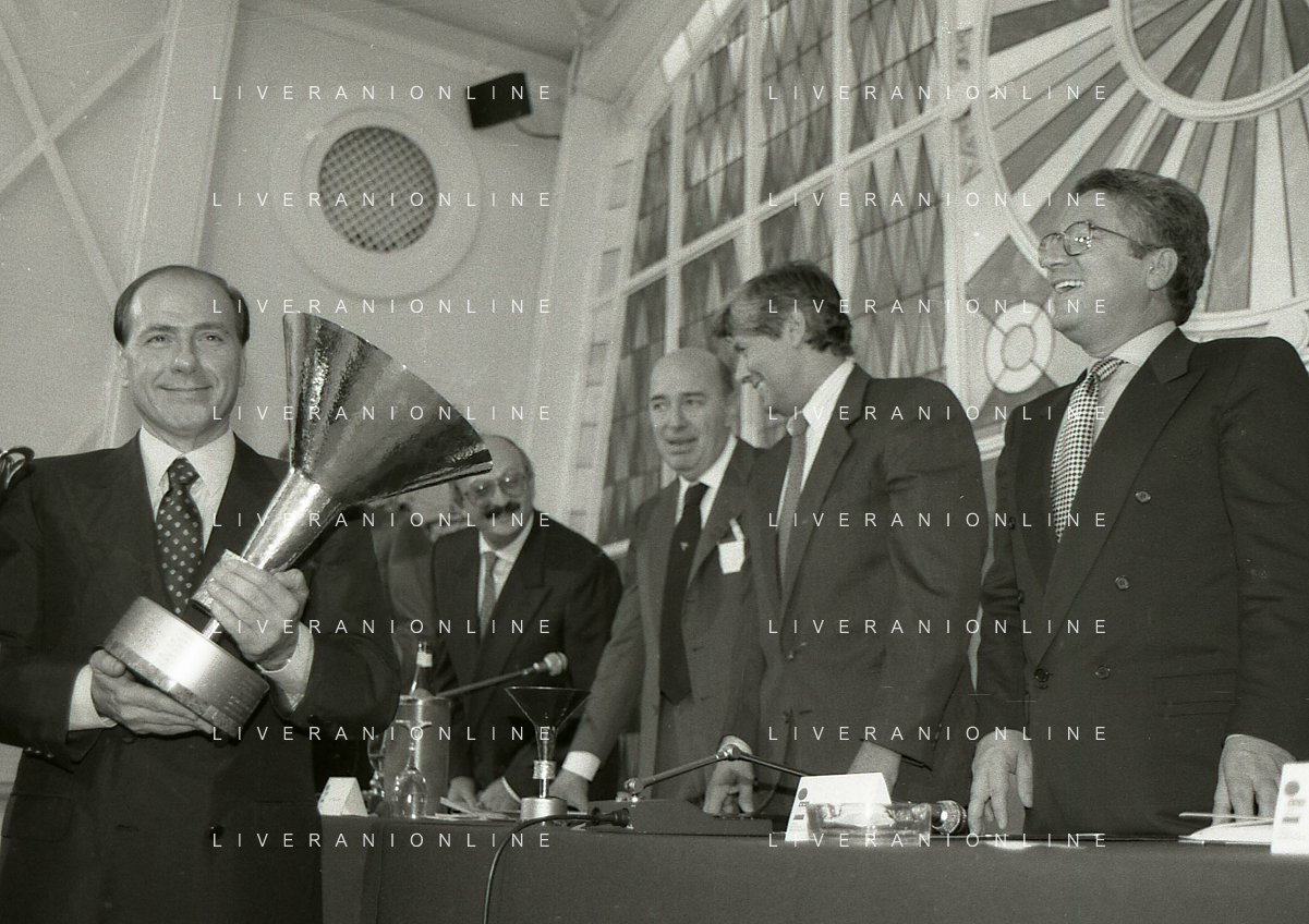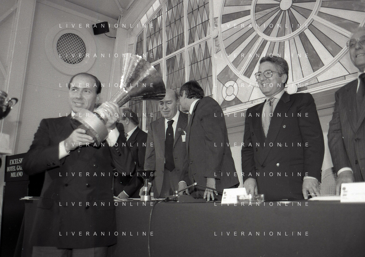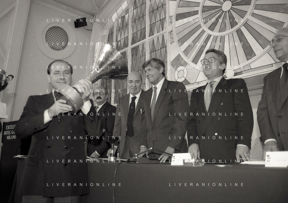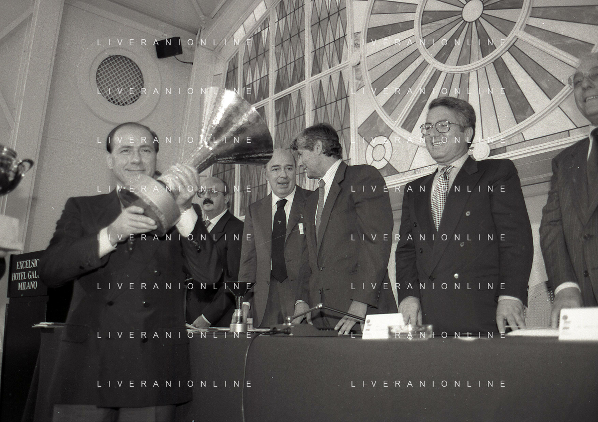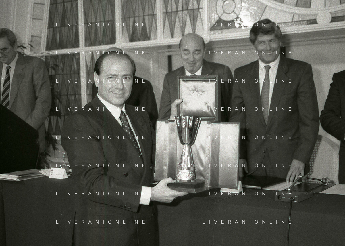 1993 MILANO PREMIAZIONI DELLA LEGA CALCIO ALLE SOCIETA' DI CALCIO ALLA PRESENZA DEI PRESIDENTI HOTEL GALLIA NELLA FOTO SILVIO BERLUSCONI AG ALDO LIVERANI SAS