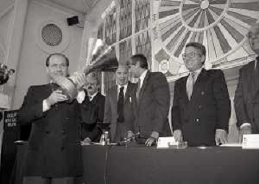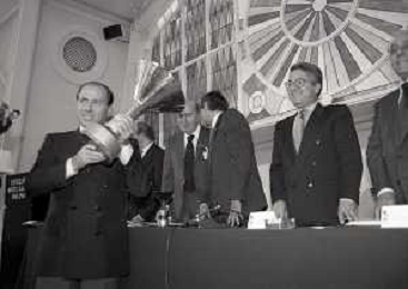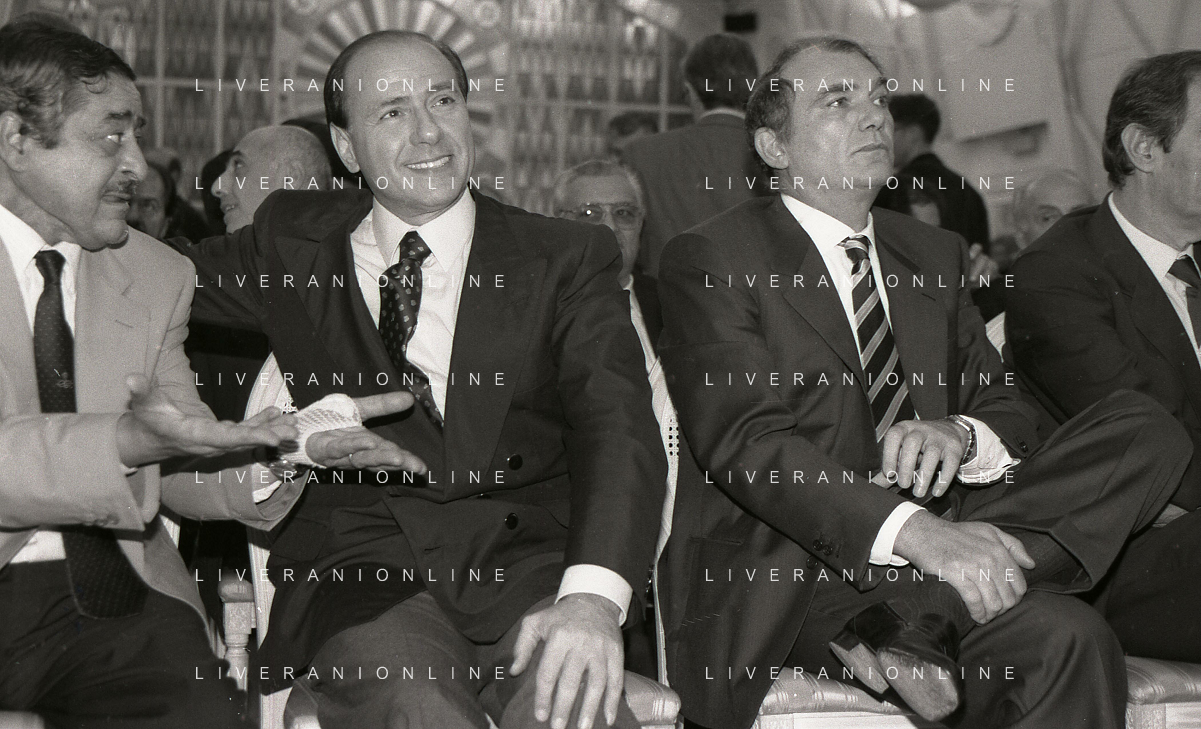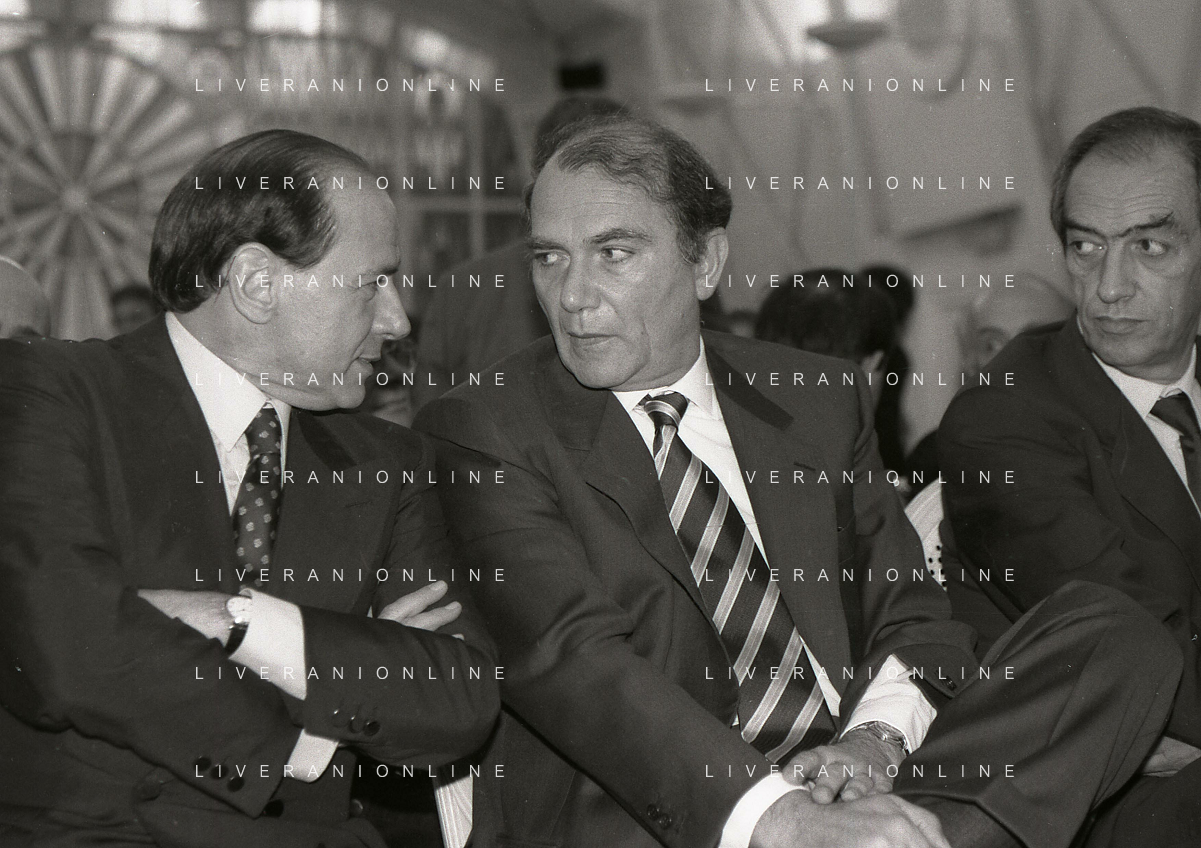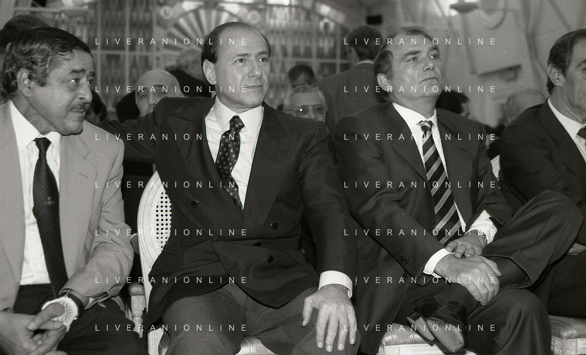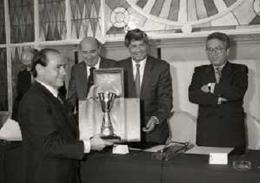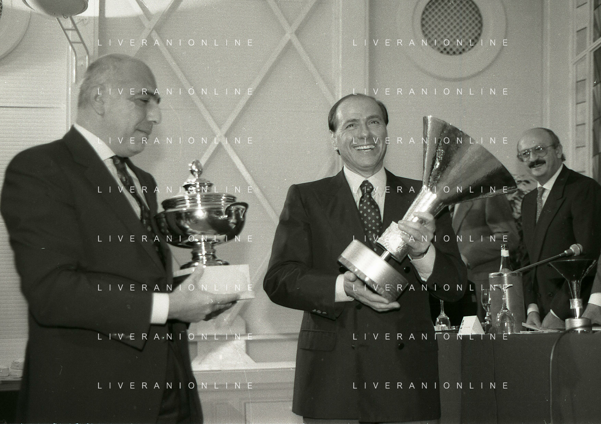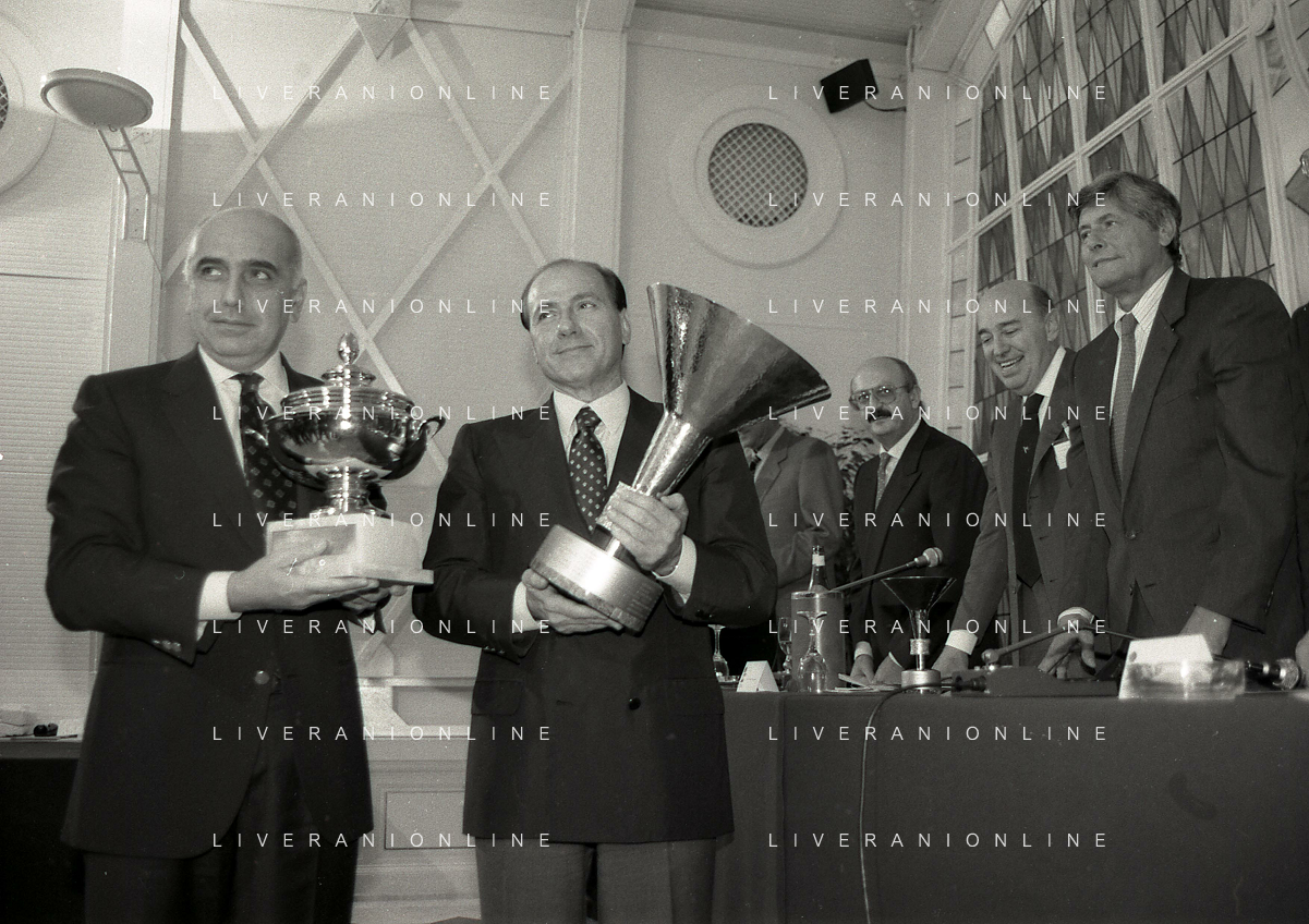 1993 MILANO PREMIAZIONI DELLA LEGA CALCIO ALLE SOCIETA' DI CALCIO ALLA PRESENZA DEI PRESIDENTI HOTEL GALLIA NELLA FOTO SILVIO BERLUSCONI AG ALDO LIVERANI SAS