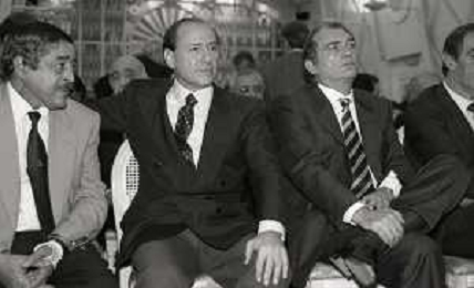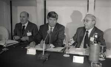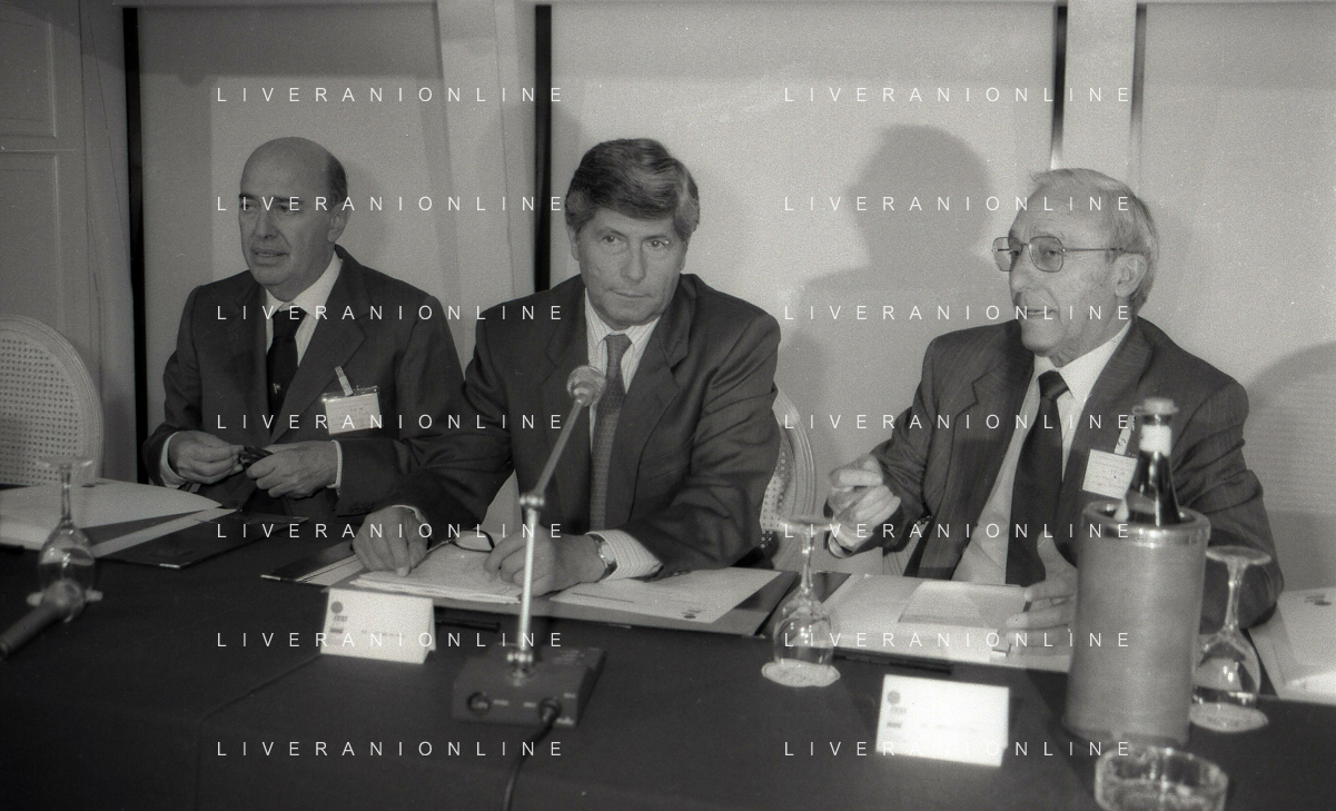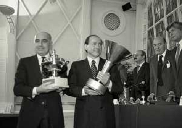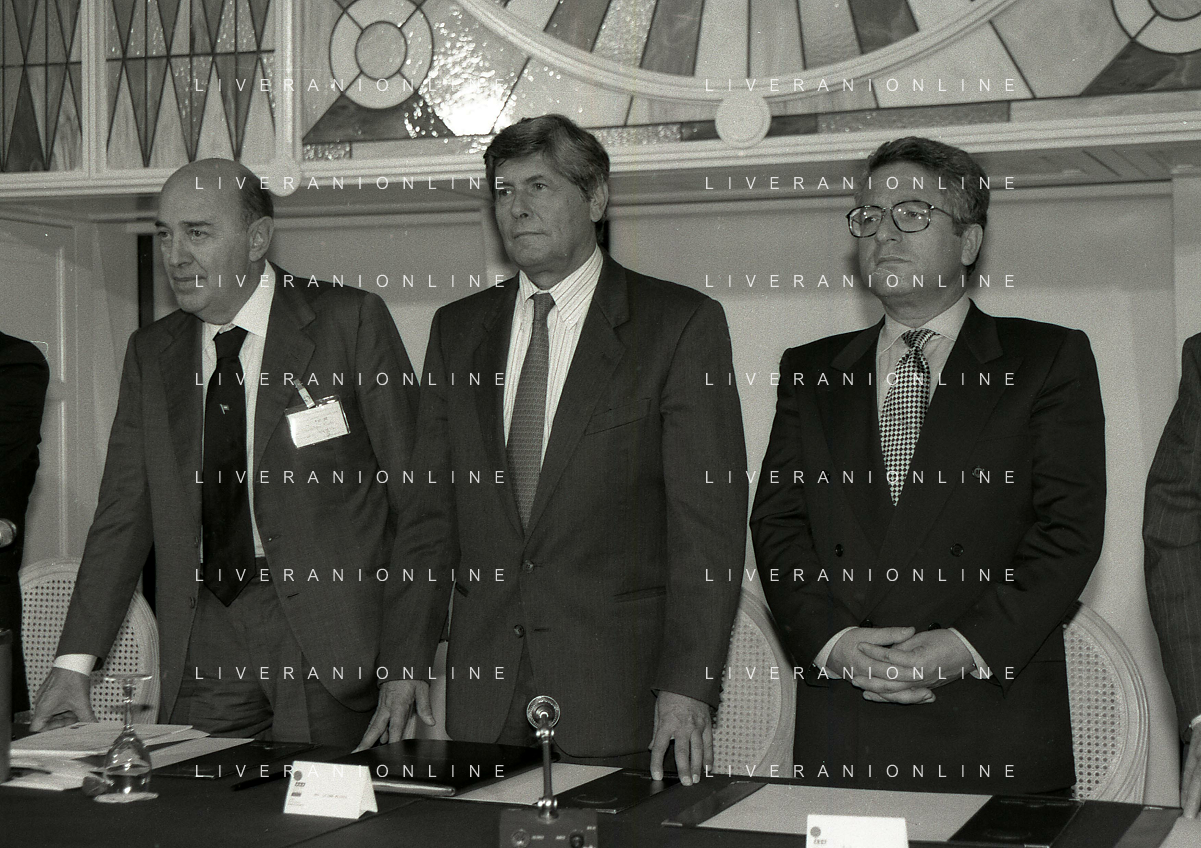 1993 MILANO PREMIAZIONI DELLA LEGA CALCIO ALLE SOCIETA' DI CALCIO ALLA PRESENZA DEI PRESIDENTI HOTEL GALLIA NELLA FOTO PAOLO MANTOVANI-LUCIANO NIZZOLI E ANTONIO MATARRESE AG ALDO LIVERANI SAS