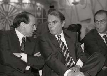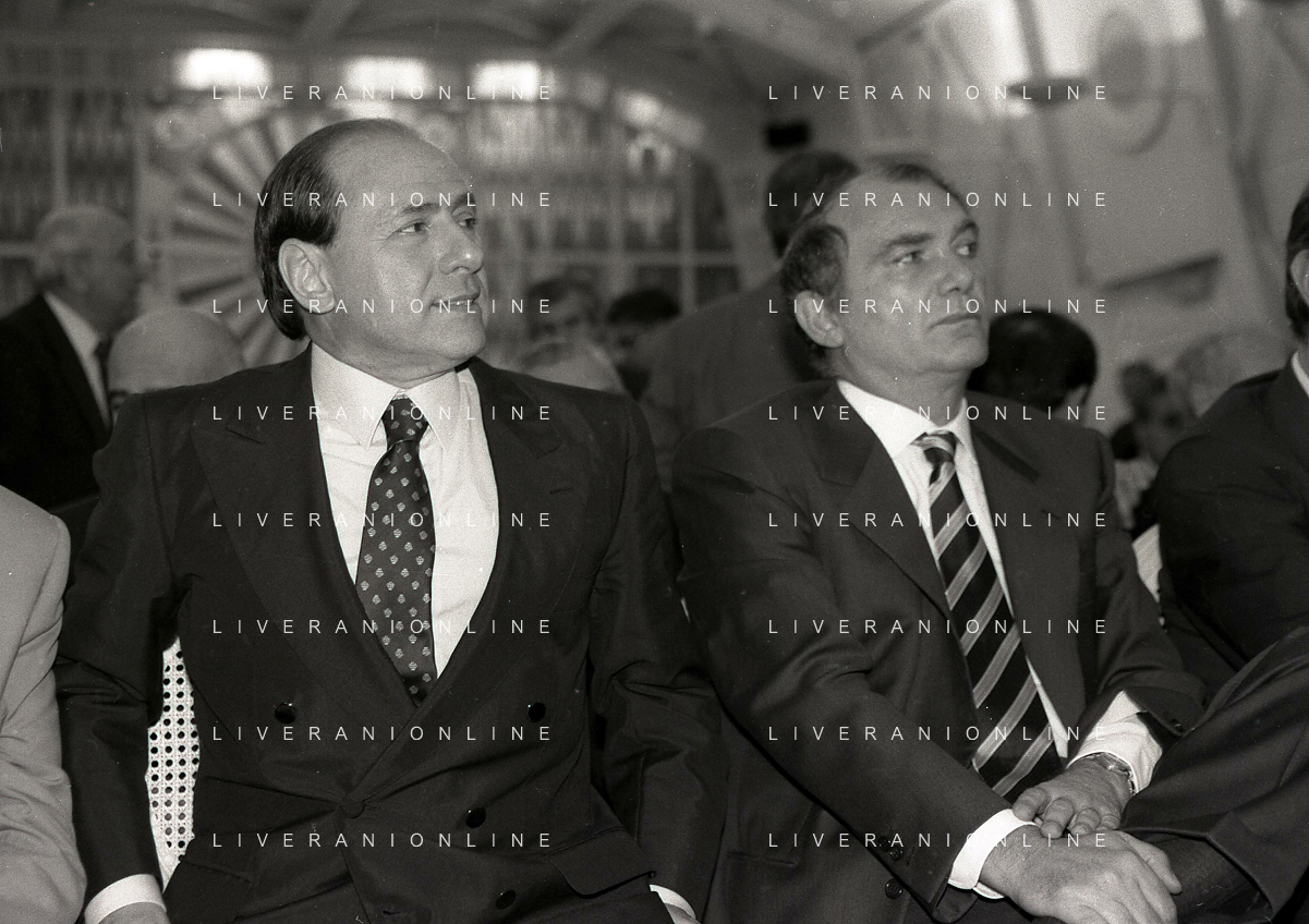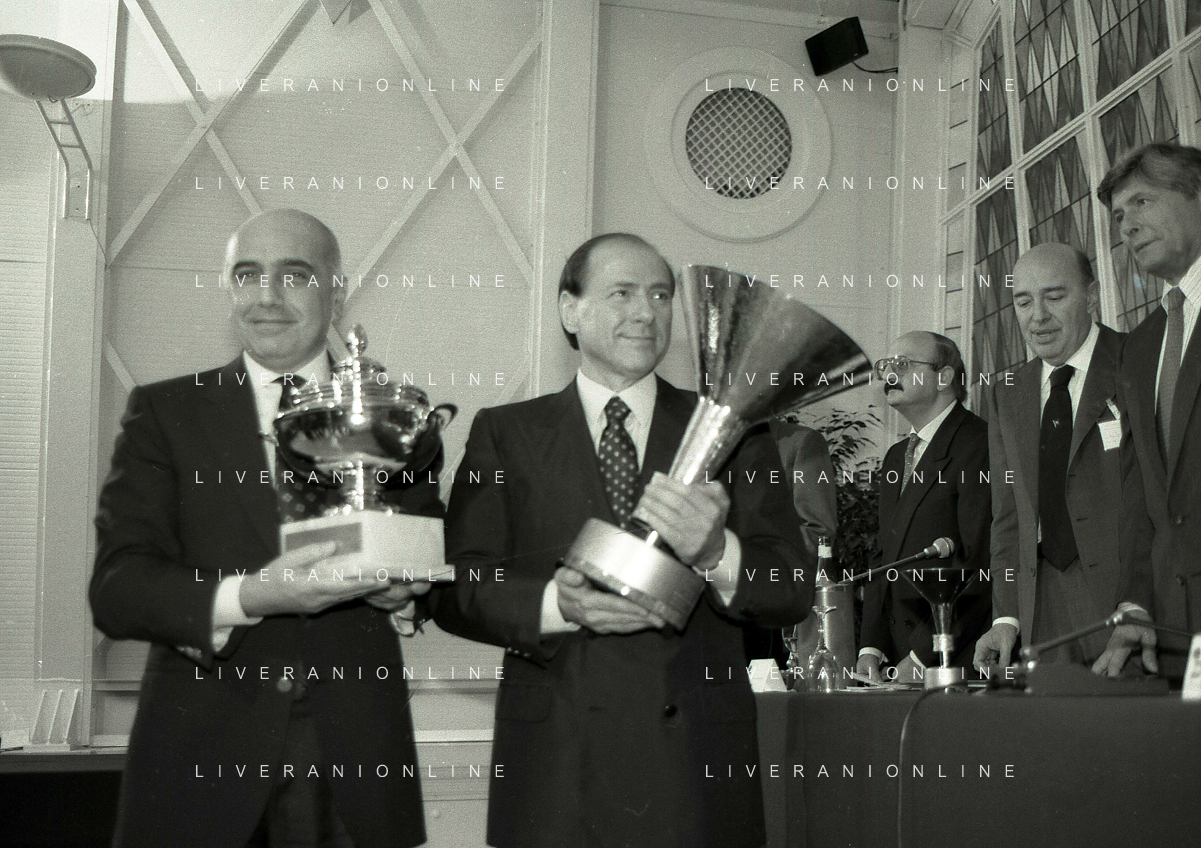 1993 MILANO PREMIAZIONI DELLA LEGA CALCIO ALLE SOCIETA' DI CALCIO ALLA PRESENZA DEI PRESIDENTI HOTEL GALLIA NELLA FOTO ADRIANO GALLIANI E SILVIO BERLUSCONI AG ALDO LIVERANI SAS