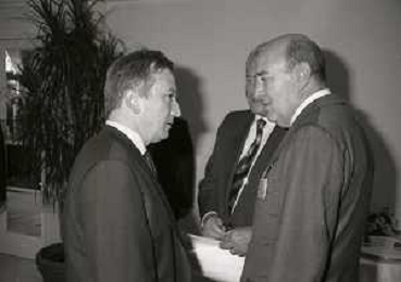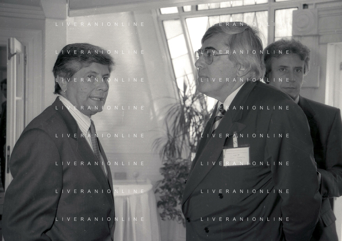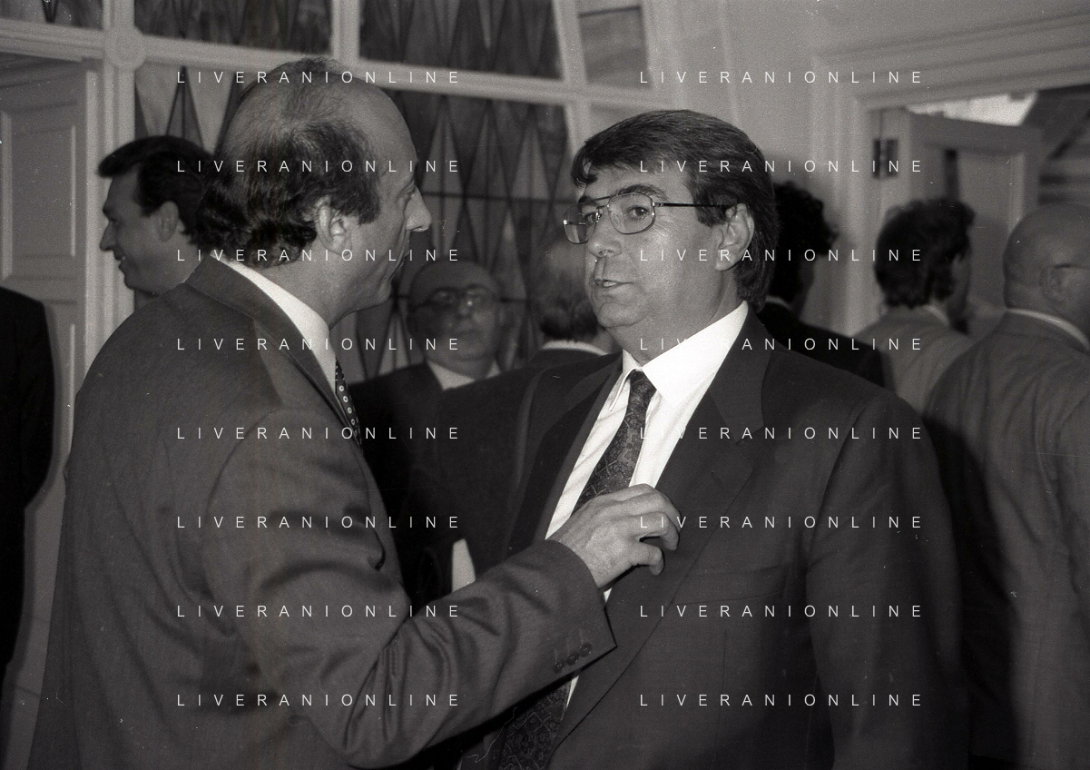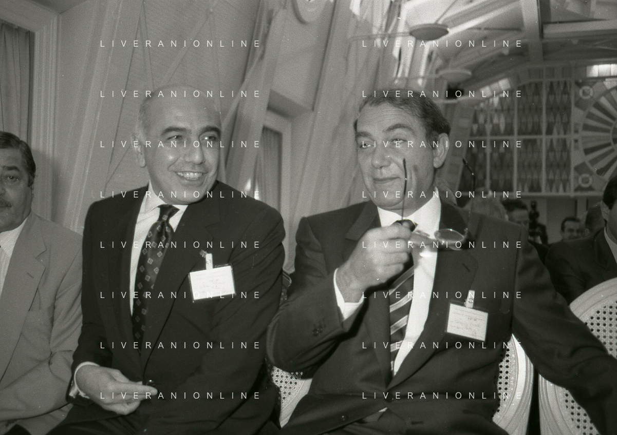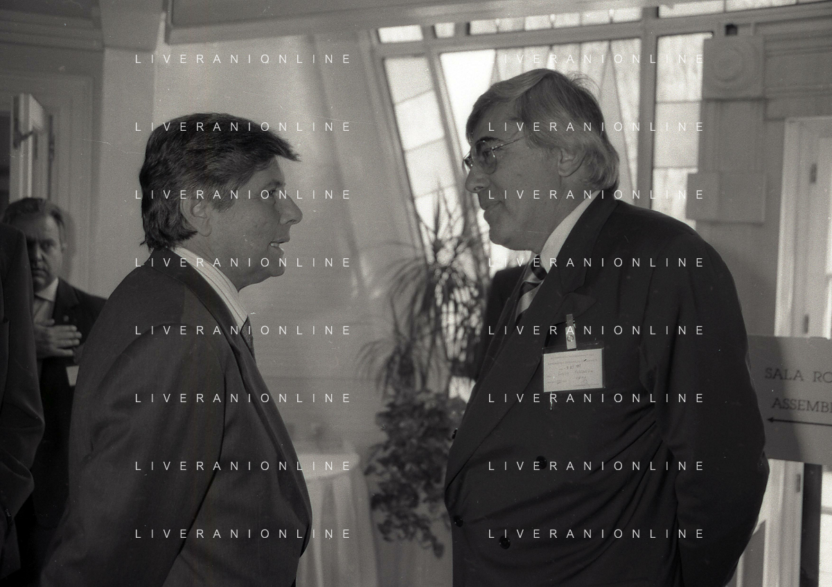 1993 MILANO PREMIAZIONI DELLA LEGA CALCIO ALLE SOCIETA' DI CALCIO ALLA PRESENZA DEI PRESIDENTI HOTEL GALLIA NELLA FOTO LUCIANO NIZZOLA E GIORGIO PEDRANESCHI AG ALDO LIVERANI SAS