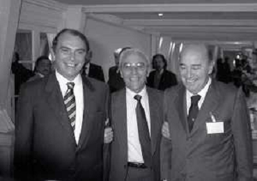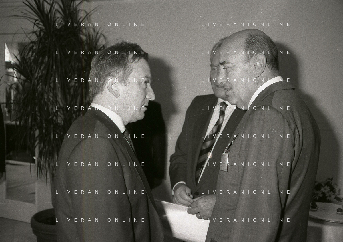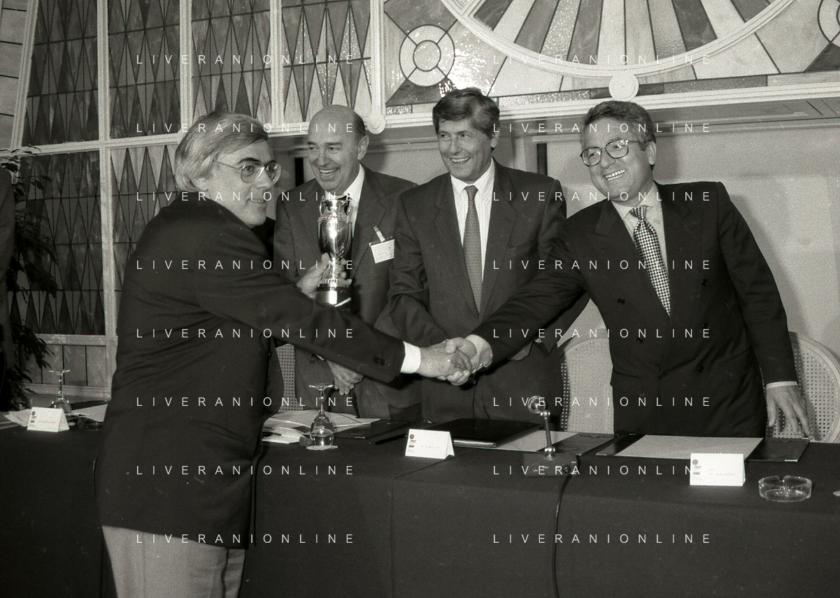 1993 MILANO PREMIAZIONI DELLA LEGA CALCIO ALLE SOCIETA' DI CALCIO ALLA PRESENZA DEI PRESIDENTI HOTEL GALLIA NELLA FOTO ERNESTO PELLEGRINI-DOMENICO LUZZARA E PAOLO MANTOVANI AG ALDO LIVERANI SAS