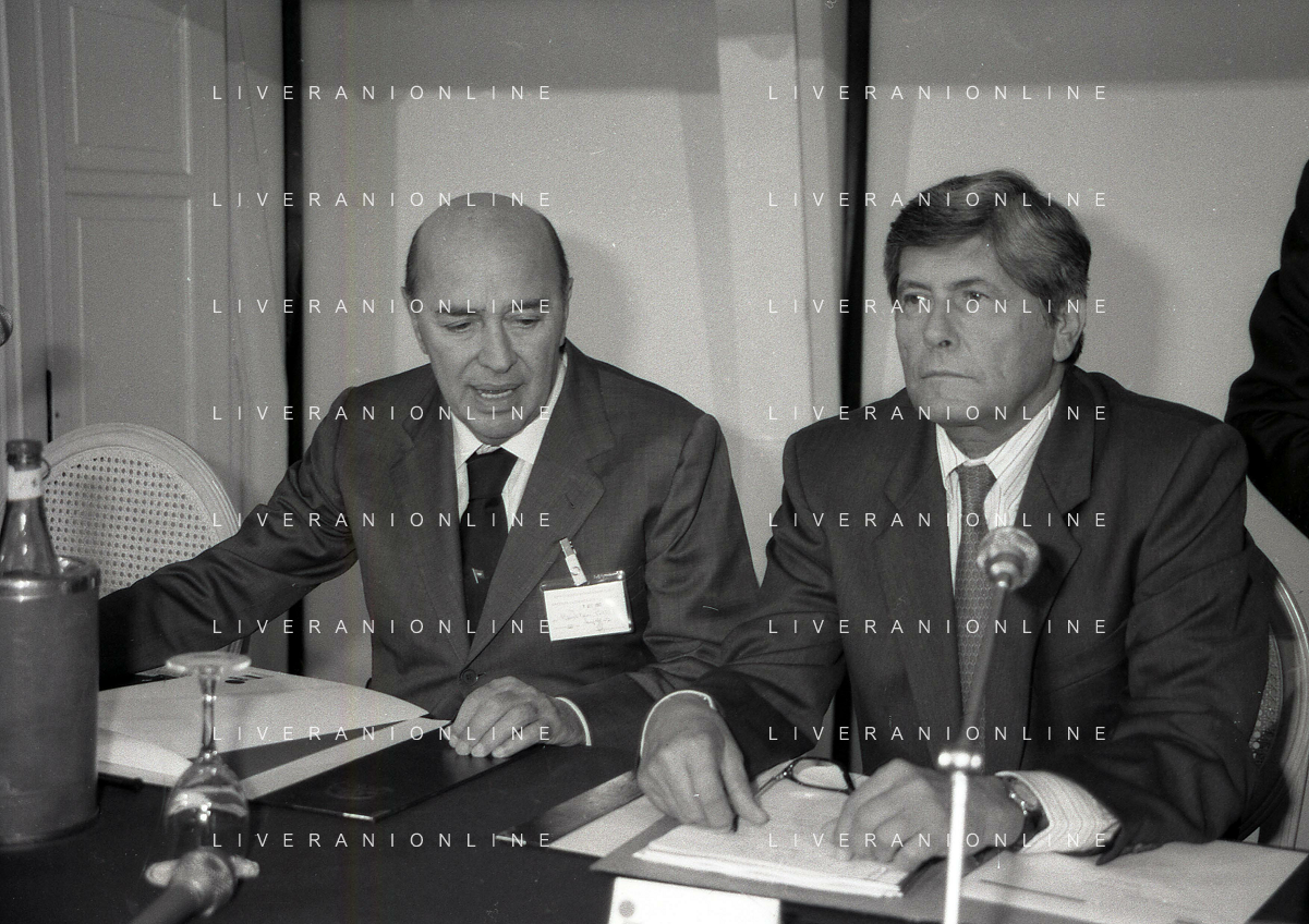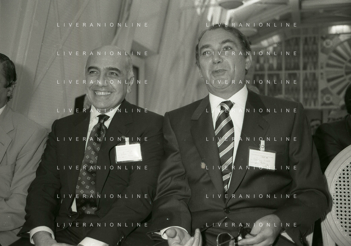 1993 MILANO PREMIAZIONI DELLA LEGA CALCIO ALLE SOCIETA' DI CALCIO ALLA PRESENZA DEI PRESIDENTI HOTEL GALLIA NELLA FOTO LUCIANO NIZZOLA E ANTONIO MATARRESE AG ALDO LIVERANI SAS