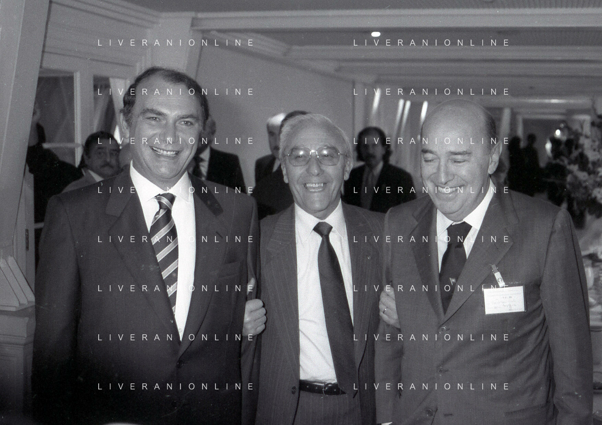1993 MILANO PREMIAZIONI DELLA LEGA CALCIO ALLE SOCIETA' DI CALCIO ALLA PRESENZA DEI PRESIDENTI HOTEL GALLIA NELLA FOTO PAOLO MANTOVANI-LUCIANO NIZZOLA E DOMENICO LUZZARA AG ALDO LIVERANI SAS