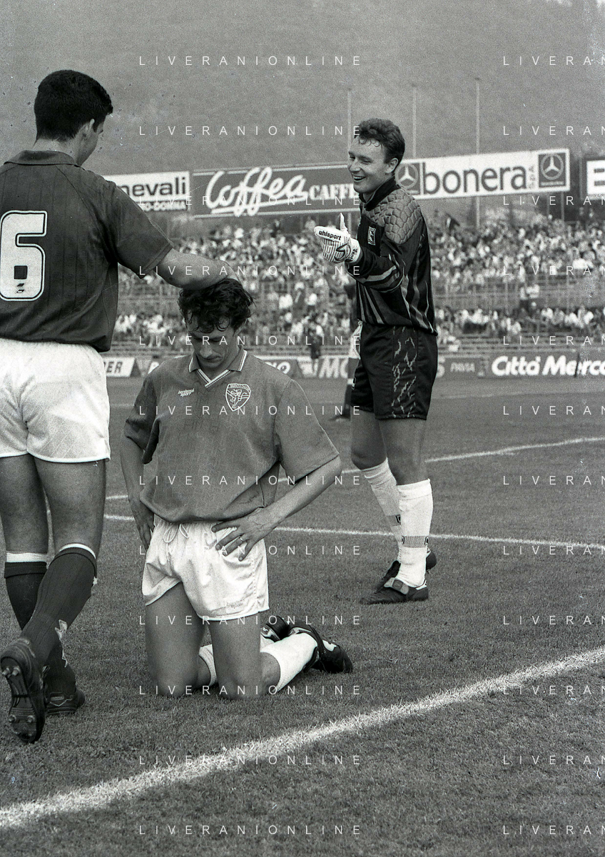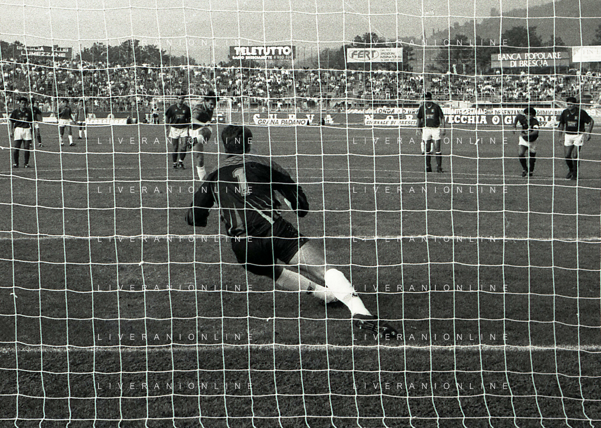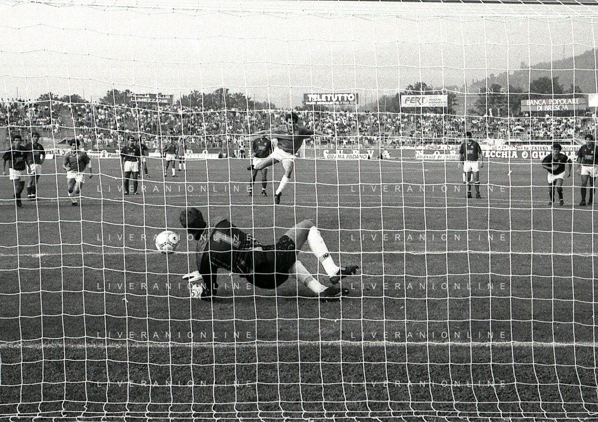 16-09-1990 BRESCIA CAMPIONATO DI CALCIO SERIE B BRESCIA -SALERNITANA 1-2 NELLA FOTO MASSIMO BATTARA E MAURIZIO GANZ DOPO IL RIGORE PARATO AG ALDO LIVERANI SAS