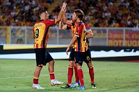 TVEM August 31, 2024 Lecce, Italy - US Lecce vs Cagliari - Italian soccer serie A 2024/25 - Via Del Mare Stadium. In the pic: Nikola Krstovic, Antonino Gallo and Federico Baschirotto of US Lecce celebrates the victory ©Emanuele Mastrodonato / AGENZIA ALDO LIVERANI SAS