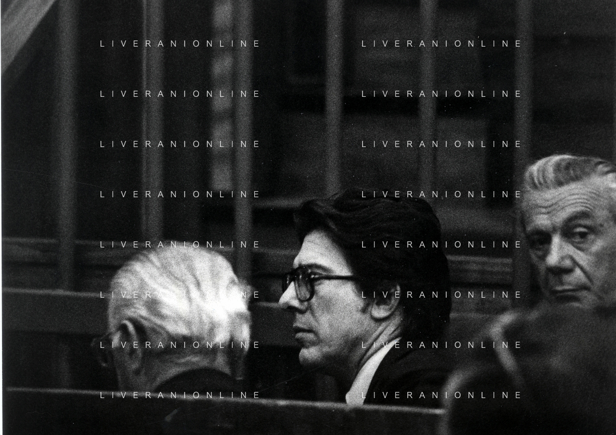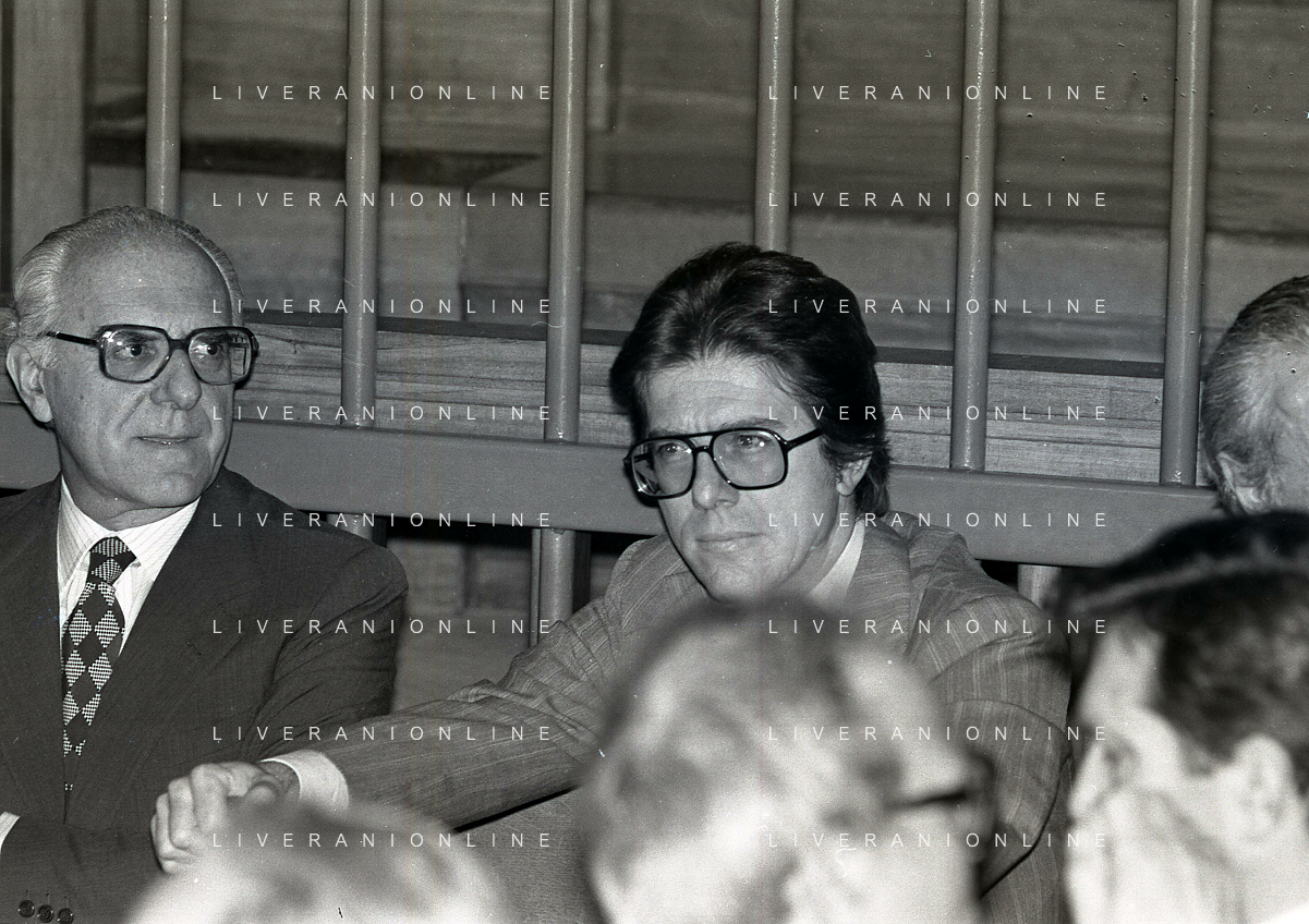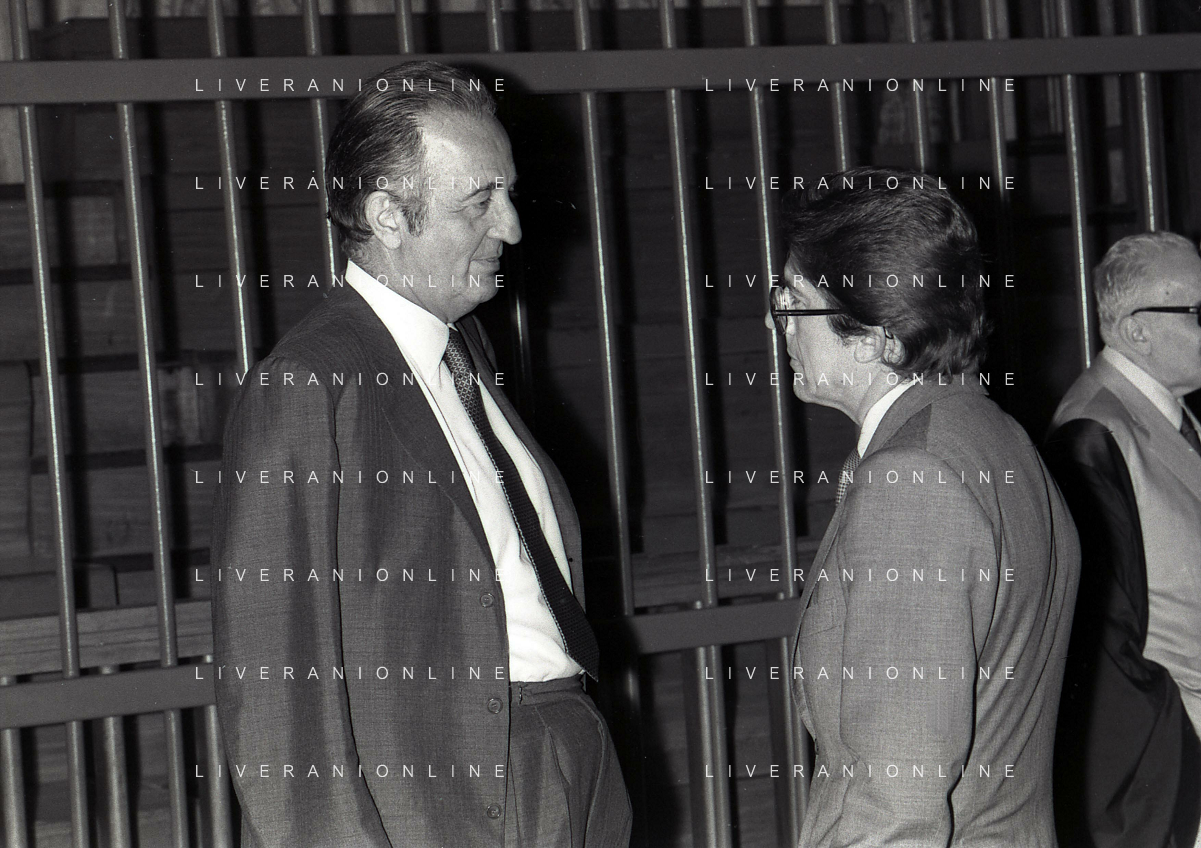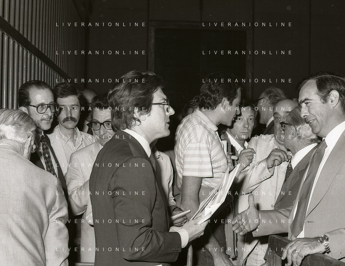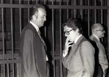 RETROSPETTICA CARLO BONOMI INDUSTRIALE NELLA FOTO CARLO BONOMI IN TRIBUNALE A MILANO PER IL CRAC DEL BANCO AMBROSIANO NELL'ANNO 1980 CON MARIO VALERI MANERA AG ALDO LIVERANI SAS