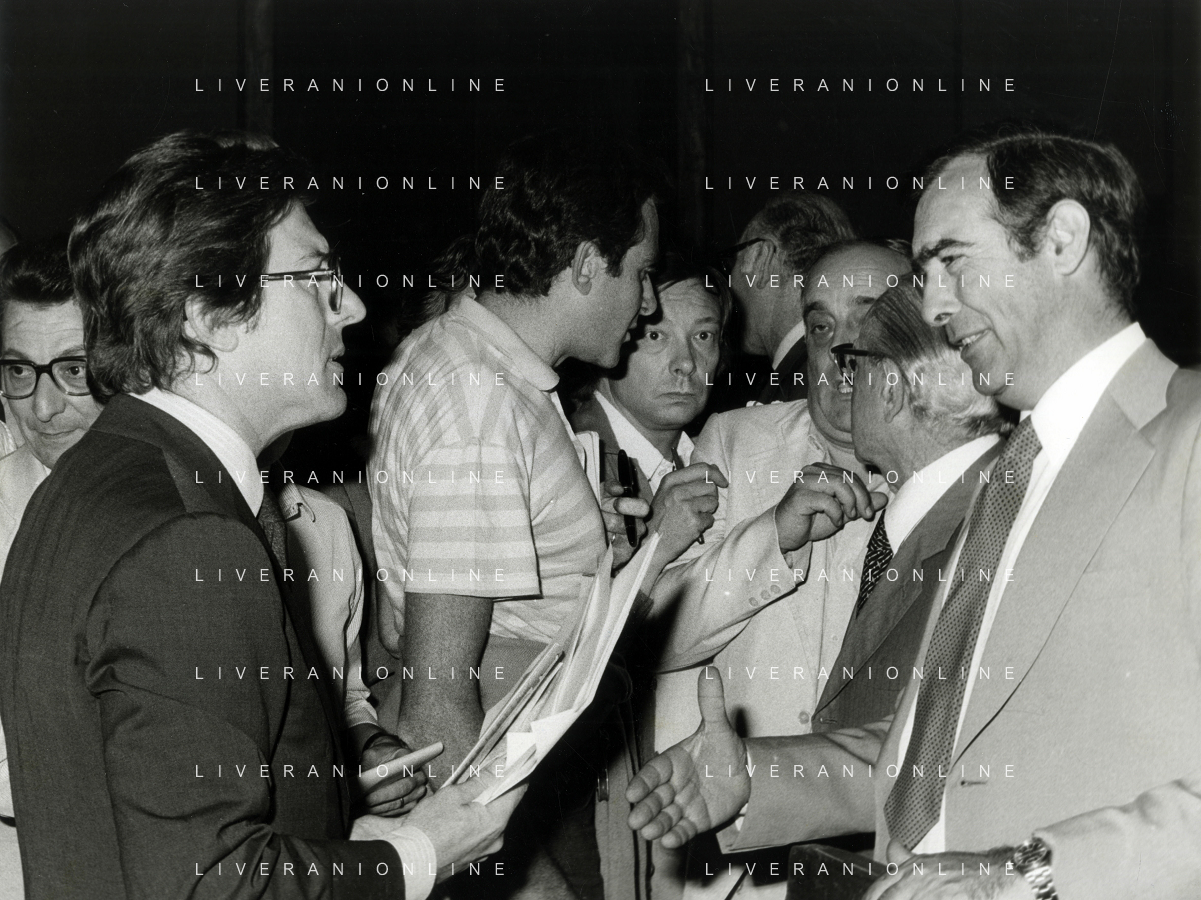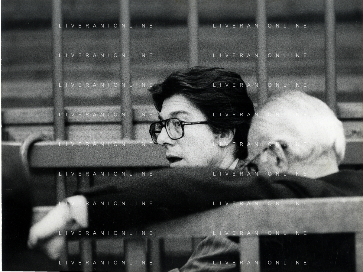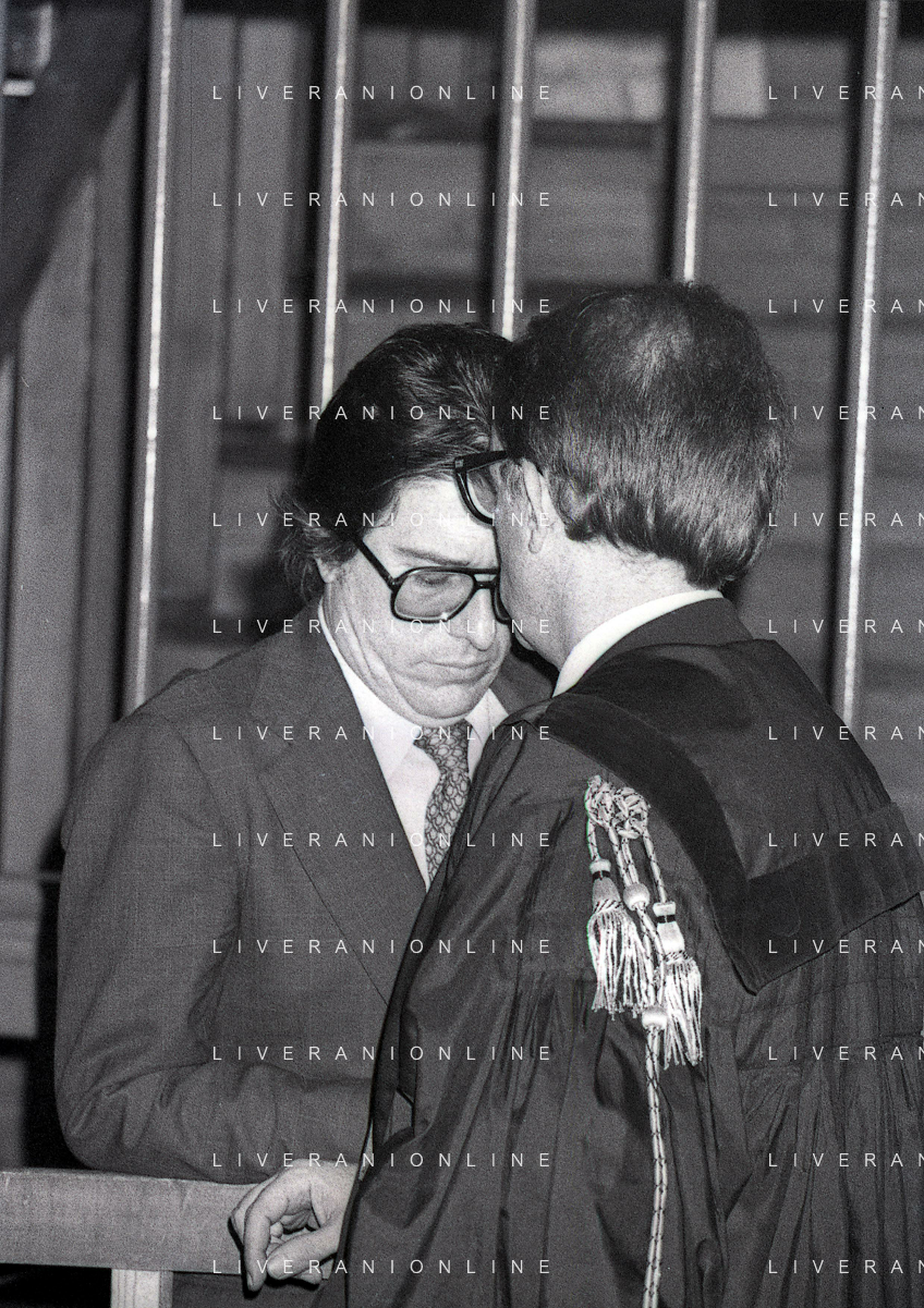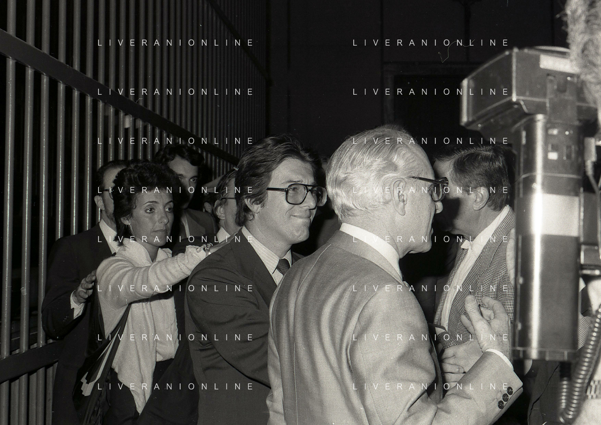 RETROSPETTICA CARLO BONOMI INDUSTRIALE NELLA FOTO CARLO BONOMI IN TRIBUNALE A MILANO PER IL CRAC DEL BANCO AMBROSIANO NELL'ANNO 1980 CON MARIO VALERI MANERA AG ALDO LIVERANI SAS