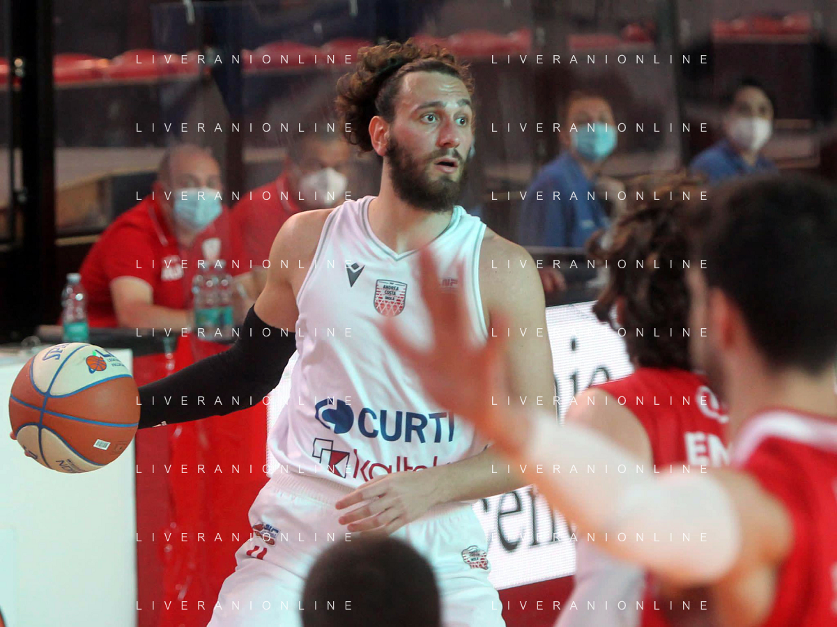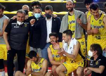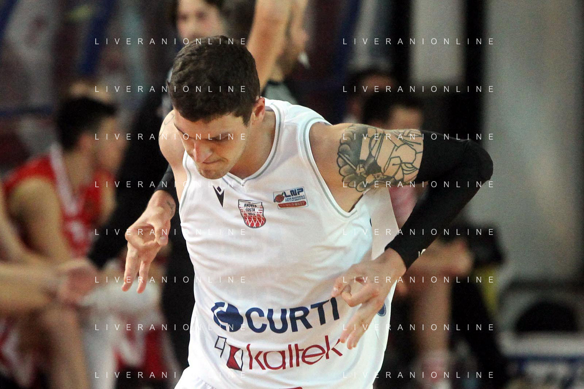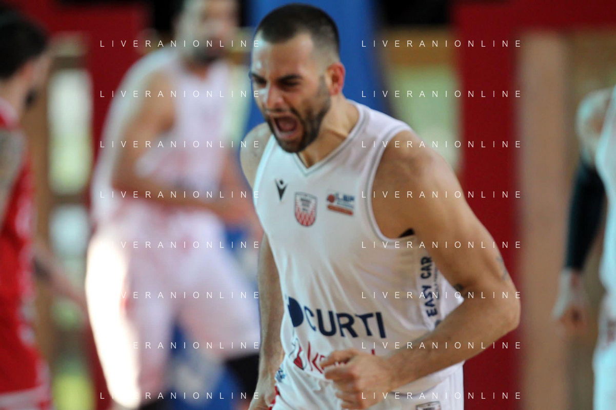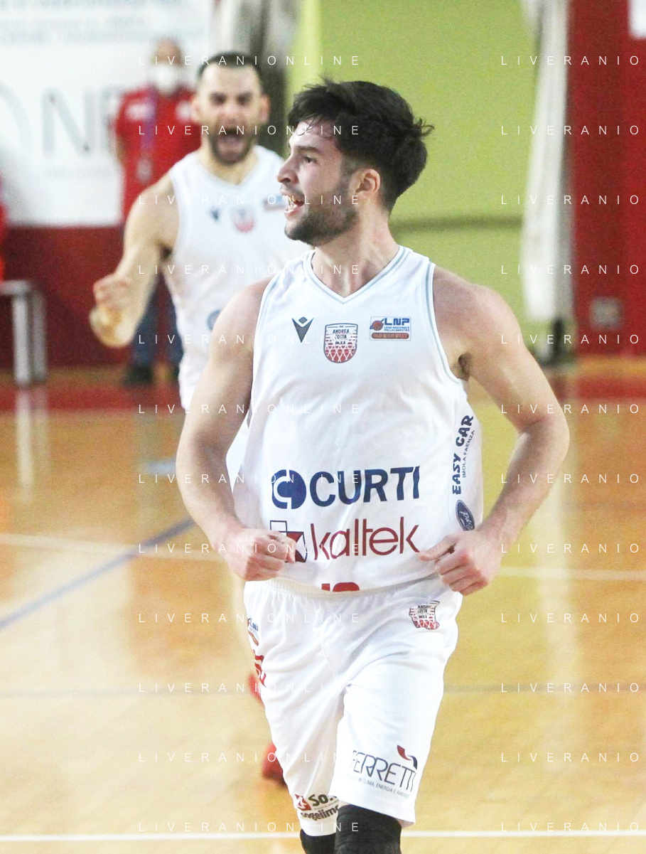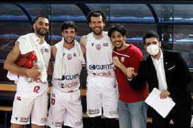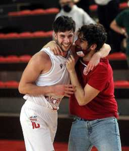 25-04-2021 Alessandro Bianchi esulta con i suoi compagni di squadra dell'Andea Costa Imola dopo il canestro della vittoria foto gianni sanna-ag aldo liverani sas