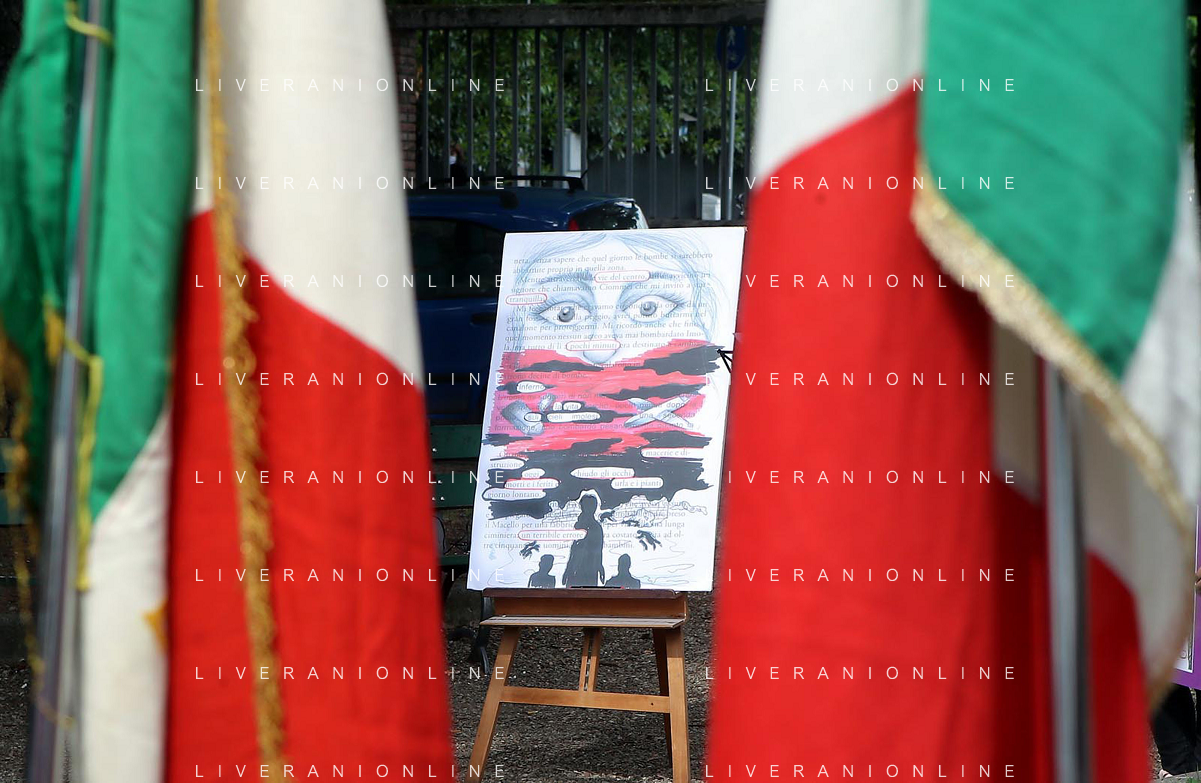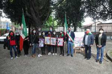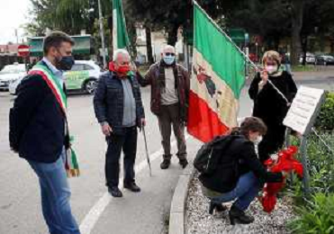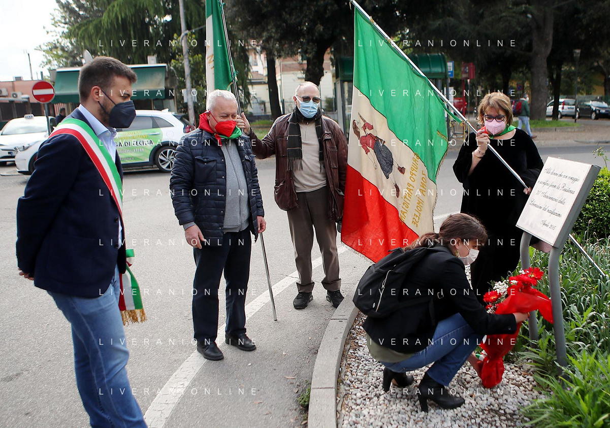 IMOLA 28 04 2021 STAZIONE FERROVIARIA LAPIDE ALLE PARTIGIANE UN MAZZO DI FIORI IN ONORE ALLE PARTIGIANE DEPOSITATO DA ASSESSORE ELISA SPADA PRESENZA DI SINDACO MARCO PANIERI E GABRIO SALIERI ANPI