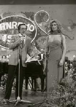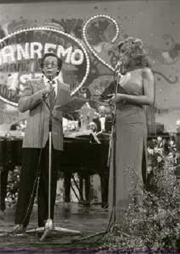 RETROSPETTIVA MIKE BONGIORNO CONDUTTORE TELEVISIVO E RADIOFONICO NELLA FOTO MIKE BONGIORNO AL FESTIVAL DI SANREMO CON ANNA MARIA RIZZOLI NELL'ANNO 1979 AG ALDO LIVERANI SAS