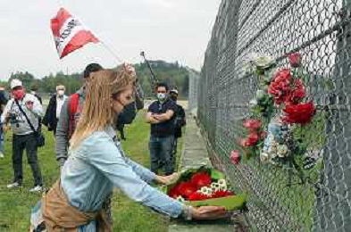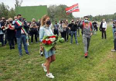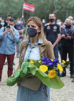 IMOLA 01 05 2021 AUTODROMO ENZO E DINO FERRARI COMMEMORAZIONE A RICORDO DI AYRTON SENNA CHE E' MORTO IL 01 05 1994 E IN RICORDO DI ROLAND RATZENBERGER DECEDUTO IL GIORNO PRIMA ALLA CURVA TOSA NELLA FOTO ASSESSORE ELENA PENAZZI DEPONE UN MAZZO DI FIORI NEL PUNTO DELL'INCIDENTE MORTALE DI ROLAND RATZENBERGER FOTO GIANNI SANNA-AG ALDO LIVERANI SAS
