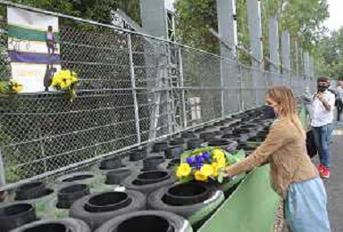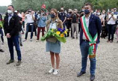 IMOLA 01 05 2021 AUTODROMO ENZO E DINO FERRARI COMMEMORAZIONE A RICORDO DI AYRTON SENNA CHE E' MORTO IL 01 05 1994 E IN RICORDO DI ROLAND RATZENBERGER DECEDUTO IL GIORNO PRIMA ALLA CURVA TOSA NELLA FOTO ASSESSORE ELENA PENAZZI DEPONE UN MAZZO DI FIORI NEL PUNTO DELL'INCIDENTE MORTALE DI AYRTON SENNA FOTO GIANNI SANNA-AG ALDO LIVERANI SAS