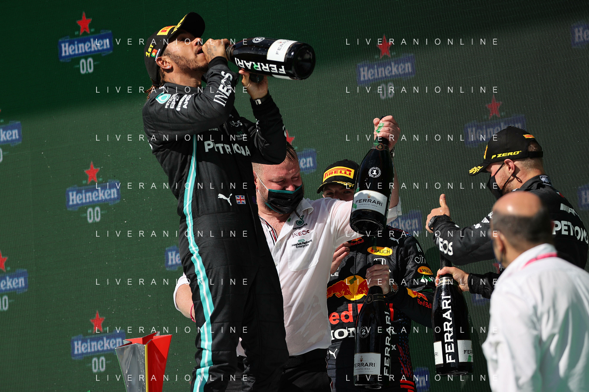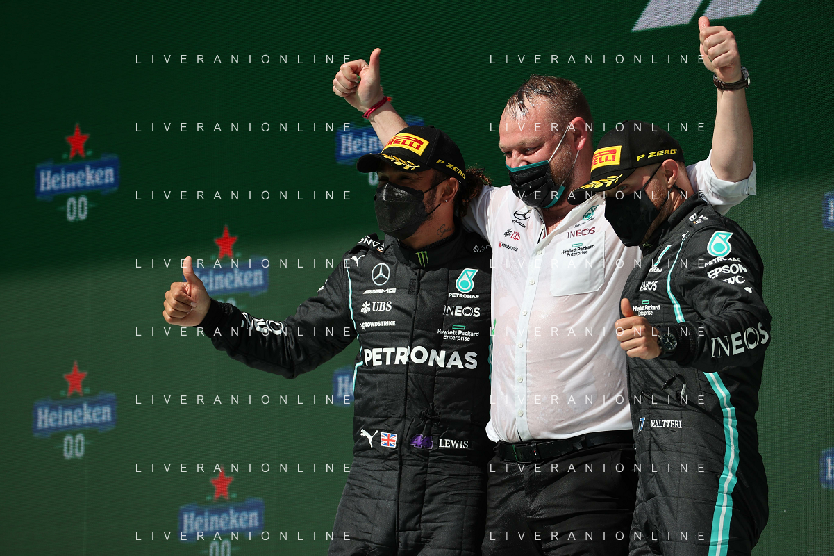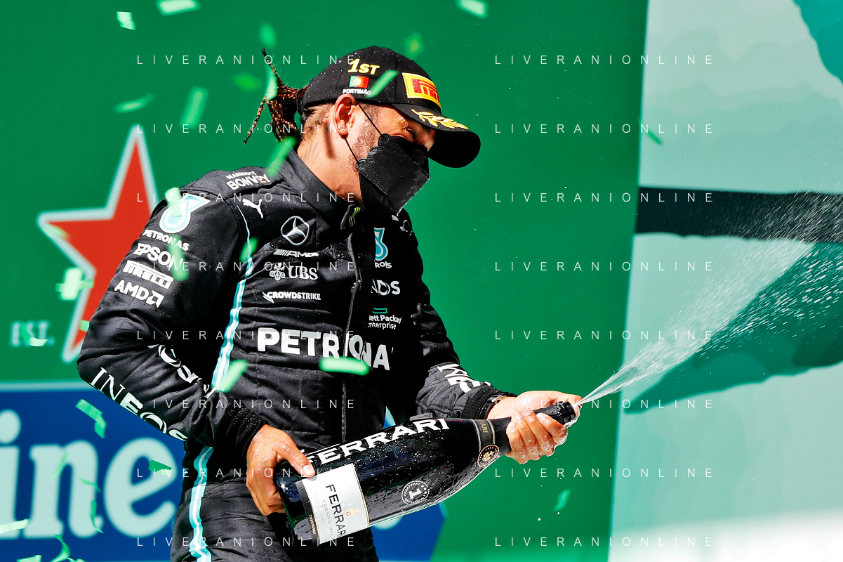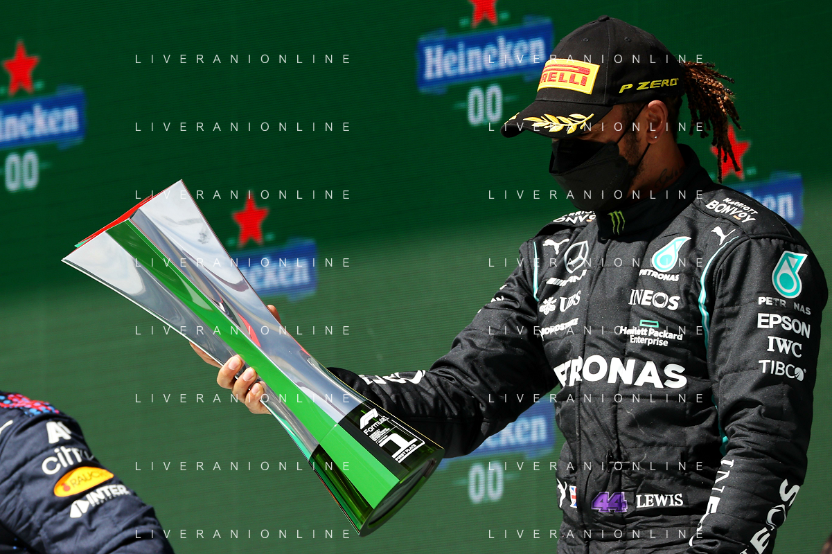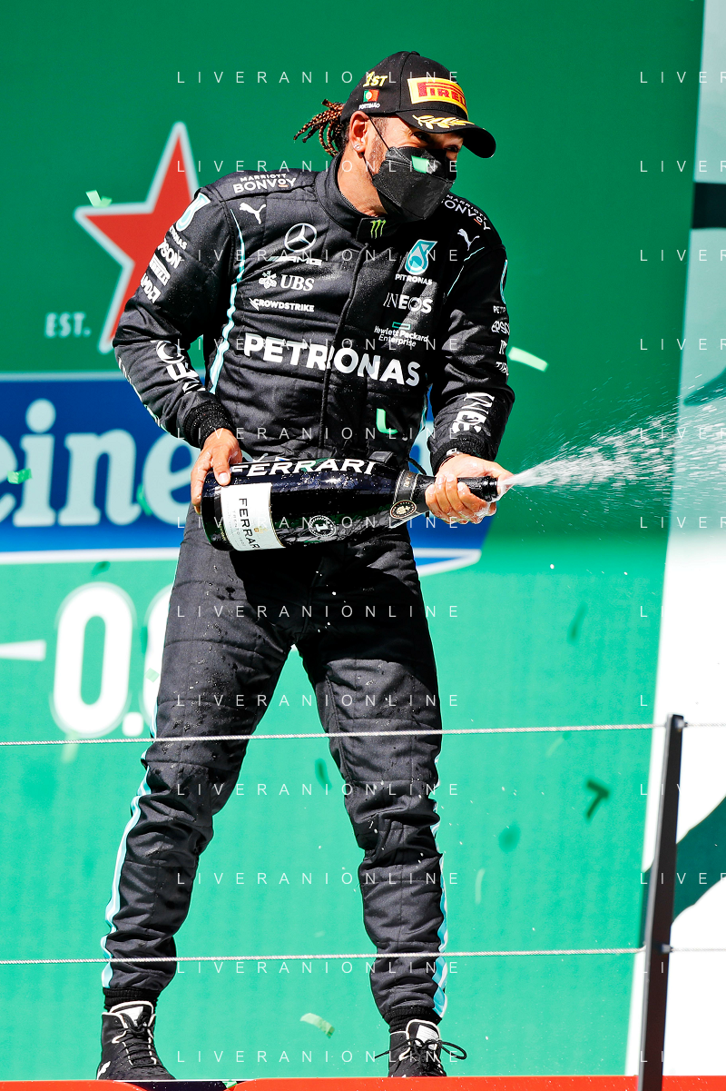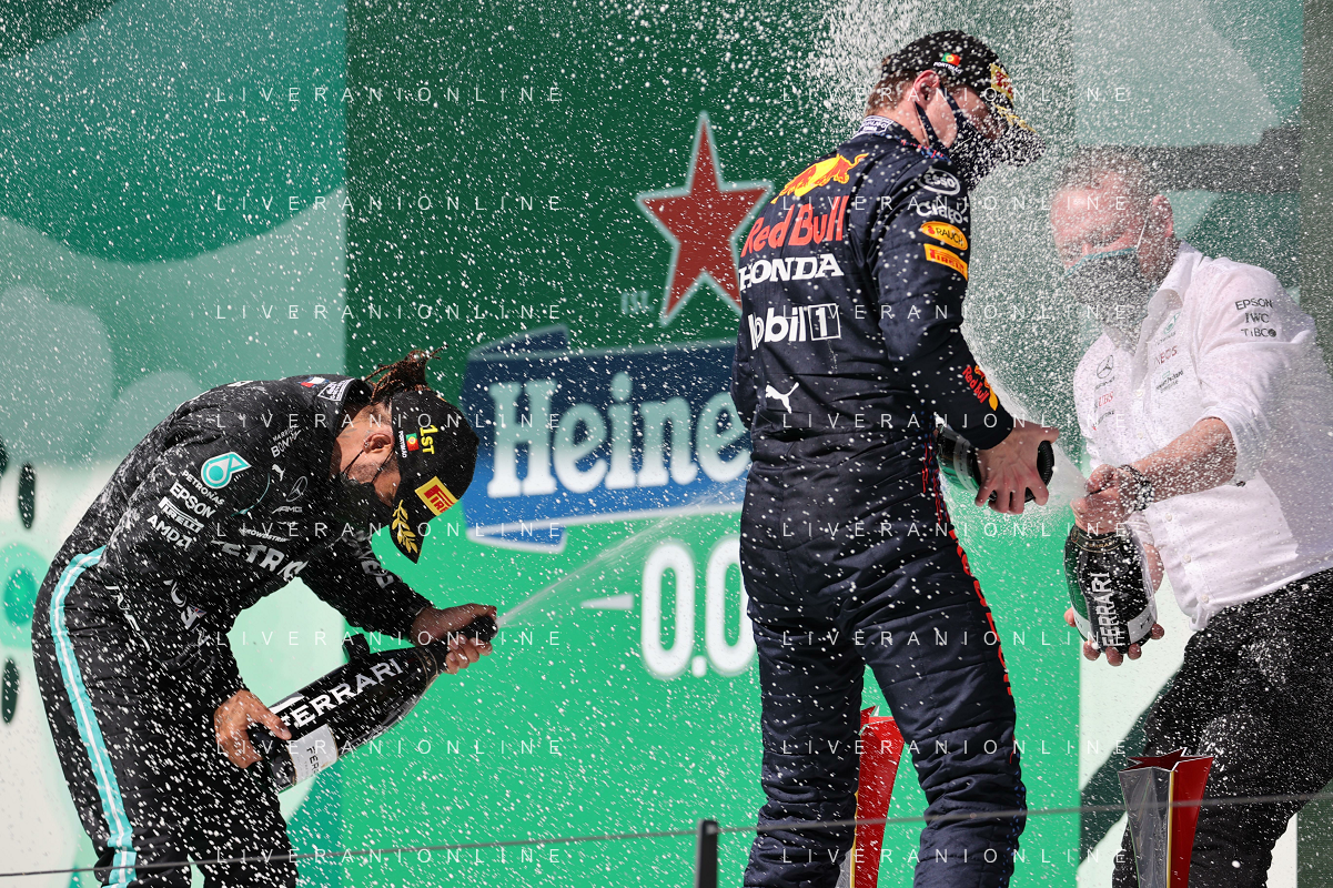 1st place Lewis Hamilton (GBR) Mercedes AMG F1, 2nd place Max Verstappen (NLD) Red Bull Racing and 3rd place Valtteri Bottas (FIN) Mercedes AMG F1. 02.05.2021. Formula 1 World Championship, Rd 3, Portuguese Grand Prix, Portimao, Portugal, Race Day. - www.xpbimages.com, EMail: requests@xpbimages.com © Copyright: Batchelor / XPB Images/ AGENZIA ALDO LIVERANI SAS - ITALY ONLY EDITORIAL USE ONLY - GP F1 World Championship Portogallo Grand Prix, Portimao 02.05.2021
