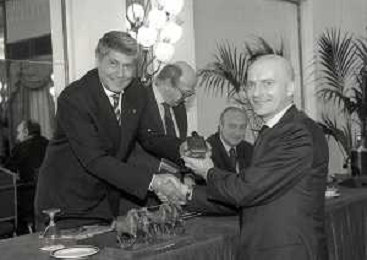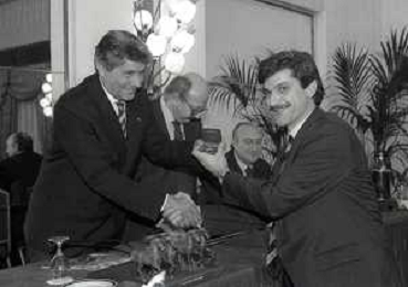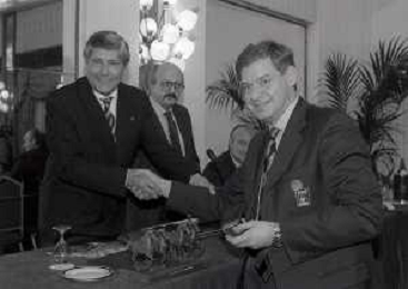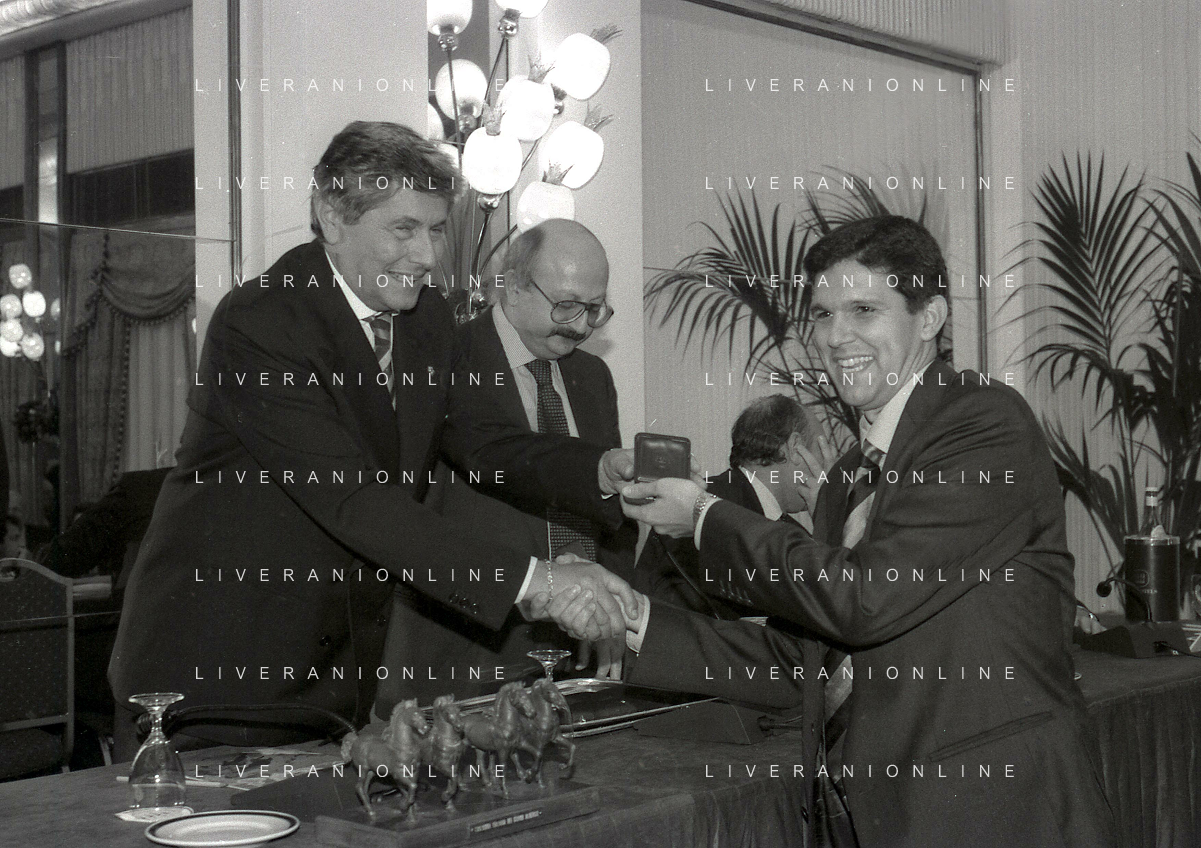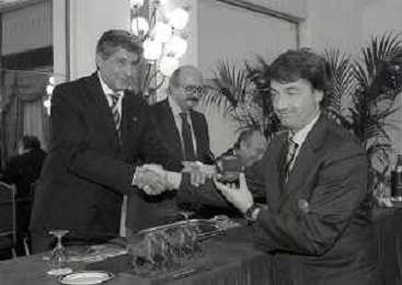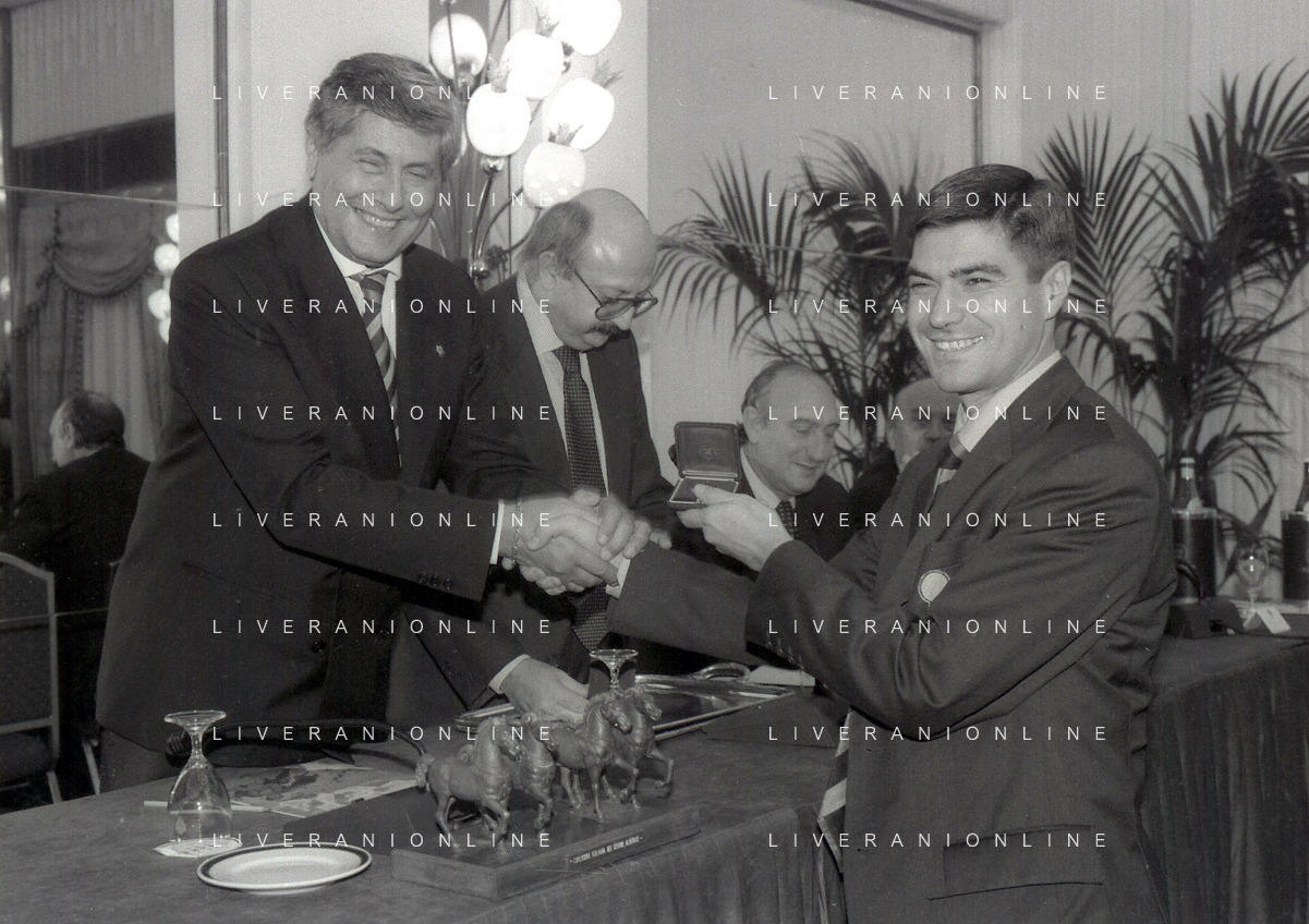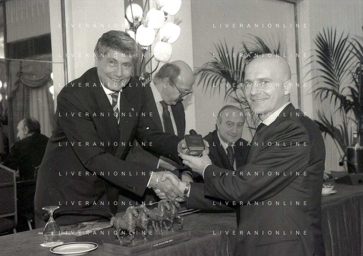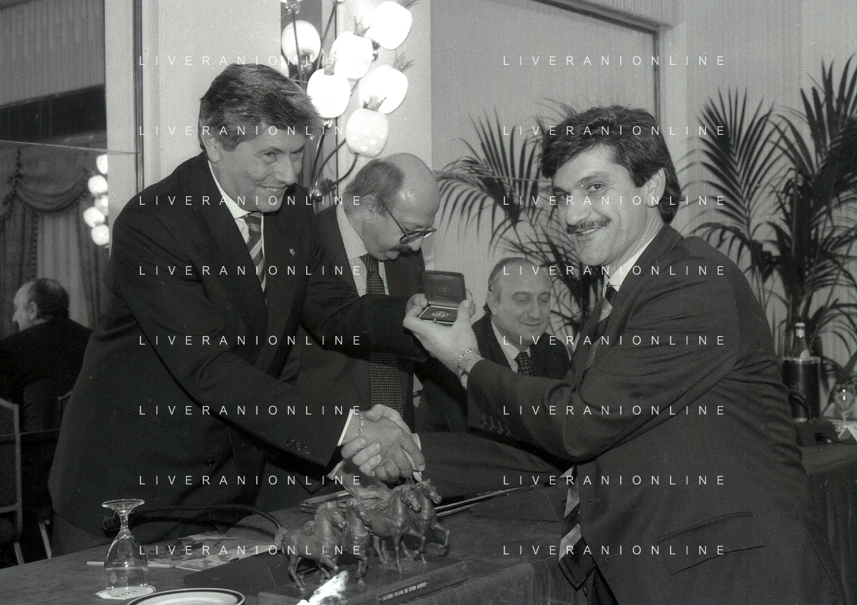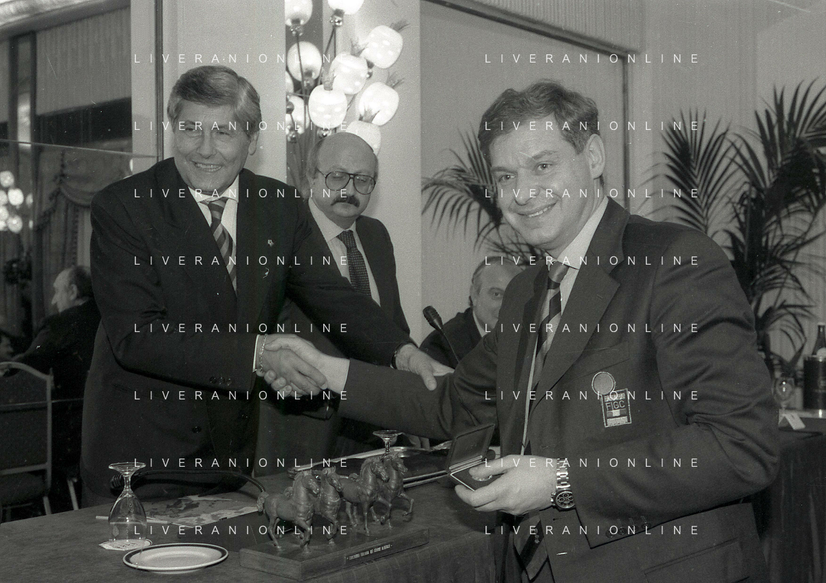 19-12-1996 MILANO HOTEL PPRINCIPE E SAVOIA FESTA NATALIZIA LEGA CALCIO NELLA FOTO LUCIANO NIZZOLA PREMIA L'ARBITRO DIEGO PRESCHERN AG ALDO LIVERANI SAS